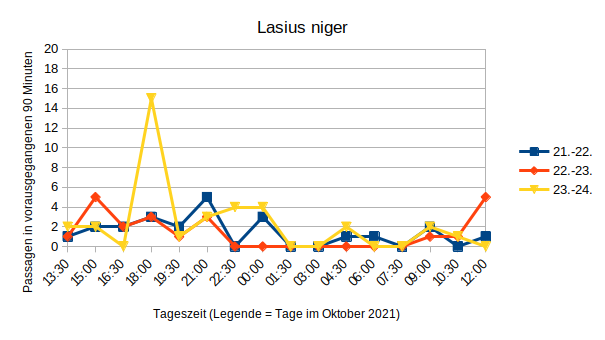 Mit meinen ZĂ€hlwerken habe ich aber festgestellt, dass doch schon ErkundungsaktivitĂ€t aus dem Nest heraus passiert. Die Myrmica Arbeiterinnen gehen hĂ€ufiger raus als die Lasius. (Das war anders bei eine nur-Arbeiter-Gruppe Lasius, die ich im Sommer unter einem Stein im Garten gesammelt hatte.) Wenn man oft genug abliest, kann man die Verteilung der AktivitĂ€t ĂŒber den Tag erkennen. Und es gibt aktivere und weniger aktive Tage â noch habe ich nicht heraus, wodurch das gesteuert wird.
