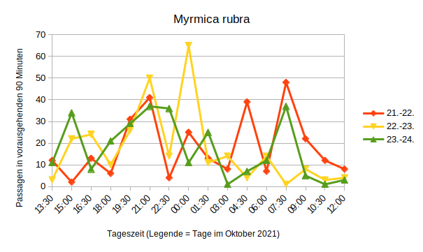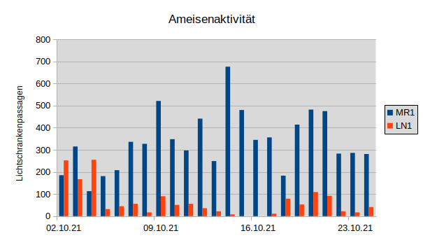 Winterruhe und das Aufwachen im FrĂŒhjahr darstellen. Die Nester stehen auf dem kalten Dachboden. Das kleine Myrmica-Gipsnest habe ich in eine Schachtel mit Sand eingebettet, weil es sonst sehr schnell austrocknet. Da kann ich also gar nicht mehr ohne weiteres reingucken und freue mich, dass die ZĂ€hlungen zeigen: sie sind wohlauf. Die angehĂ€ngten Diagramme zeigen einige ZĂ€hlwerte. MR1 ist die Myrmica-rubra-Kolonie, LN1 ist die Lasius-niger-Kolonie.