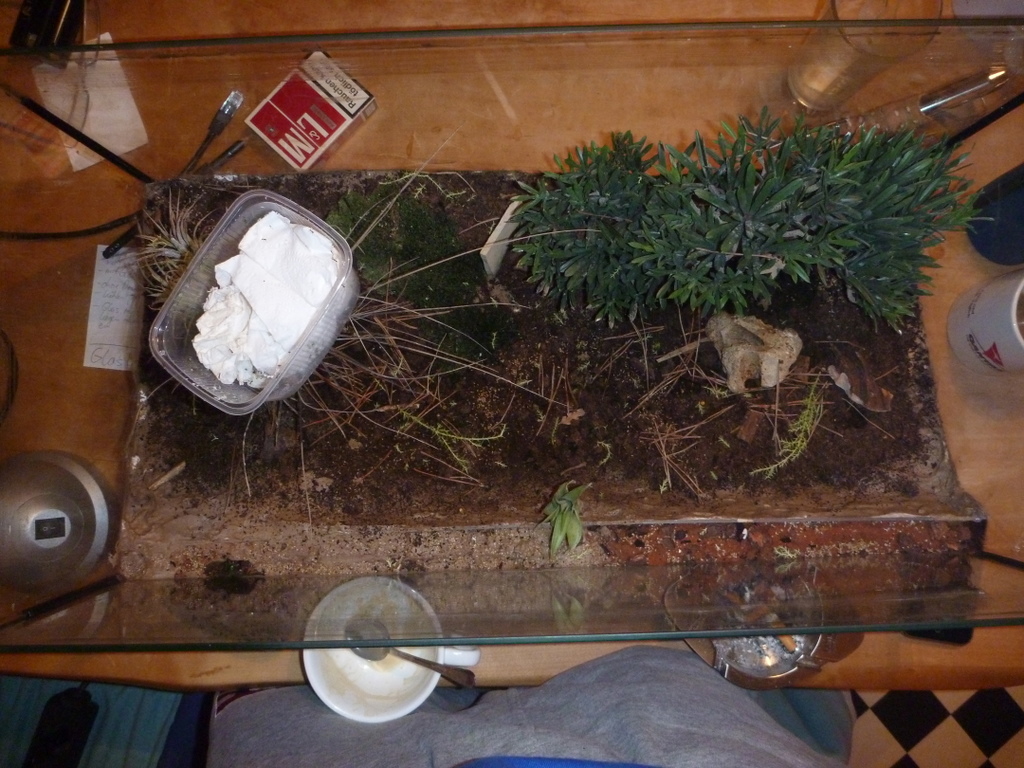 Das zweite Bild zeigt das Terrarium von vorne links. die gesamte Front ist als Nestbereich gedacht, hier sollen sich die Ameisen eingraben. der hintere Teil des Nestes ist mit Erde/Moos/Lehm/Reisig etc und etlichen Grassamen ausgelegt.