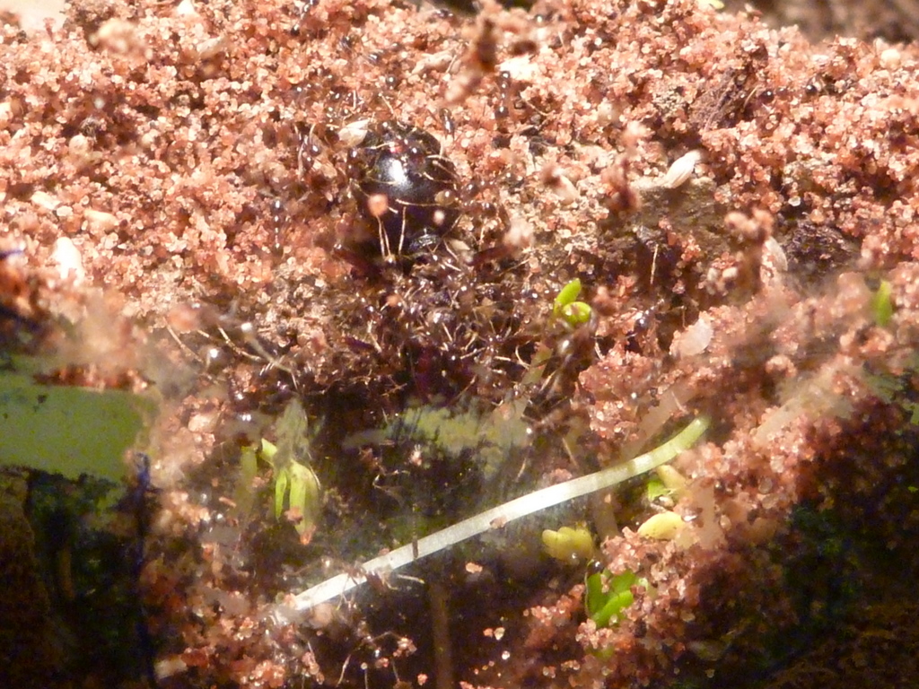 Das erste Bild zeigt das Terrarium von oben. links hinten sieht man die kleine PLastikkiste, in der die Pheidologeton angeliefert wurden. SChĂ€tzungsweise handelt es sich um etwa 200 Arbeiterinnen, etwa 3 etwas gröĂere SOldaten(7-10mm) unt etliche Zwischenformen.