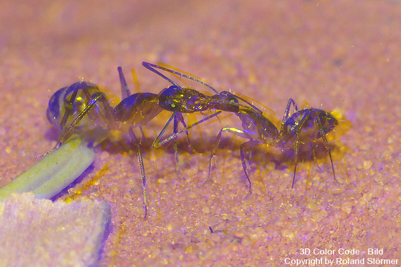 Bild 1 ist ein Rot/Cyan Anaglyph - dafür wird eine Rot(links)-Cyan(rechts) Brille benötigt.