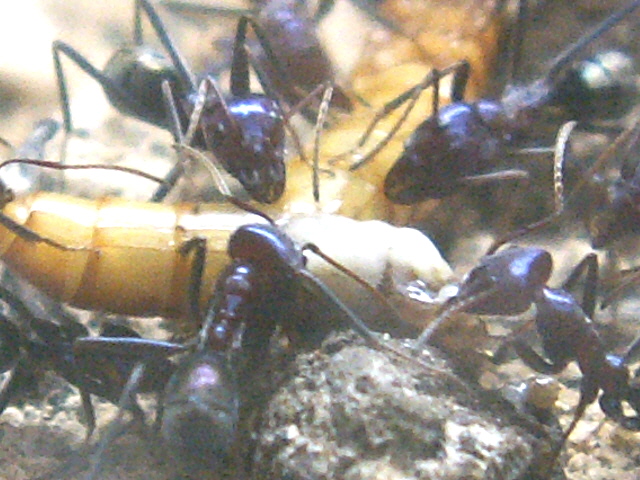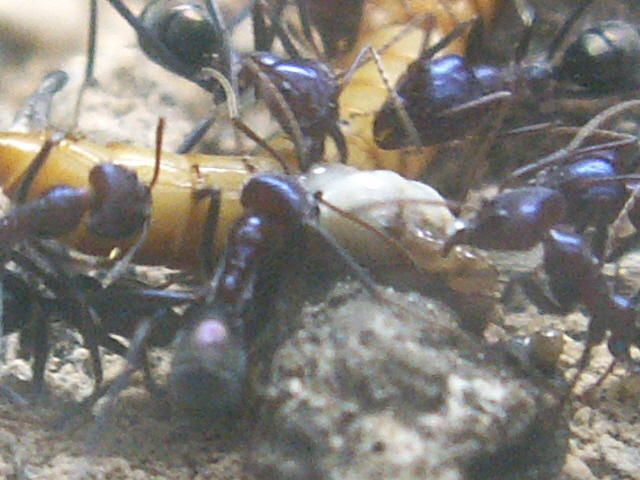 Die Iridomyrmex purpureus sind nicht wĂ€hlerisch, MehlwĂŒrmer werden gerne genommen.