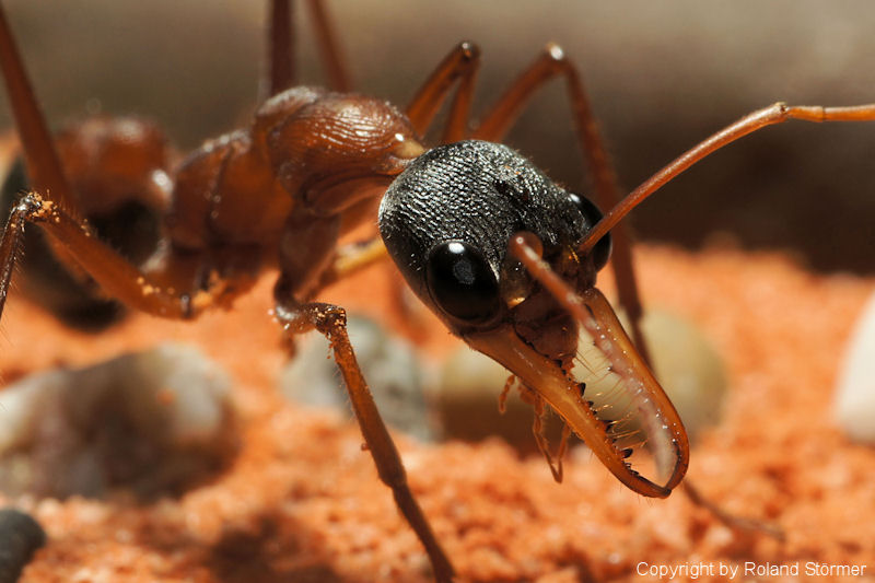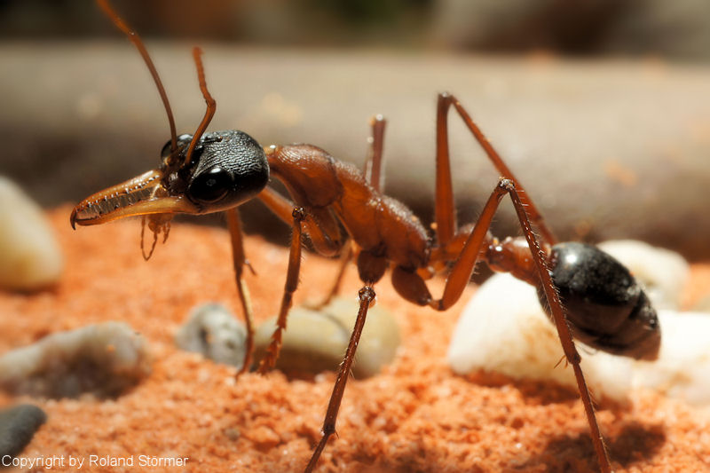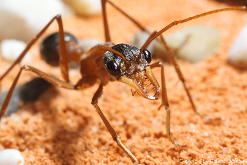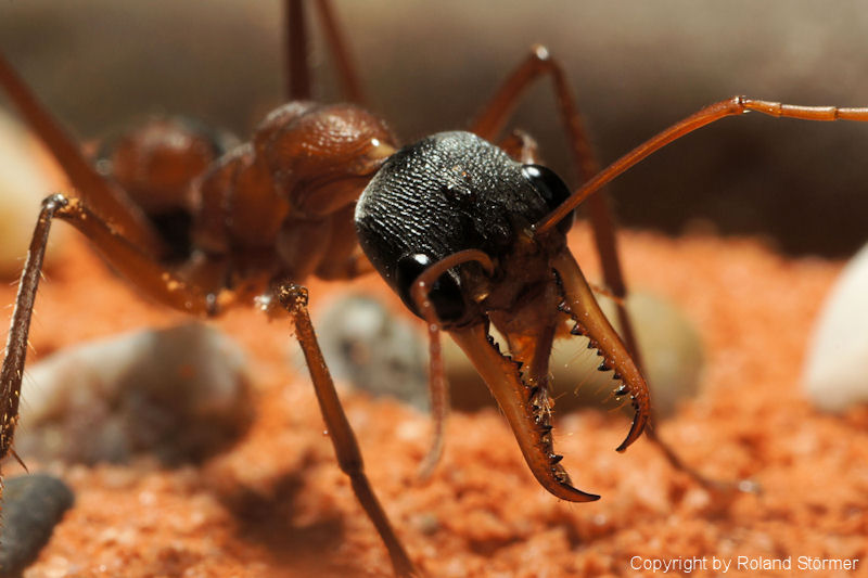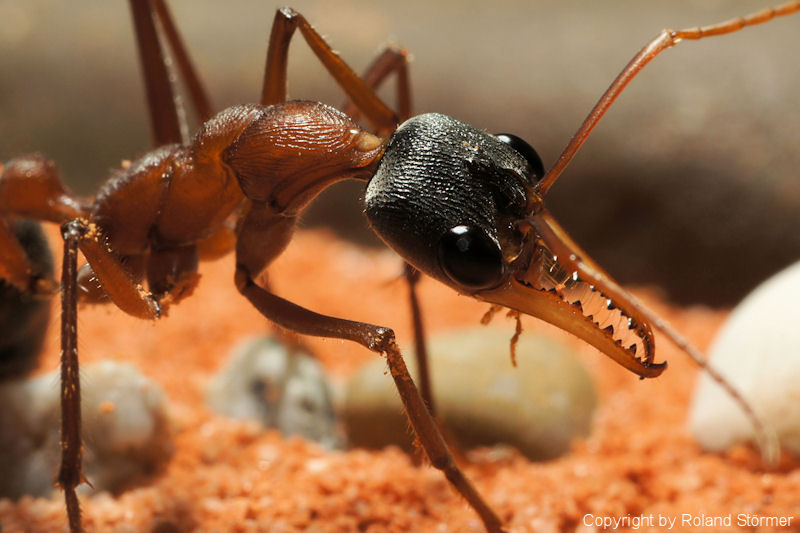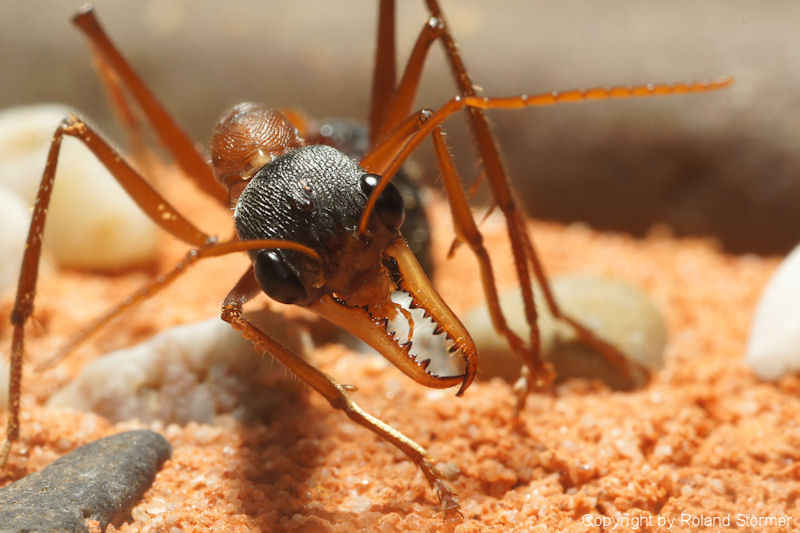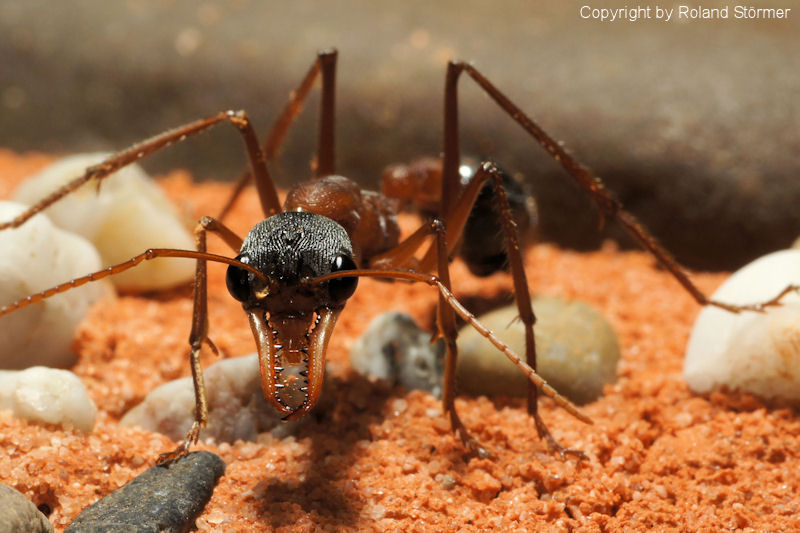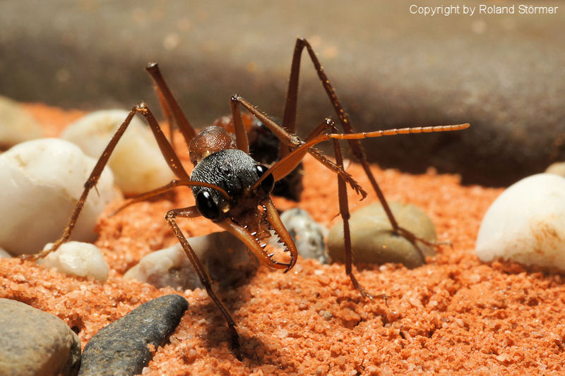 Diese auffällig gefärbte Myrmecia Art ist mit 35-40mm (Königin) bzw. 30mm (Arbeiterin) etwas größer als die Myrmecia pavida.