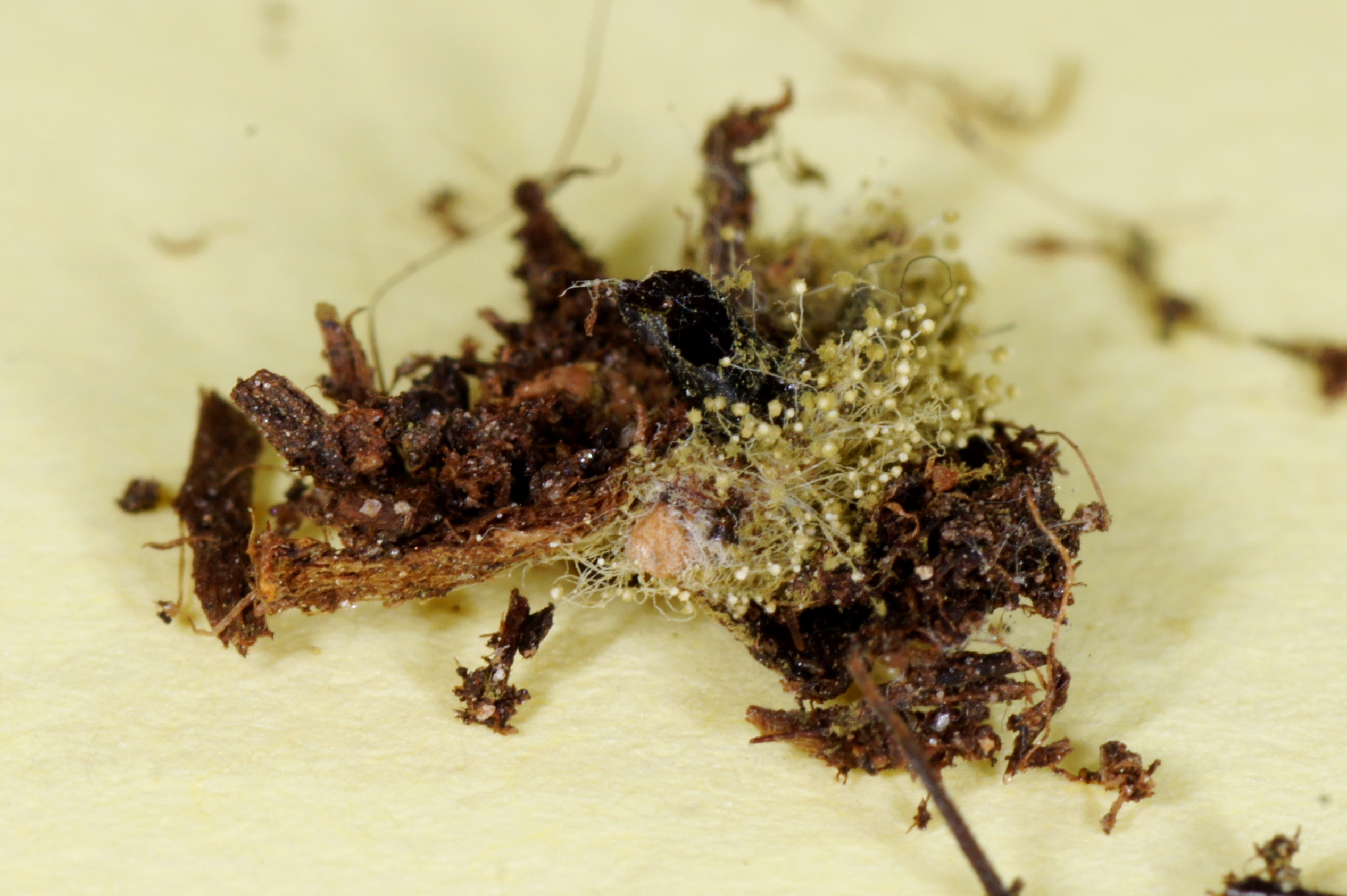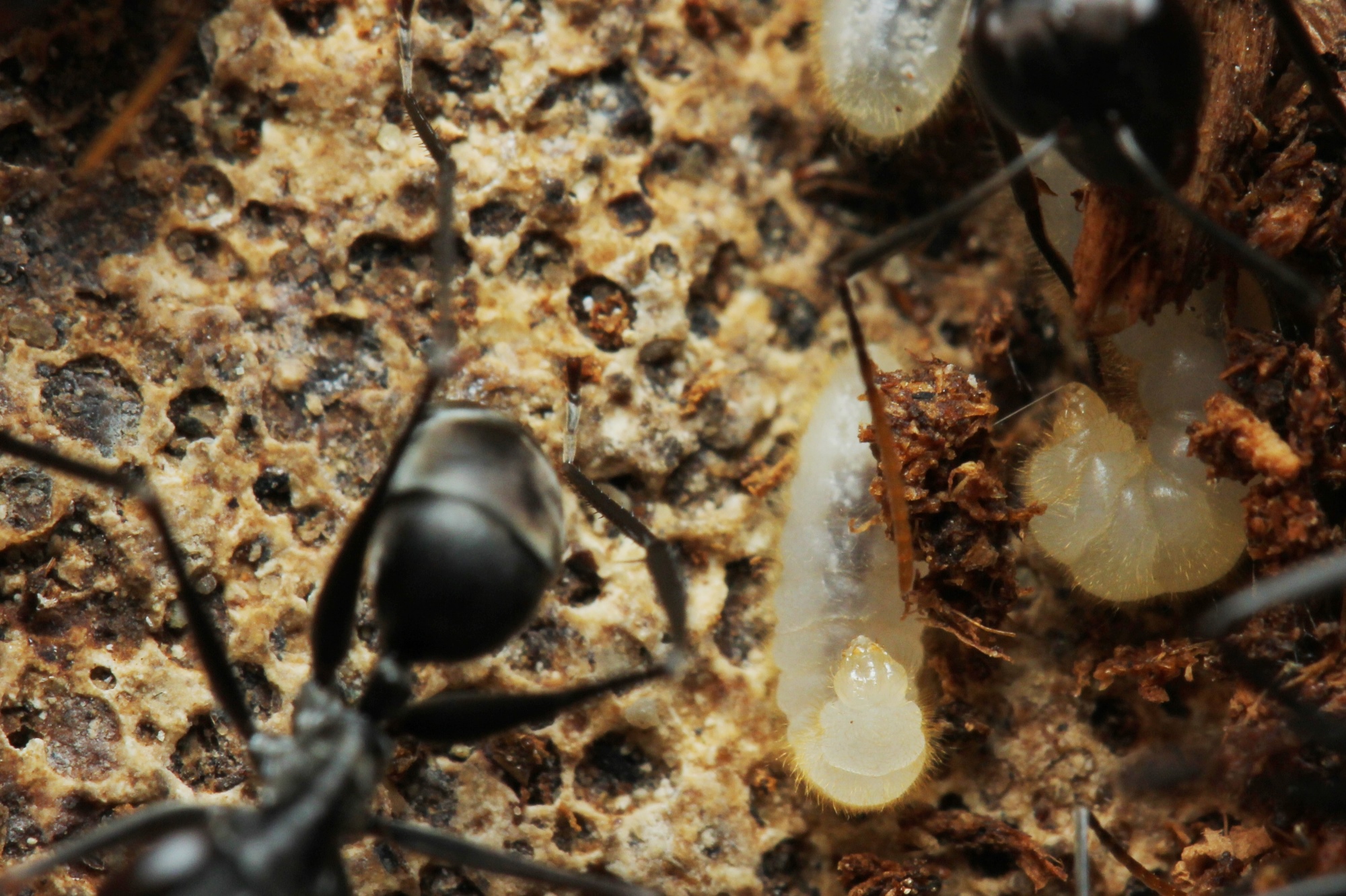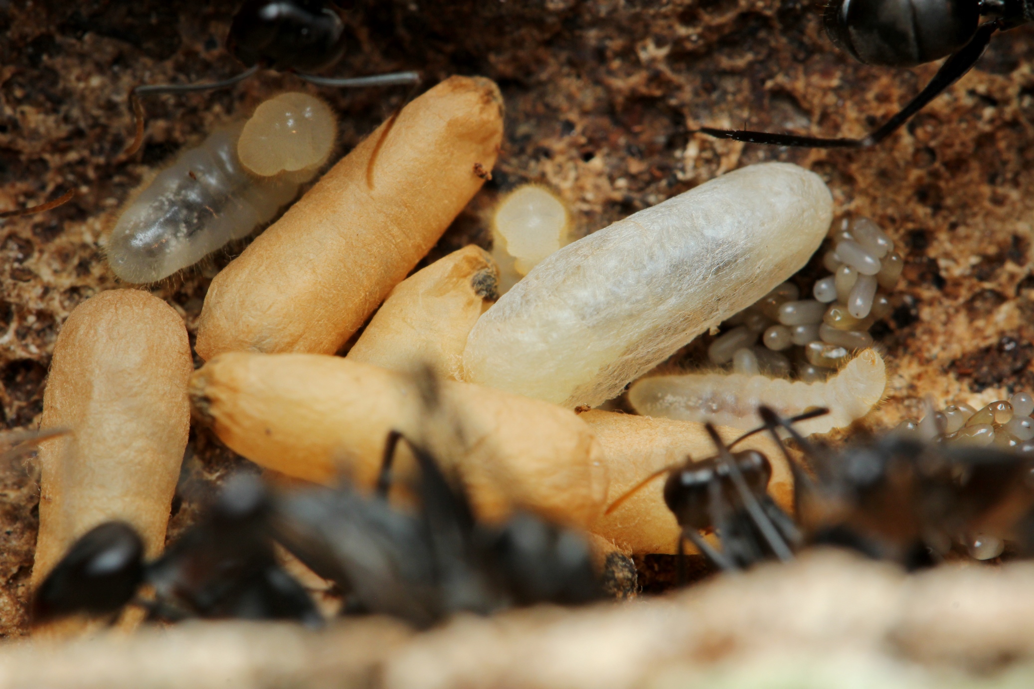 Larve spinnt sich ein. Erde und kleine HolzstĂŒckchen wurden v. Arbeiterinnen um sie angelegt. Wenn man genau schaut, erkennt man einen Spinnfaden, der von den