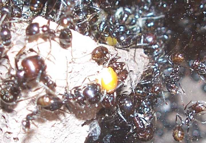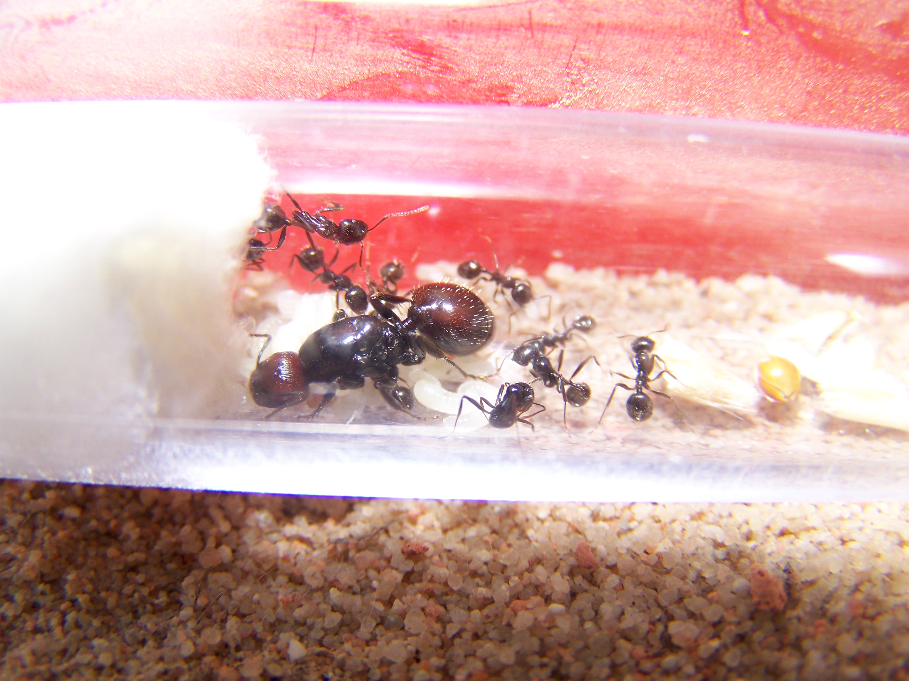 Zwei Bilder einer kleinen Messor barbarus Kolonie nach einem Zwangsauszug aus dem Reagenzglas. Es herrscht groĂe Ratlosigkeit, alles tragbare wurde in die Mitte der Tupperbox verfrachtet, darunter auch eine tote Arbeiterin. Schön zu beobachten war die absolute Agilheit der Königin , die es nicht scheut sich alleine auf Entdeckungstour zu begeben. Weitere Bilder werden in einigen Tagen oder Wochen folgen, sobald die neuen Arbeiter geschlĂŒpft sind.