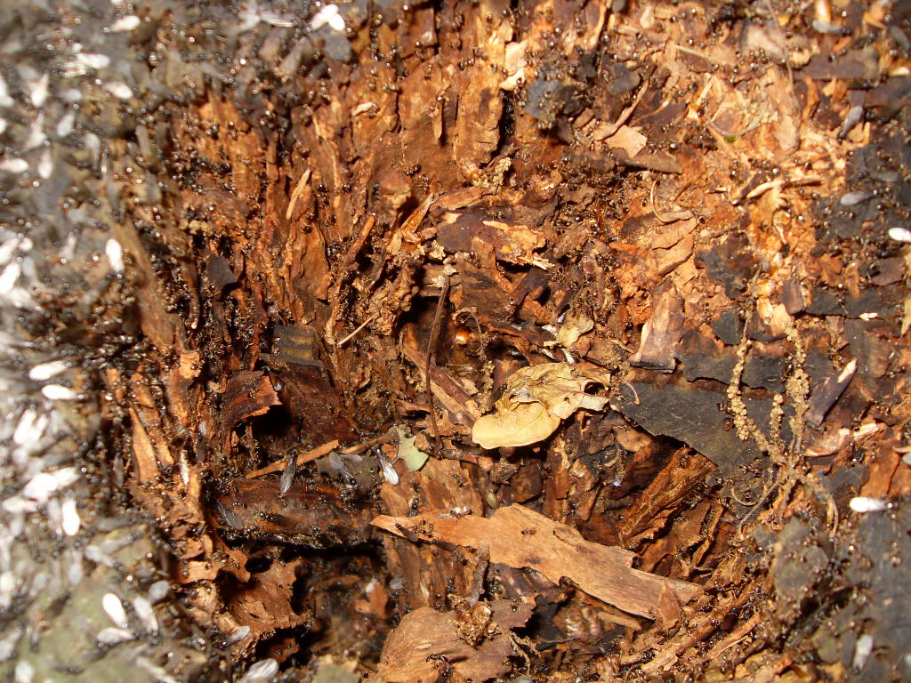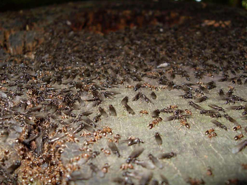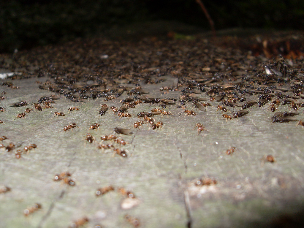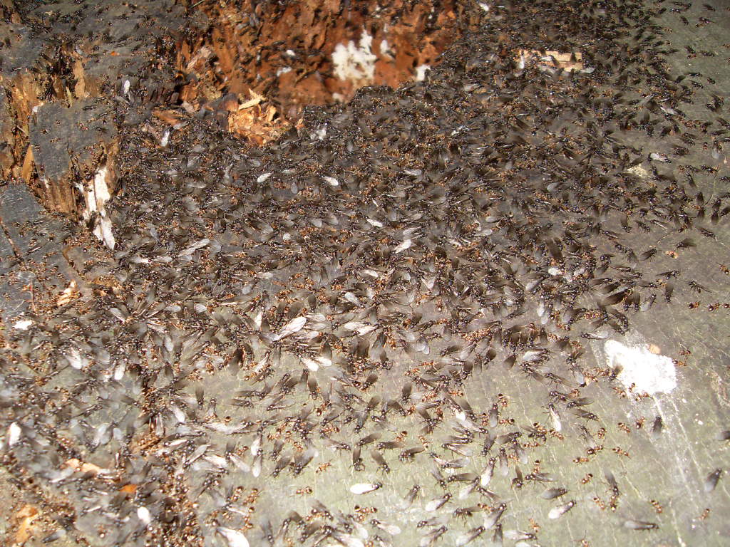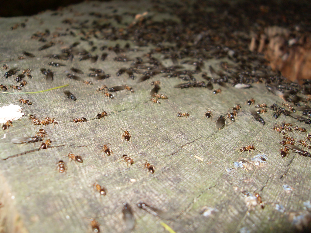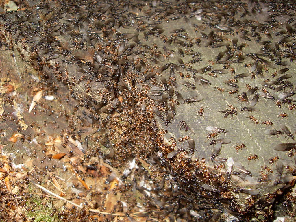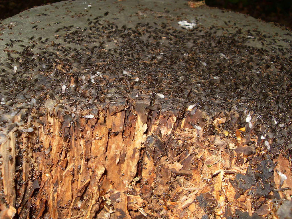 Bein ausĂĽben einer meinen Hobbys neben der Ameisenhaltung ist mir in der ferne ein Schillern auf einem Baumstumpf aufgefallen. Es stellte sich herraus das es die FlĂĽgel, von sehr vielen Geschlechtstieren war.