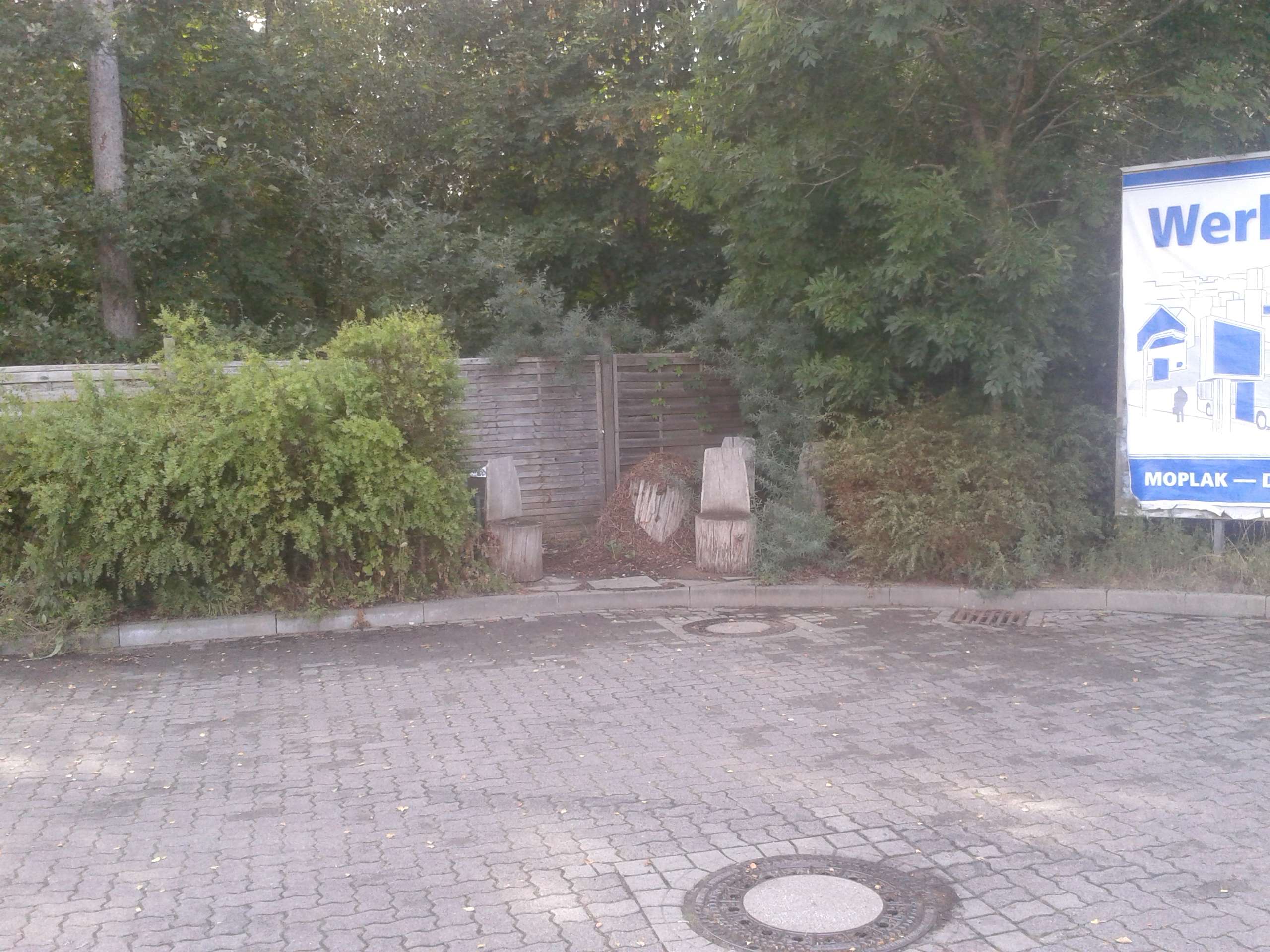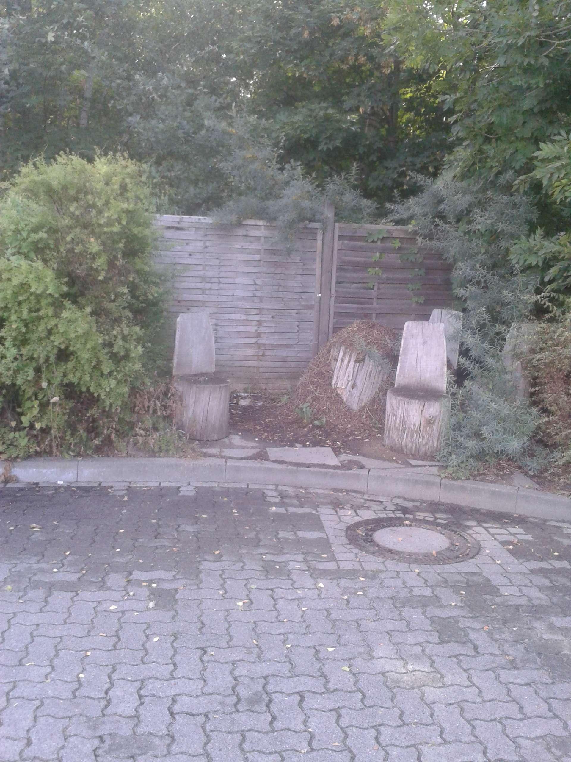 Da ist eine kleine Sitzecke, wo sich noch vor paar Jahren die Jugend getroffen hat. Der Ort an sich ist bekannt für seine unzähligen Ameisenhügel aber eigentlich leben sie einige Meter - 100m etwa - weiter im Wald. Der Wald wimmelt vor Nestern/Hügeln und ich glaube so viele Nester/Hügel passen auch gar nicht in einen Wald oder? Auf jeden Fall war der Tisch der Sitzecke schon total das Nest und die Ameisenstraße ging um die ganze Tankstelle auf den Bordstein.
