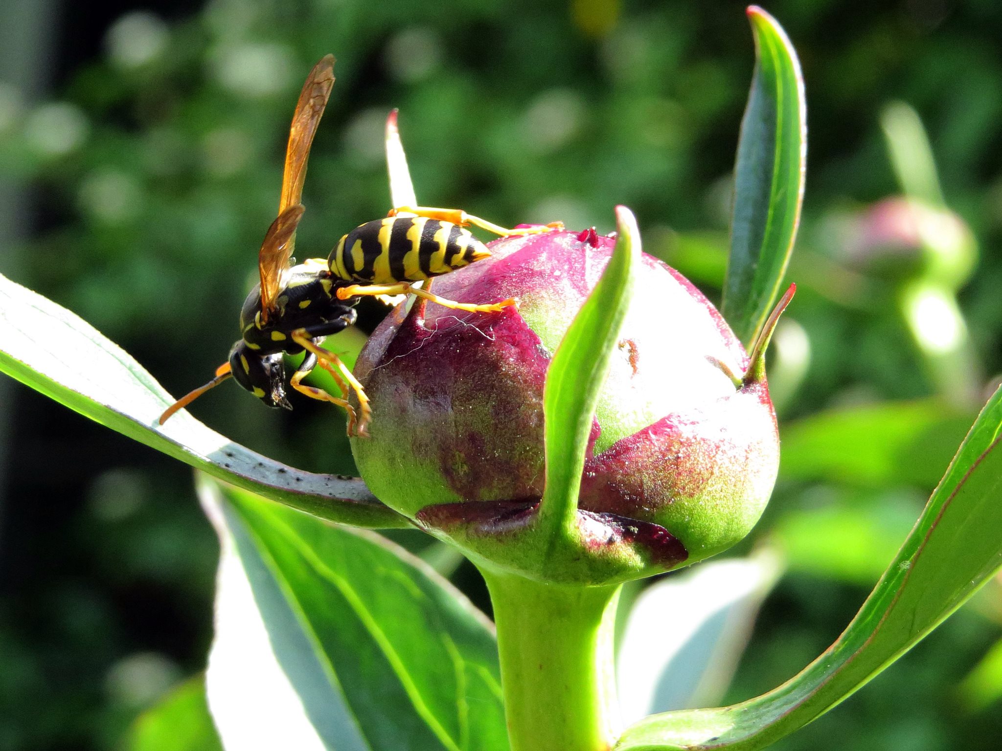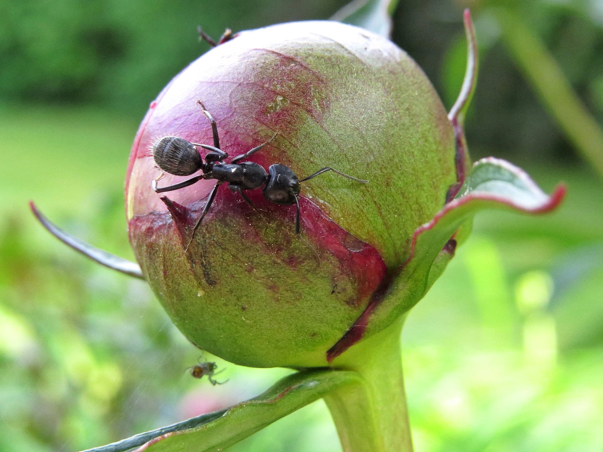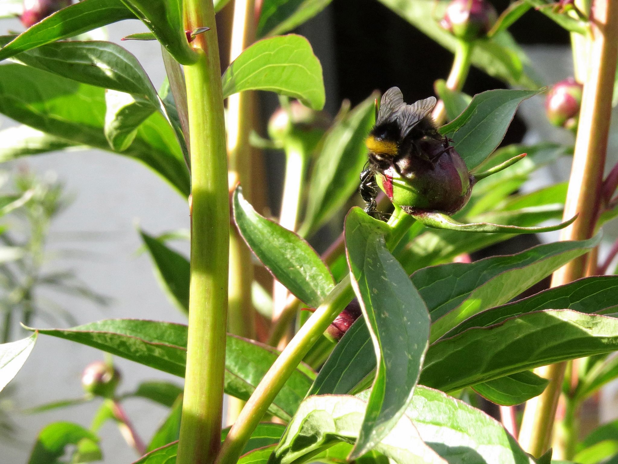 Seit heute besetzen sie jetzt auch beide Pfingstrosen und nehmen den Nektar von den Knopsen auf: