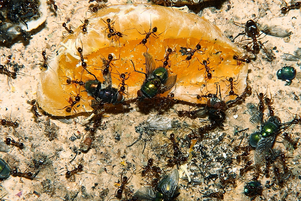 Ist mir hier nicht so richtig gelungen, aufzuzeigen, was abgeht, wenn diesen Ameisen richtig lebendiges Futter (Fliegen) angeboten wird.