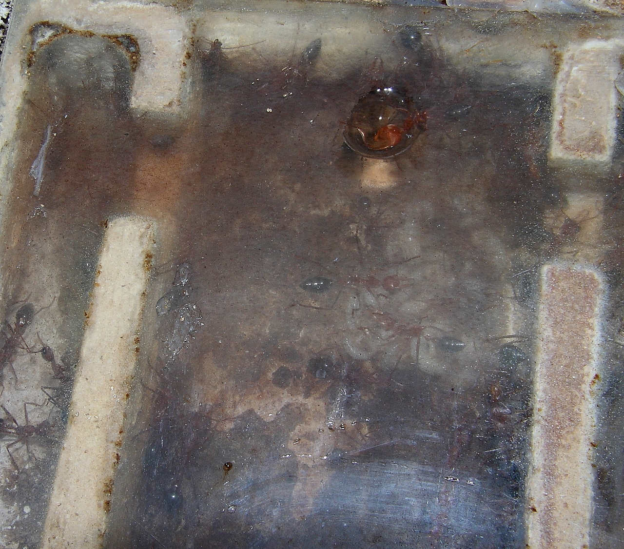 Dazu passend eine Beobachtung, auf die mich ein anderer Halter vor einiger Zeit aufmerksam gemacht hat: Messor reagieren extrem, wenn man es in ihrem Becken regnen lässt. Eine Erklärung wäre, dass sie als Bewohner trockener Gebiete jedwede Feuchtigkeit ausnutzen wollen. Betrachtet man es aber wieder aus dem Blickwinkel, dass für sie das gesamte Becken ein Teil des Nestes ist, erklärt sich die vermehrte Aktivität ganz anders: Gefahr durch Wassereinbruch ins Nest.