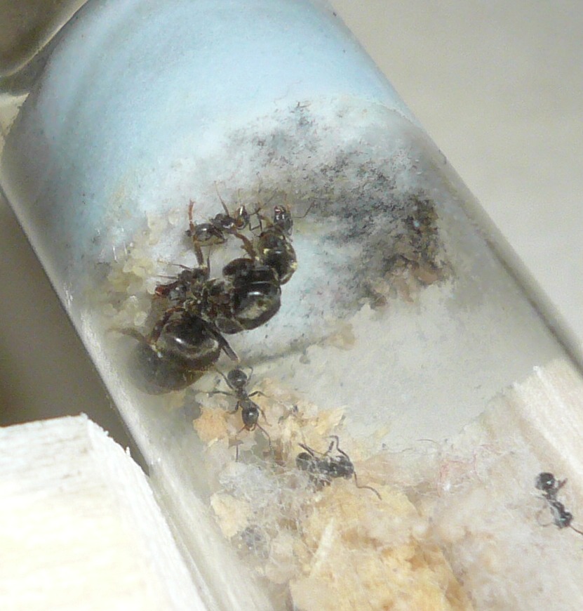 Die Camponotus herculeanus, die ich beim letzten Update gefangen hatte, grĂŒndete prĂ€chtig, immerhin hatte ich ihr schön viel Zeit und Ruhe gelassen. Zu viel Zeit und Ruhe, wie es scheint, denn als ich nach privatem Stress endlich wieder nach meinerKönigin sehen wollte, saĂ diese mit einer lebenden und mehreren Toten sowie sehr wenig Brut da. Ich hĂ€tte wohl doch frĂŒher mit FĂŒttern anfangen sollen, wirklich sehr Ă€rgerlich. Mal sehen, ob aus den beiden noch was gröĂeres wird ^^