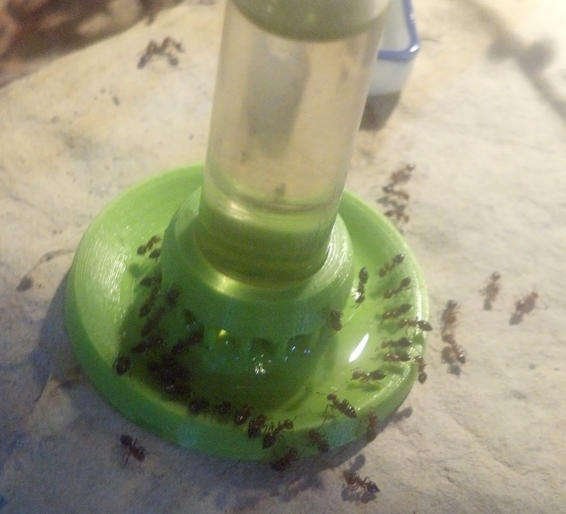 Die Camponotus lateralis sind wirklich aktiv und es lĂ€uft alles sehr gut, aber es kommt mir so vor, als wĂŒrden sie nicht zu viele werden wollen, denn sie versuchen mit allen Mitteln, sich irgendwie zu ertrĂ€nken. Egal, ob ich Kiesel, Watte oder SchwĂ€mme vor die TrĂ€nke tu, sie finden einen Weg durch und in den Freitod. Selbst ein Tropfen Zuckerwasser an der Scheibe wird um eine Tote erweitert.