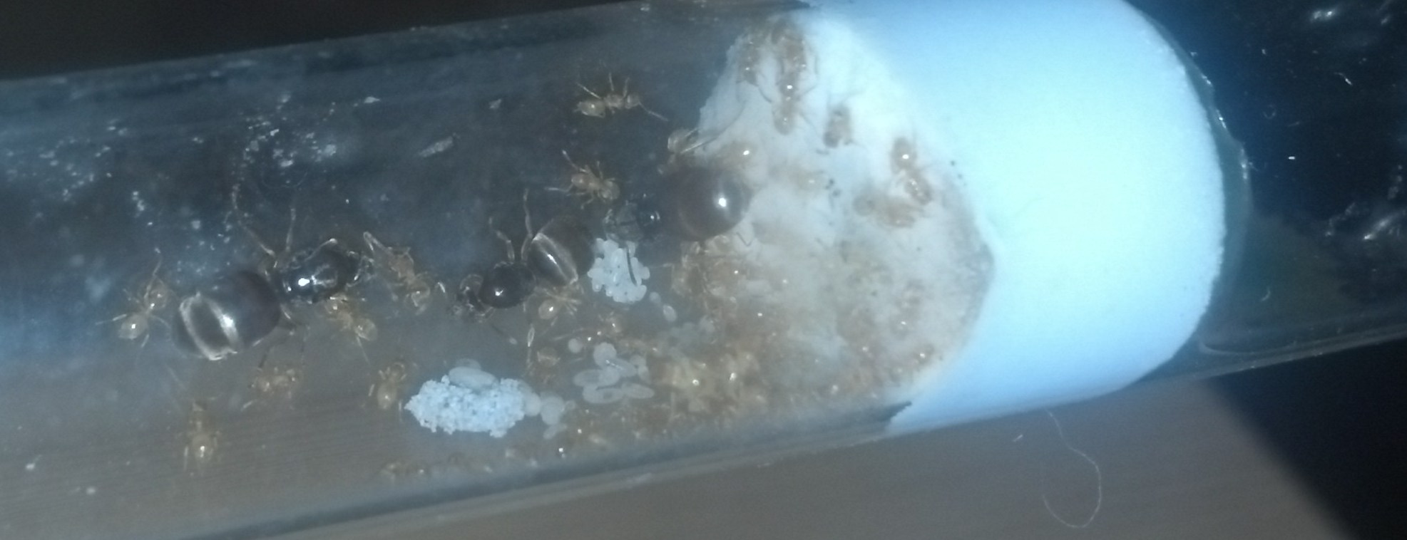 Die Camponotus lateralis sehen den Schlauch, der Arena und Nest verbindet, offenbar auch als Nest an, sie lagern gerne ihreBrut drin und haben den Schlaucheingang in der Arena verengt. Bilder habe ich keine brauchbaren, sorry!