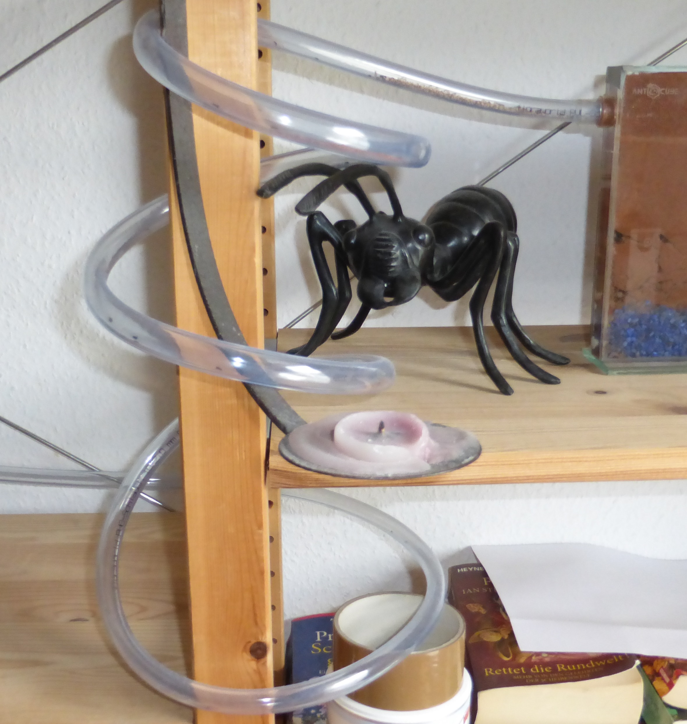 Der Schlauch zwischen altem Nest (Erde im Glas) und Arena wurde das Zuhause einer weiteren Arbeiterinnengruppe. Ich weiß nicht mehr, ob das letztes Mal auch schon so war.