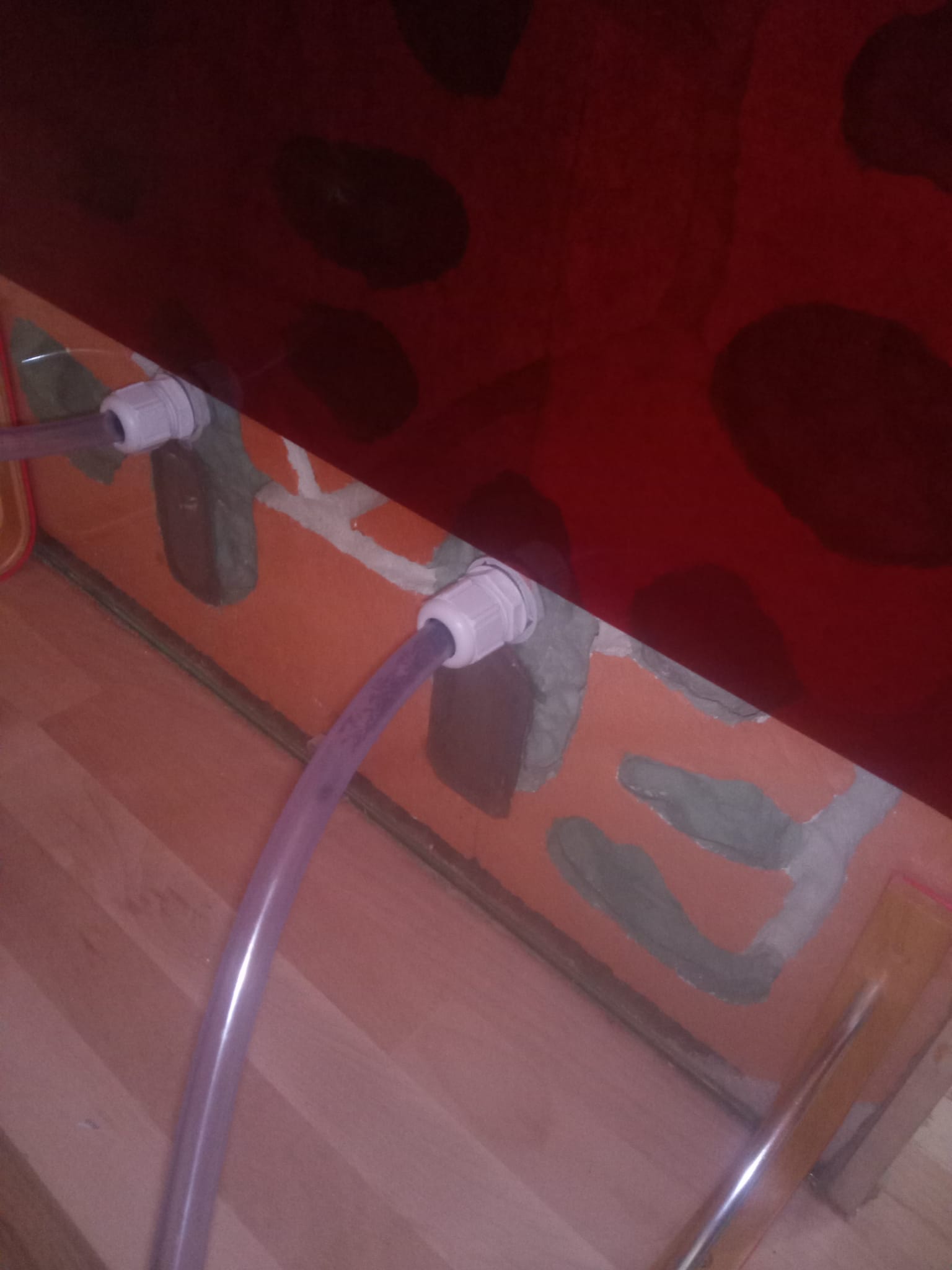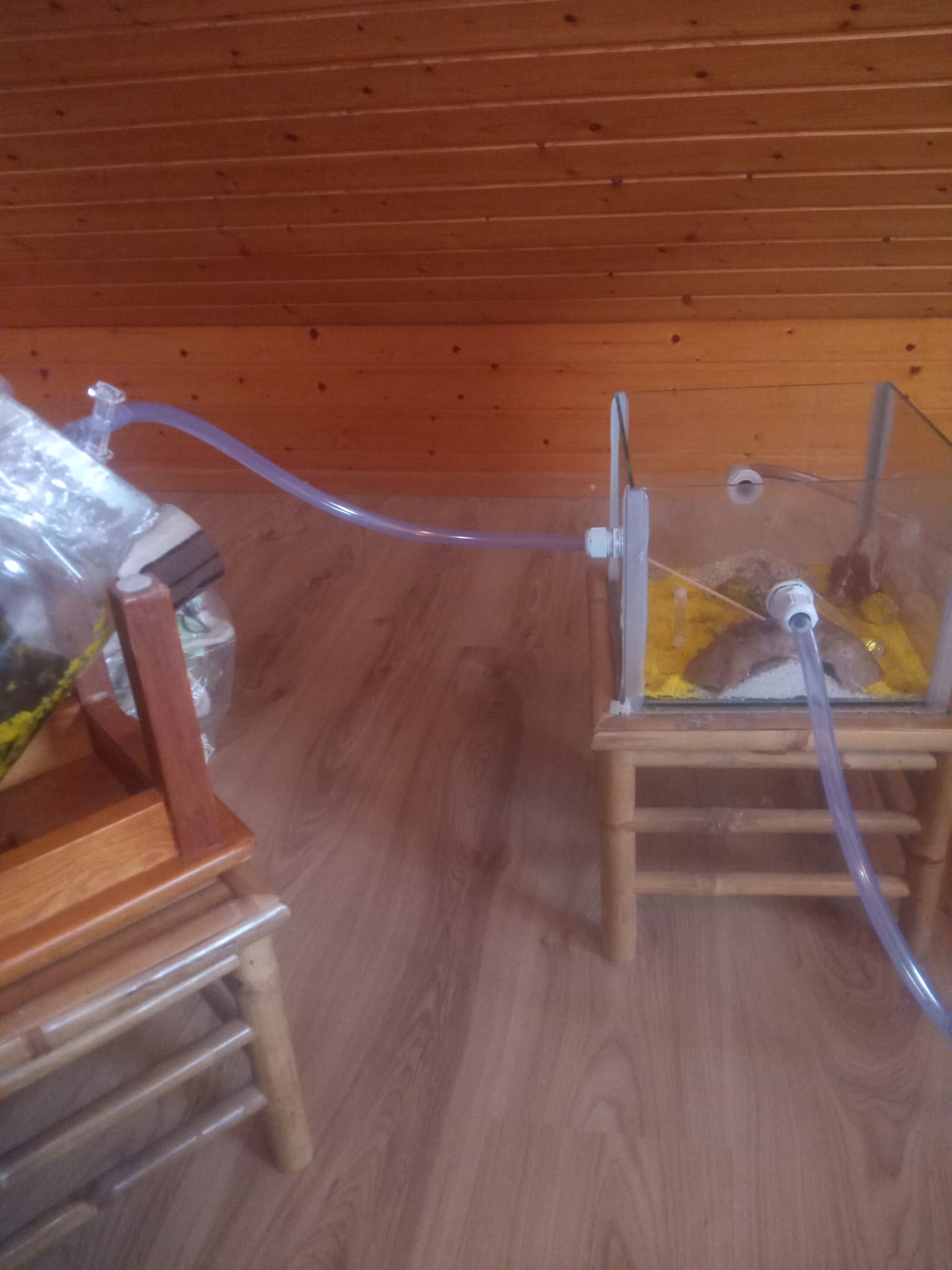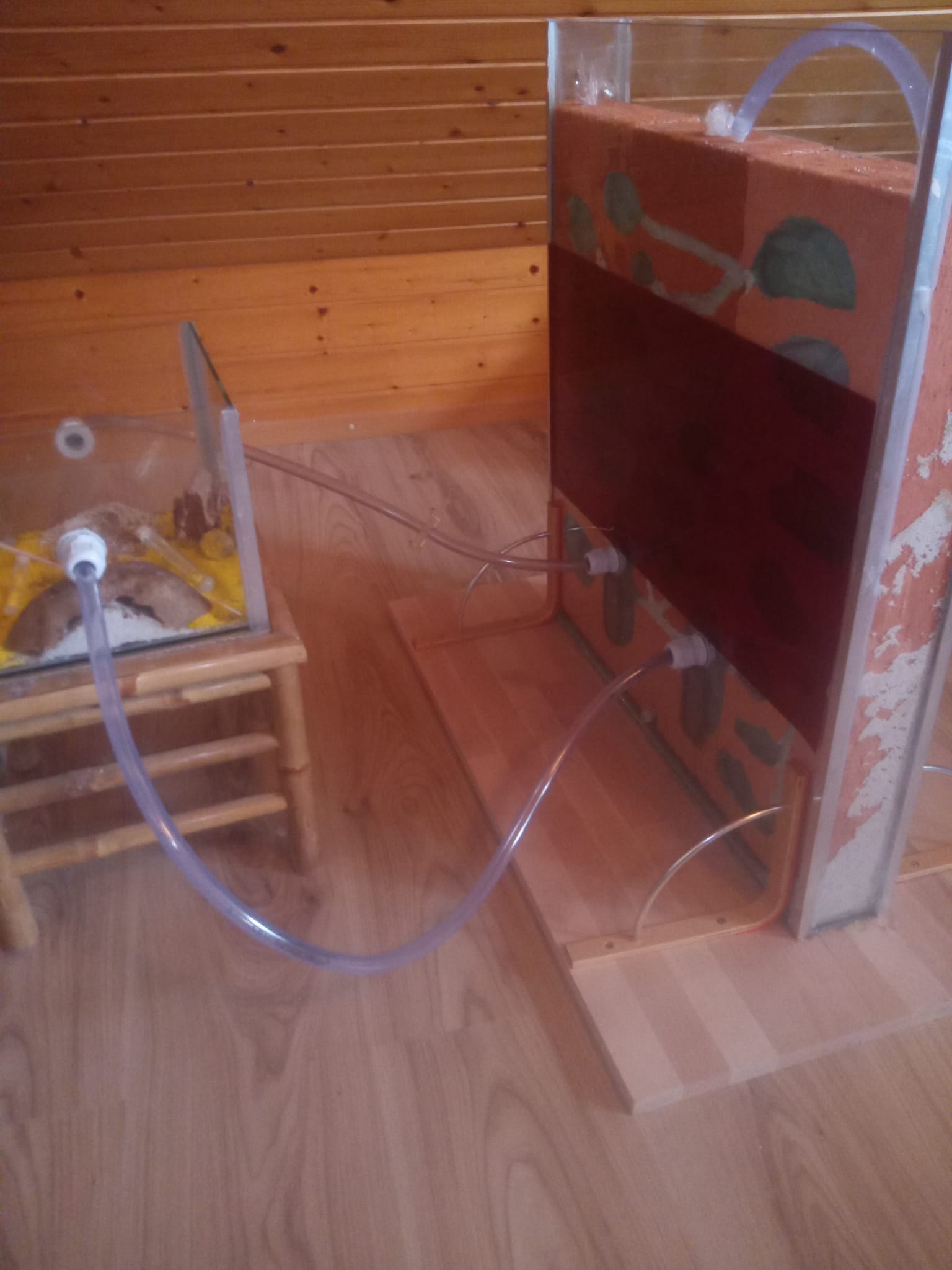 Das Kühlen des Wassers im Glas hat bewirkt, dass mehr Brut in den Schlauch gelegt wurde, der aus dem Glas herausführt, aber weiter bringen sie sie nicht weg. Das Wärmen des neuen Nests verlief ergebnislos, außer dass es immer mehr Kondenswasser im Schlauch gab. In Hinblick auf die Winterruhe haben wir die Heizmatte vor kurzem wieder ausgeschaltet.