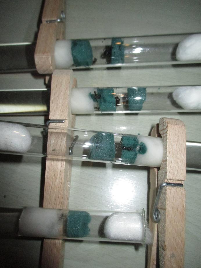 Sogar bei den mitteleuropäischen Ameisen, die sich noch in derWinterruhe befinden, setzte ich ganz schnell eine Idee um, bevor es wieder zurück ins Kalte ging: Anstatt mit Alufolie Zwischenwände und Raumverkleinerungen in Reagenzgläser zu bauen, nahm ich jetzt einfach das Steckmoos. Herrlich, ich bin echt happy damit.