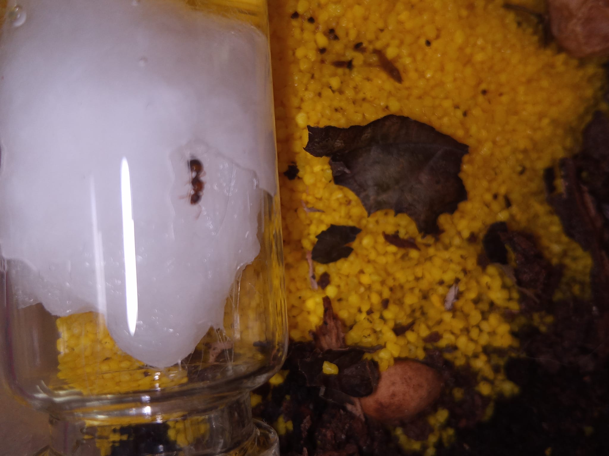 Nachdem ich die Temnothorax-Gyne auch heute auf der Watte vorgefunden habe, habe ich gleich ein Bild für Euch gemacht - leider ging es nicht schärfer. Das Glas ist offen. Sie kann also auch wieder zum Kirschkern oder wo immer die Arbeiterinnen jetzt hausen. Eine Arbeiterin habe ich vorhin am Futter gesehen, sie lief aber weg und verschwand wieder in dier Erde. Die Erde ist vom Fundort gewesen. Ansonsten ist der Untergrund gelb, wie Ihr seht.