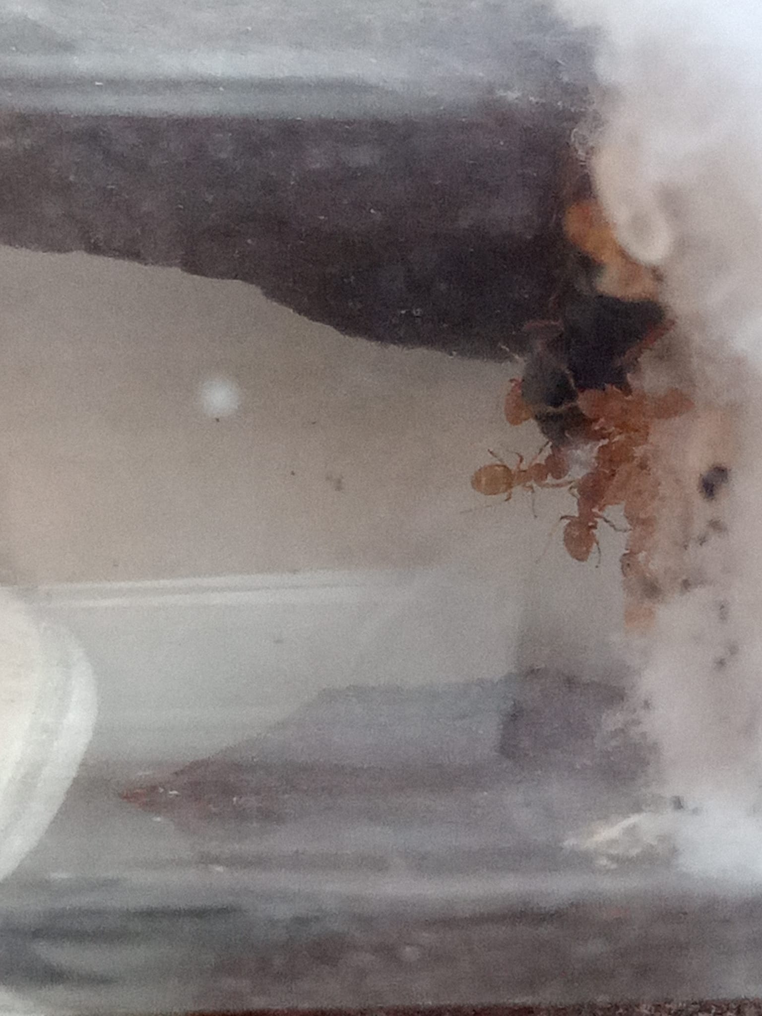 Danach habe ich nach den anderen Insekten geschaut und zum Schluss nochmal zu den Lasius cf flavus (ohne die Abdeckung zu entfernen). Die erste Arbeiterin hat sich bis zum Rand des RG gewagt, aber noch nicht hinaus. Das war vielleicht eine halbe bis ganze Stunde nach dem Öffnen des RG.