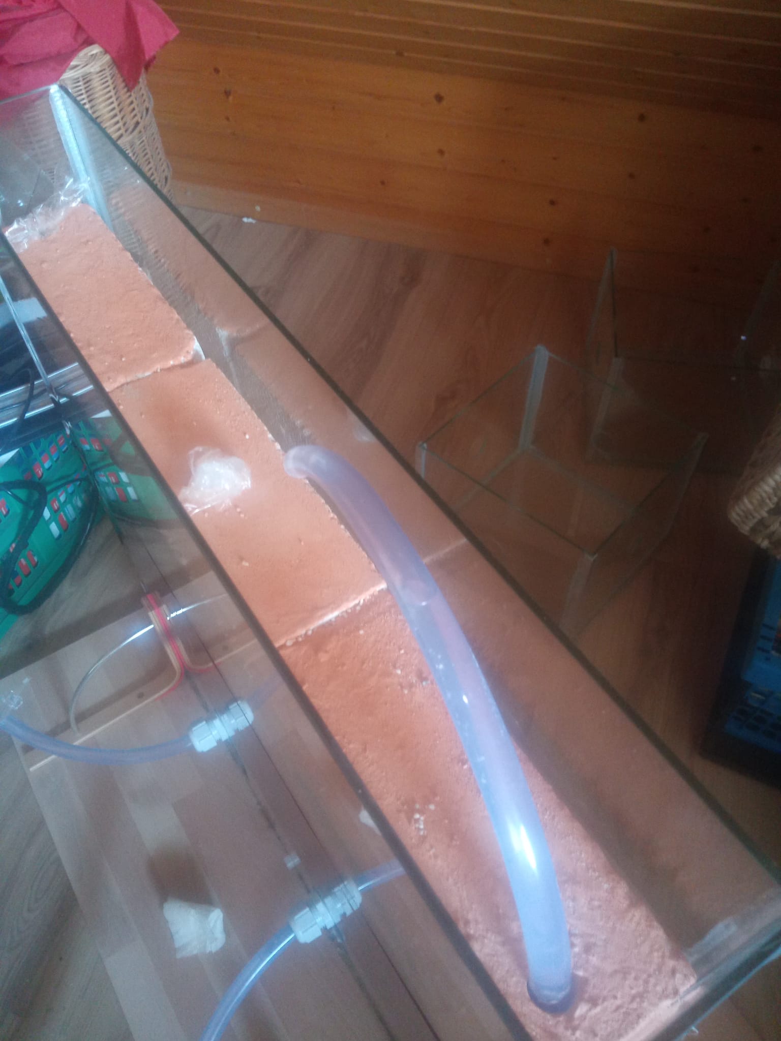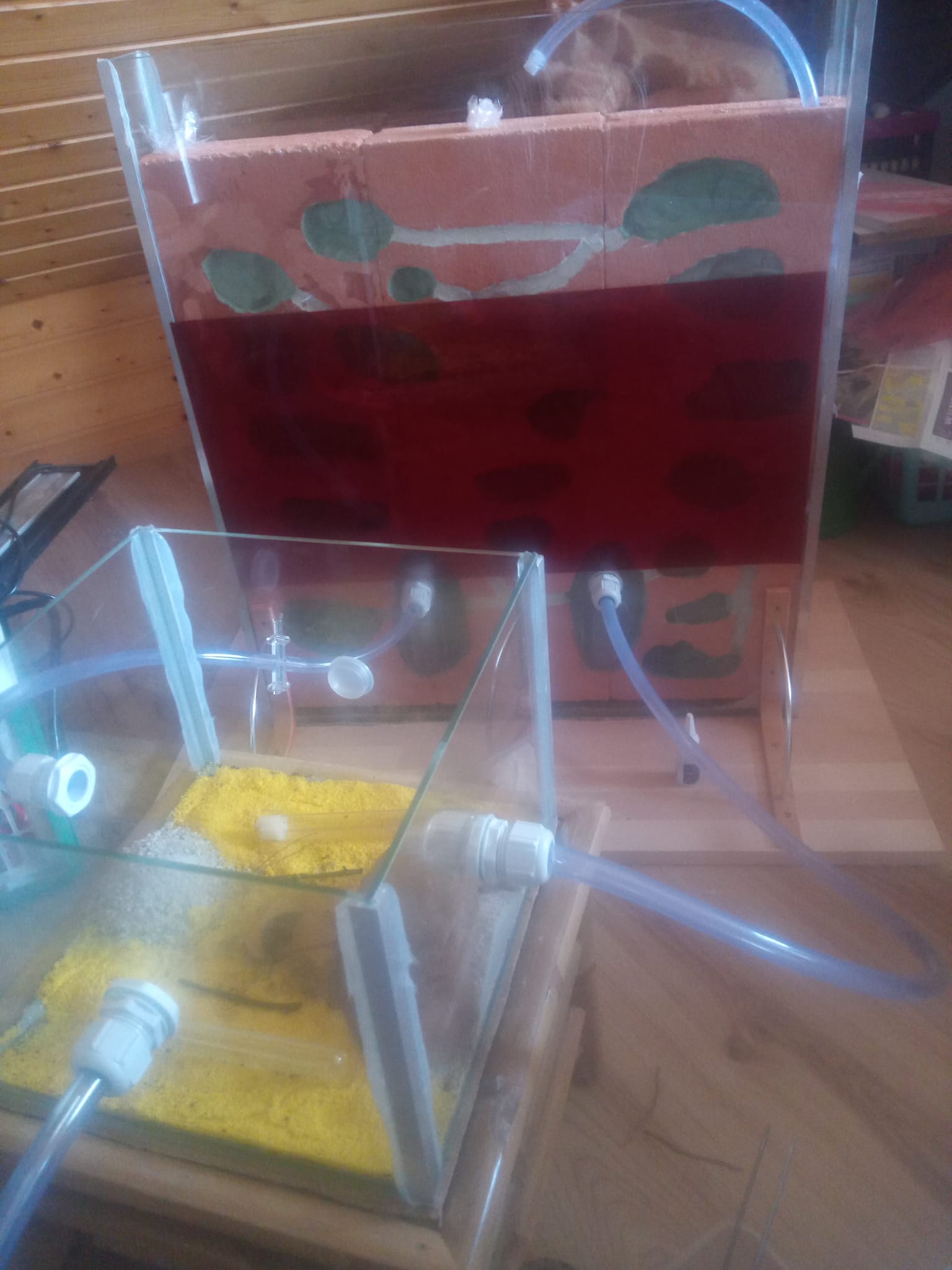 Die Ameisen haben es allerdings noch nicht angeschaut, zumindest haben wir nichts davon mitbekommen. Wir haben nach wie vor den Aufbau altes improvisiertes Nest - Schlauch zur kleinen Glasarena - zwei (statt vorher einem) Schläuche zum neuen Nest.