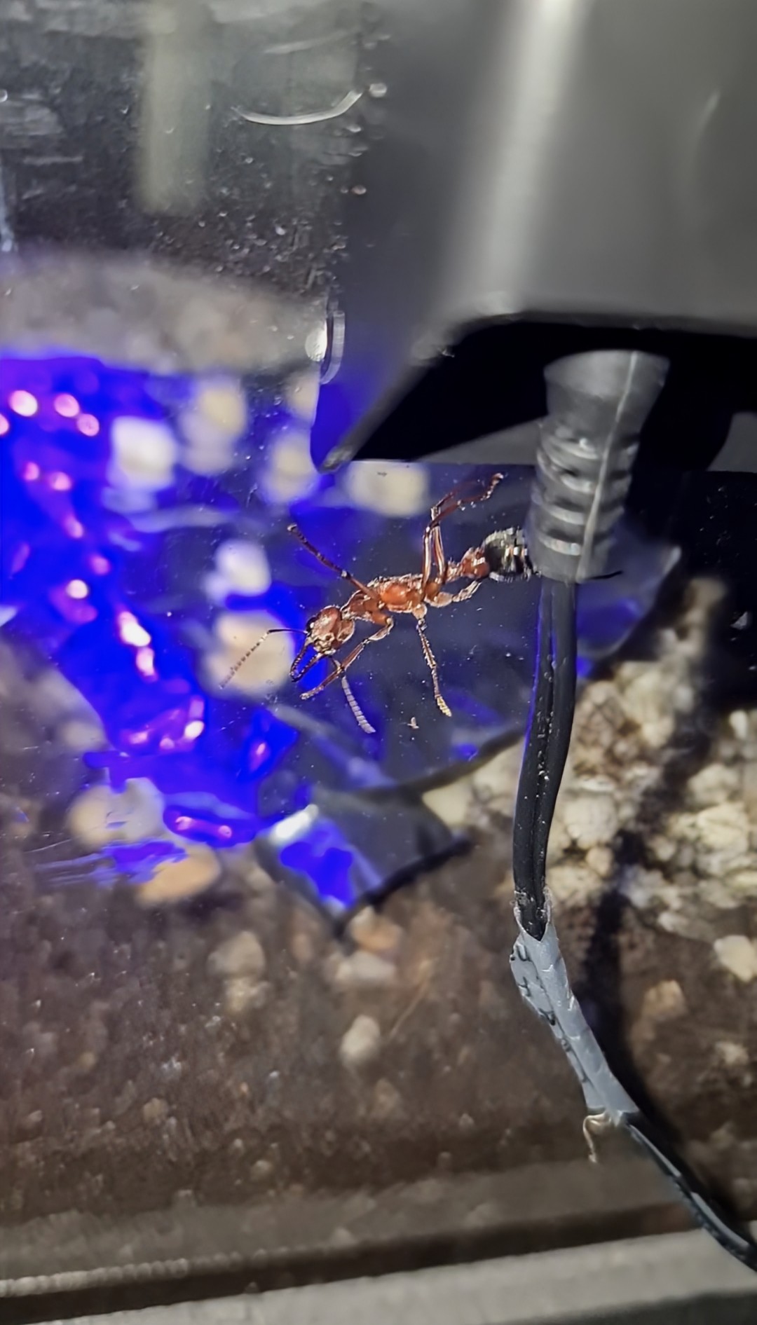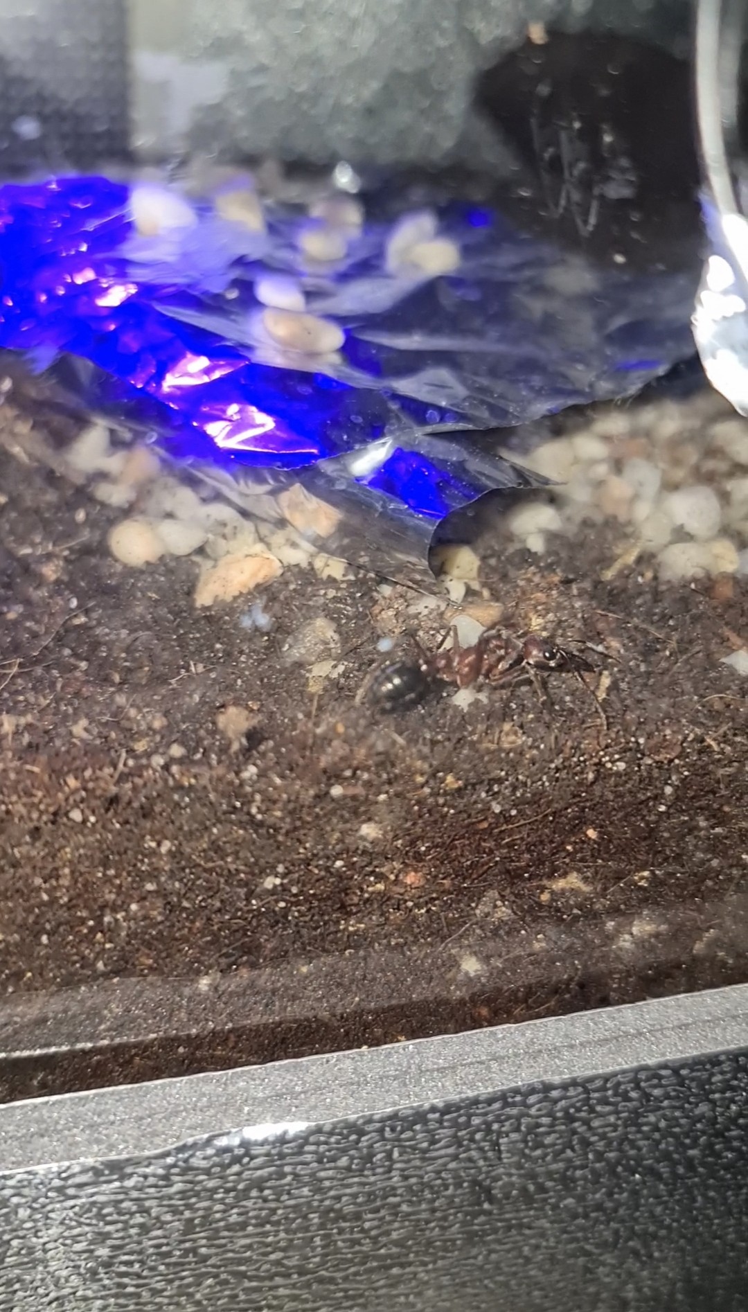 Da ich kein vollständiges Sichtfenster ins Nest habe, entstehen keine direkten Aufnahmen aus dem Inneren. Über ein zufällig entstandenes kleines Fenster kann ich zwar begrenzt Einblicke gewinnen, das gesamte Nestgeschehen lässt sich aber nicht beobachten. Bilder wird es daher überwiegend nur aus der Arena geben – und auch das vorerst eher selten, da die Kolonie aktuell hauptsächlich nachts aktiv ist und sich bei Störungen sofort zurückzieht. Sobald die Ameisen aktiver werden, wird es entsprechend mehr Bildmaterial geben. Unabhängig davon werde ich so viele Informationen wie möglich zusammentragen, um die Entwicklung der Kolonie so realistisch und nachvollziehbar wie möglich zu dokumentieren.