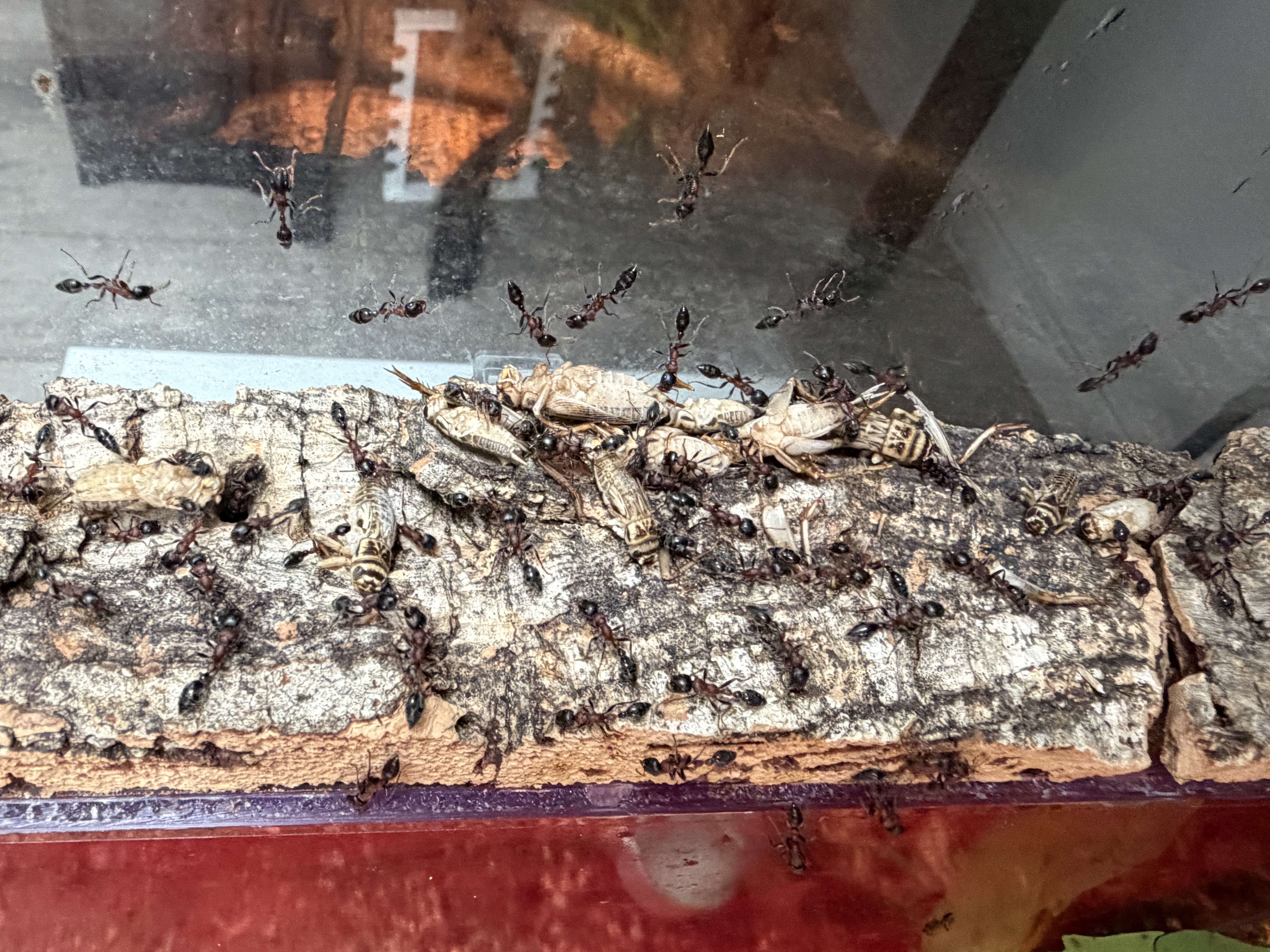 Allgemein geht es der Kolonie prima und wÀchst stetig. Man sieht aber auch, dass in der Arena immer mehr tote Ameisen liegen. Ein zentrierten Sammelpunkt haben sie noch nicht gefunden.