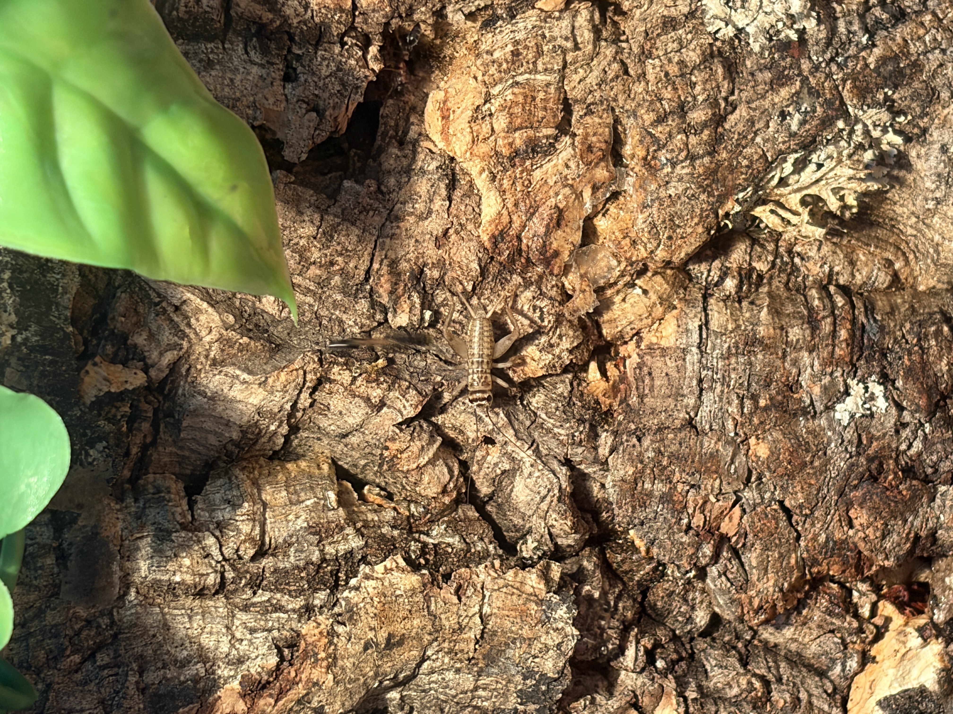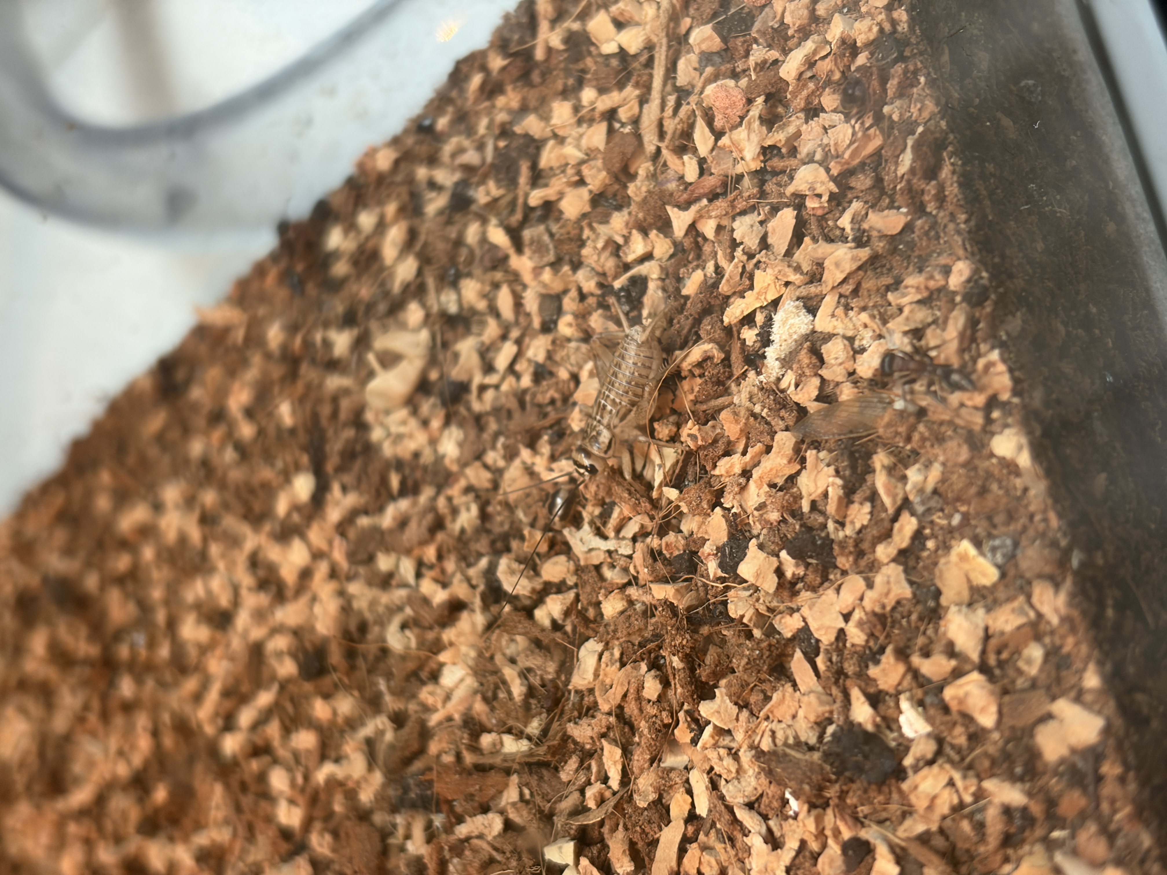 Die Heimchen waren deutlich flinker als gedacht. Die haben recht lange ĂŒberlebt. Ich habe zwischenzeitlich eine Scheibe Gurke und Apfel reingelegt. Die Heimchen hatten tatsĂ€chlich die Gelegenheit sich zu bedienen.