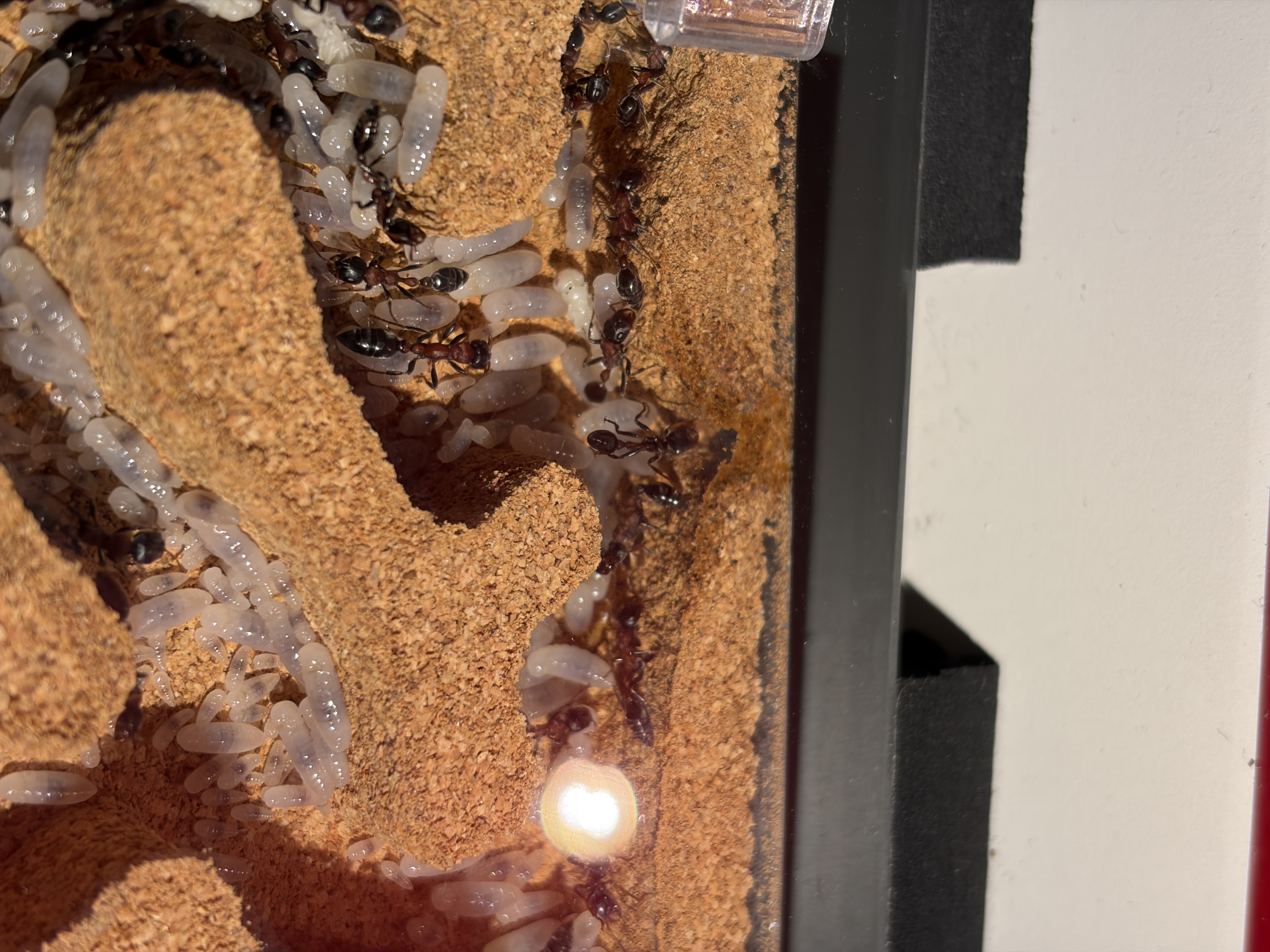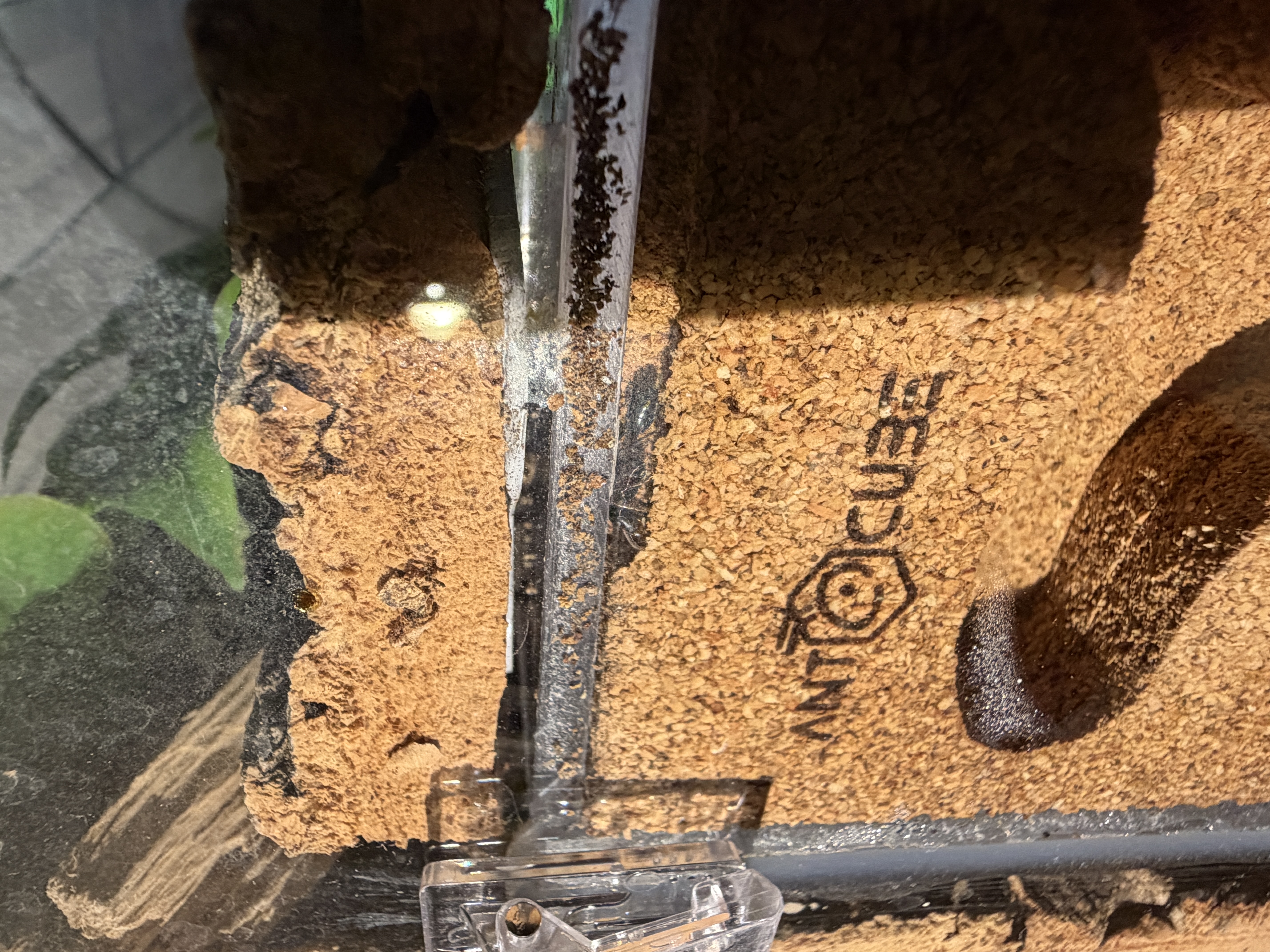 Beim Reinigen ist leider die WĂ€rmelampe kaputt gegangen. Das hat zur Folge, dass die Temperatur um knapp 4 grad gefallen ist. Die Ameisen agieren deutlich trĂ€ger in der Arena. Neue Lampen sind unterwegs. Provisorisch habe ich eine LED reingeschraubt. Eine 35 Watt Lampe wollte ich nicht einsetzten, da dann die Wahrscheinlichkeit wieder steigt, dass sie in der RĂŒckwand graben und umziehen.