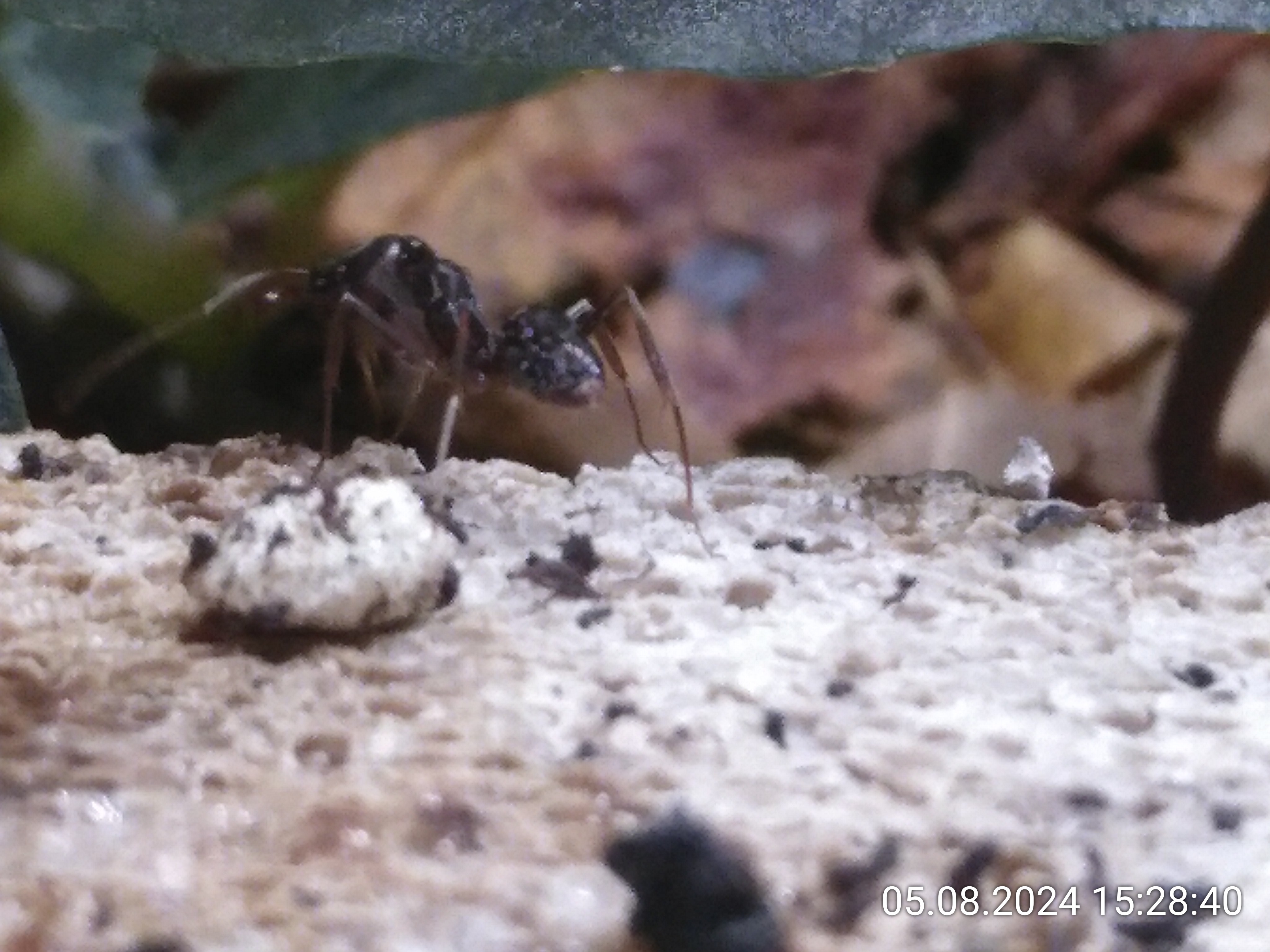 Irgendwie habe ich ein Problem mit der Pflege dieser Ameisen oder eigentlich auch gar nicht. Ich muss ja nichts für sie tun. Das bin ich nicht gewohnt. Ihr Wasser nehmen sie angeblich am liebsten direkt aus der Natur (von Blättern etc.), trotzdem habe ich ihnen ein RG mit Wasser gemacht. Gesehen habe ich darin bisher nur Schnecken und Asseln. Zuckerwasser brauchen sie angeblich auch nicht, gibt es aber sowieso für die Nicos. Daran habe ich sie schon zweimal (!) beobachten können. Proteine erjagen sie sich am liebsten. Ob sie das schon tun, kann ich nicht sagen, aber die Möglichkeit haben sie mehr als ausreichend. Einmal habe ich sie aber auch schon einen halben Mehlwurm wegtragen sehen, der für die Asseln gedacht war.