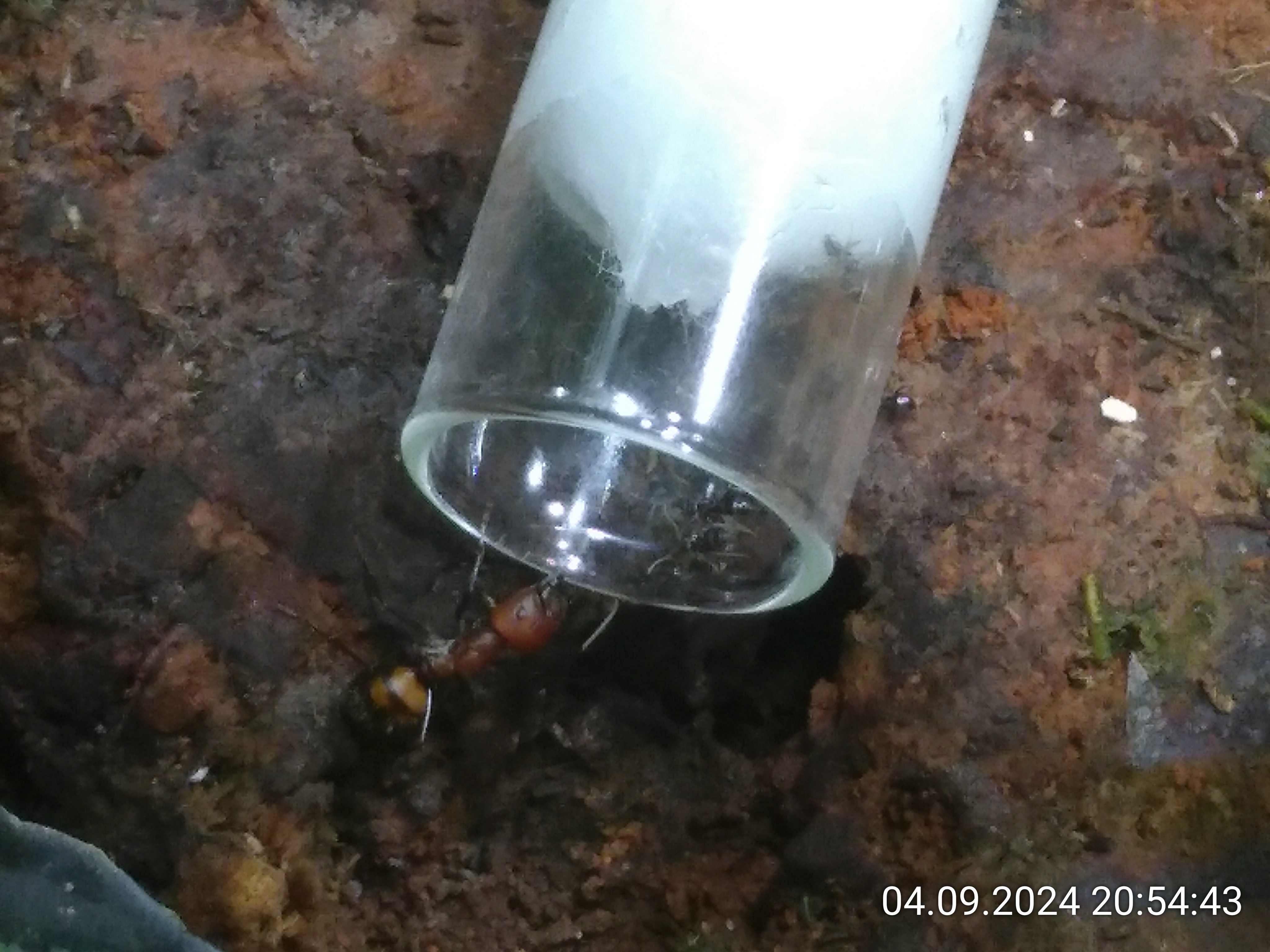Ich glaube, ich sehe fast immer genau die selbe. Sie jagt immer im selben Bereich. Dort, wo vom Nest aus gesehen, die Streuschicht beginnt, verkriecht sie sich unter ein Blatt oder in eine Ritze und kommt meist nach kurzer Zeit mit Beute zwischen denMandibeln hervor. Dann geht es auf direktem Weg ins Nest. Nach wenigen Minuten ist sie dann zurück und das Spiel beginnt von vorn. Heute Abend habe ich das zwischen Mitternacht und 0:30 Uhr bestimmt achtmal hinterienander beobachtet. Eine effektive Jägerin