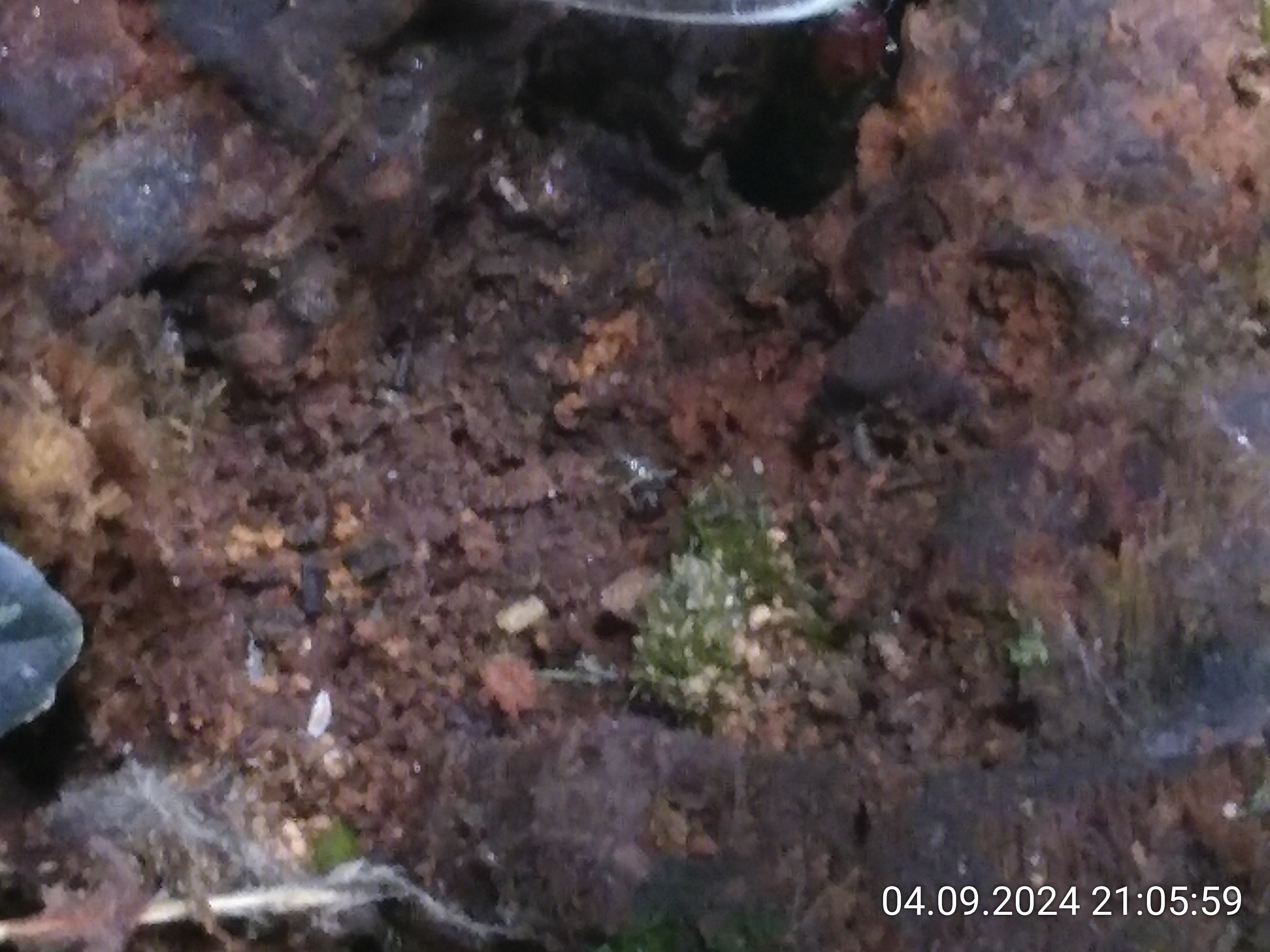 Vorne der Krater, von dem ich gestern berichtet habe, dahinter der neue Eingang zum Nest der Nicos, direkt unter der öffnung des RGs. Auf und im RG sind Lasius. Die Nico vertreibt sie gerade.