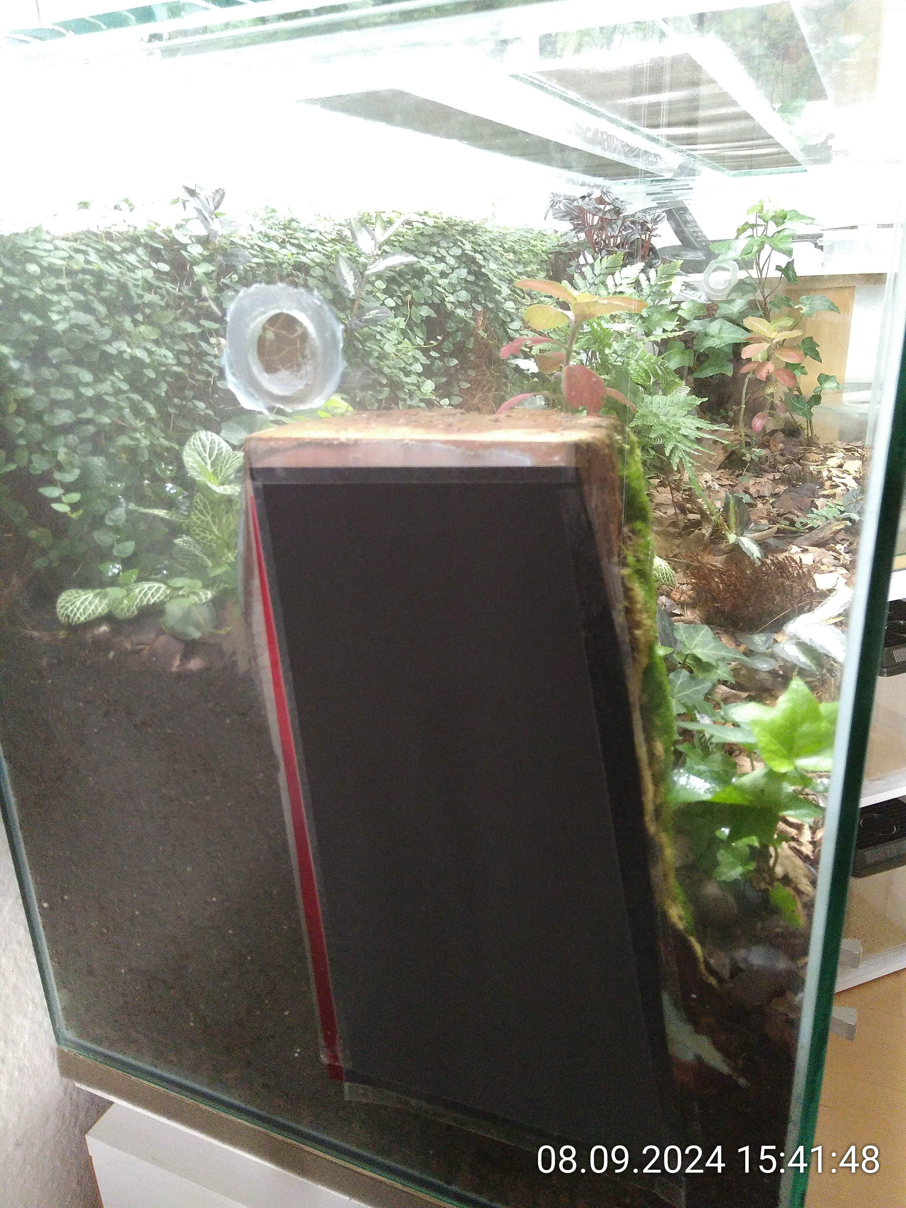 Von außen kann ich sehen, dass sie an vereinzelten Stellen bis zum Glas gegraben haben. Dort habe ich aber noch nie eine Ameise gesehen. Sie verstecken sich gut. Ich überlege, ob ich an dieser Stelle eine kleine Heizmatte anbringe. Das könnte ich ganz diskret an der Rückseite machen.