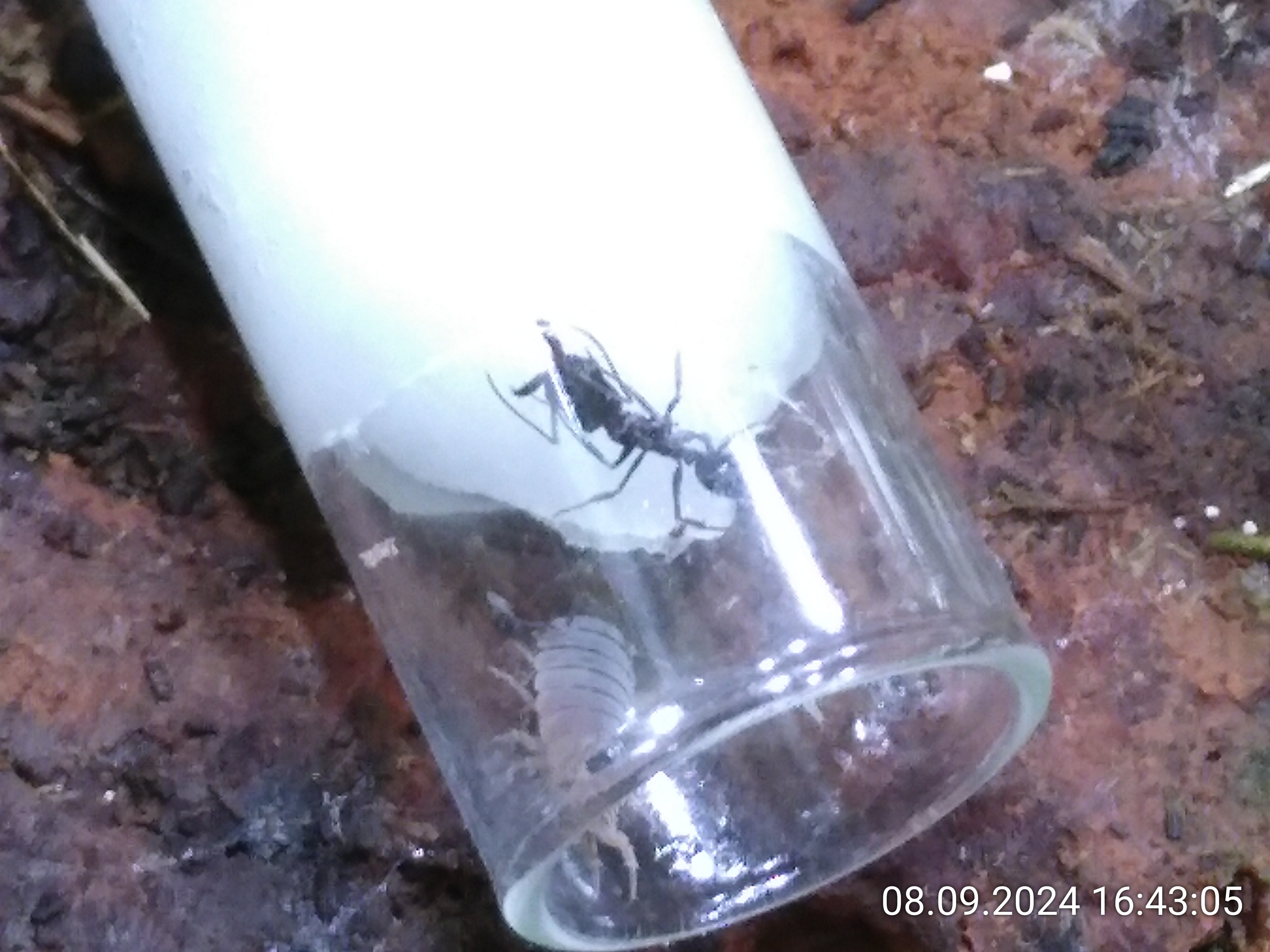 Lieber oft kleine einfache Beute machen, als ein Risiko bei einer größeren einzugehen. Kleine Asseln gibt es genügend. Es wird Zeit, dass ihre Zahl reduziert wird. Gestern glaube ich sie sogar mit einer Lasius zwischen den Kiefern zum Nest zurücklaufen gesehen zu haben.