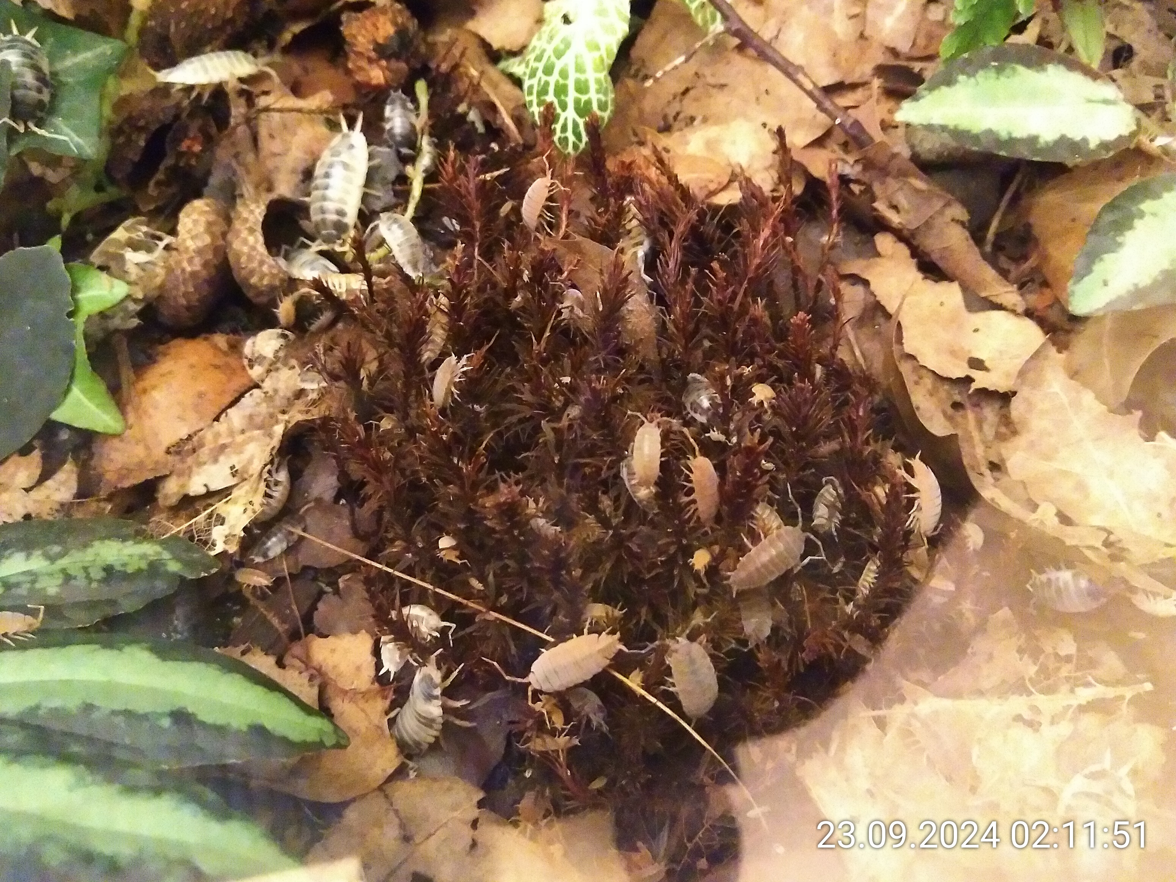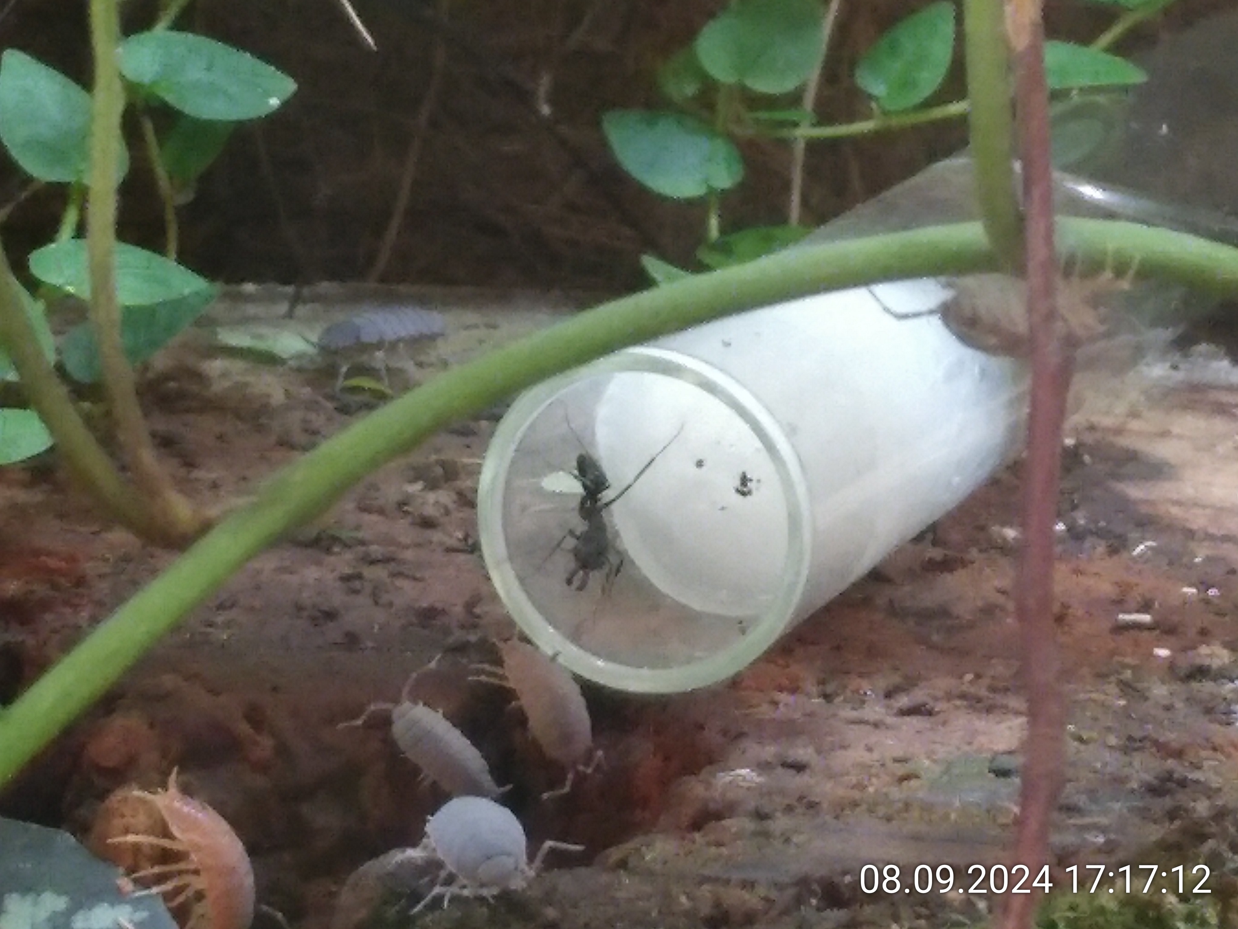 Irgendwie habe ich bei diesen Ameisen das Gefühl, nicht genug für sie zu tun, sie zu vernachlässigen. Ich weiß nicht, ob sie jagen oder sich an der Zuckerquelle bedienen. Und auch nicht, ob sie etwas von den angebotenen TK-Insekten abbekommen. Die Asseln sind nämlich ganz schön verfressen. Es wird echt Zeit, dass sie intensiv bejagt werden. Ich hoffe, die Schnappis kommen gut ohne meine Unterstützung zurecht. Ich kann nur hoffen, dass die Aktivität bald zunimmt. Das wäre ein gutes Zeichen.