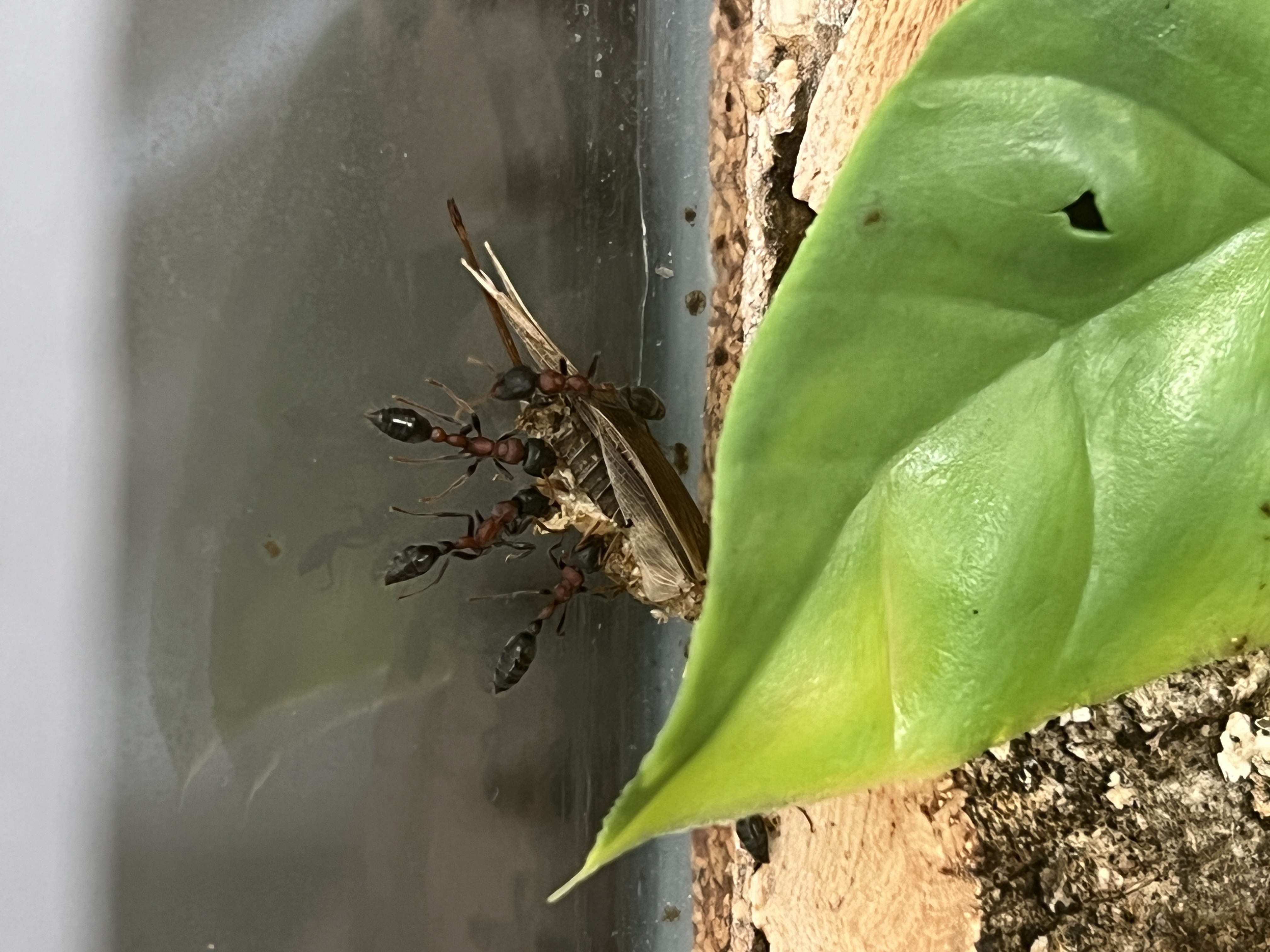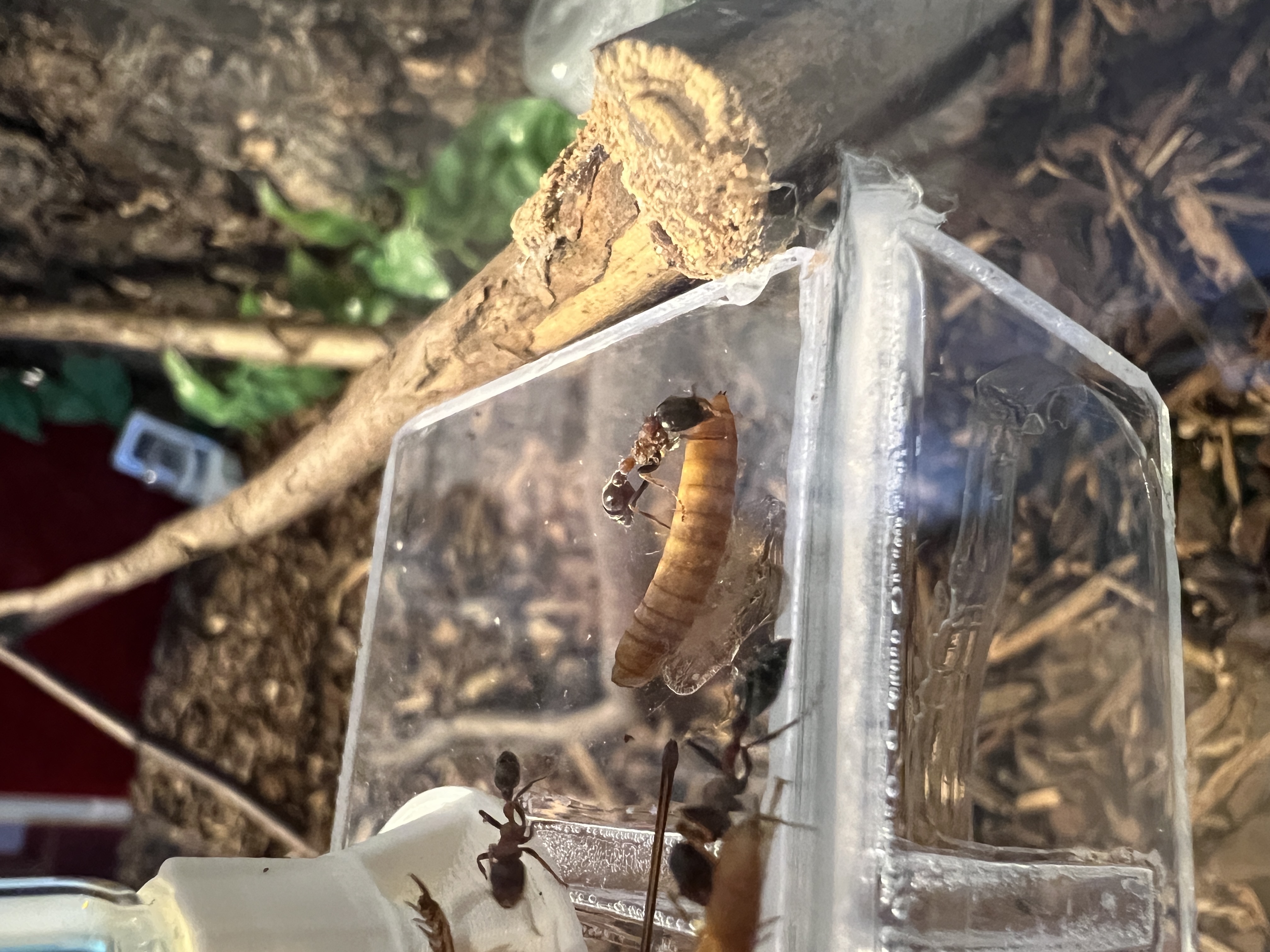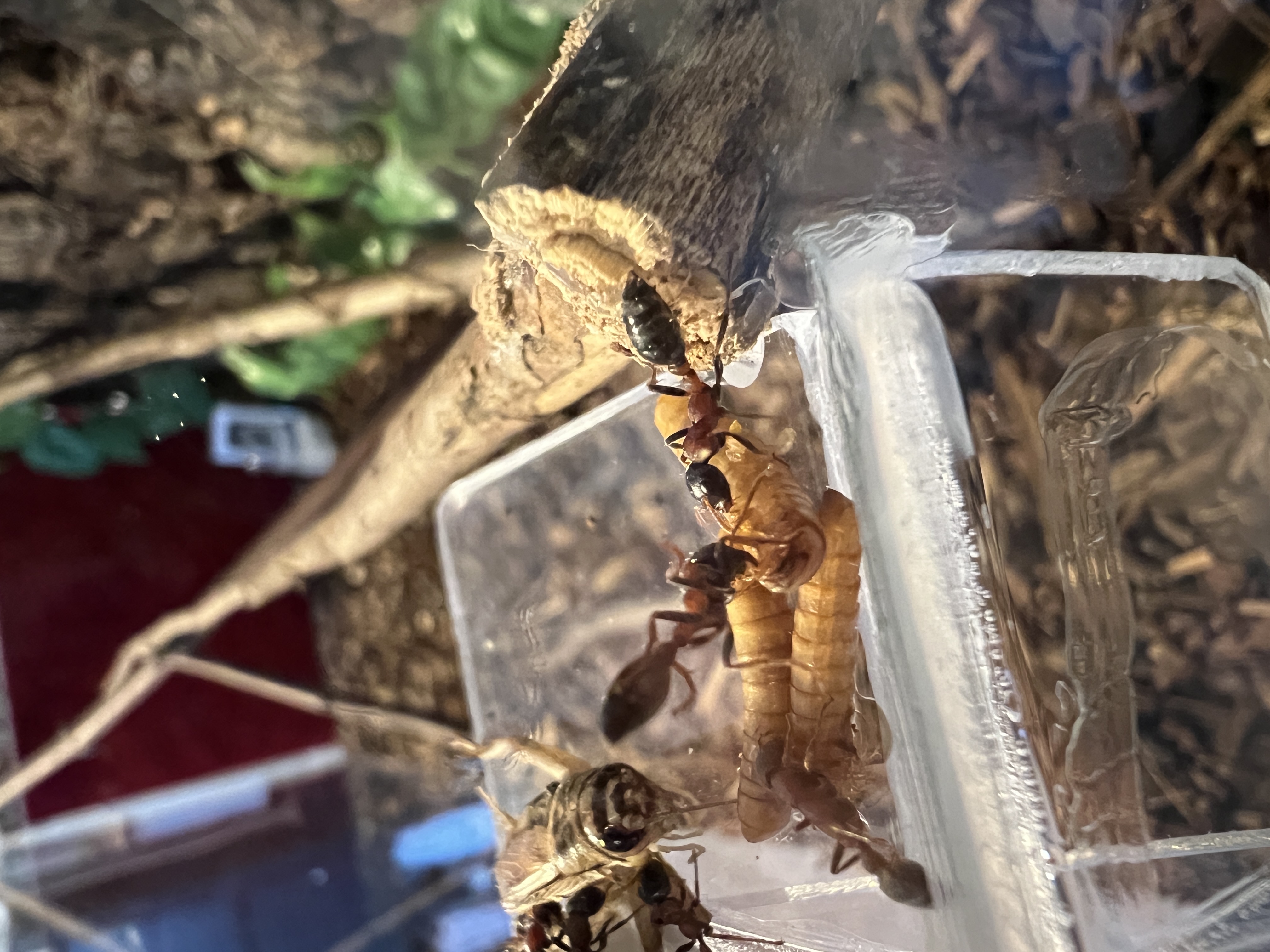 Ich konnte beobachten, wie eine Arbeiterin kleine StĂŒckchen vom Heimchen in das Nest eingetragen hat, wo es auf einem kleinen Haufen gelagert wird.