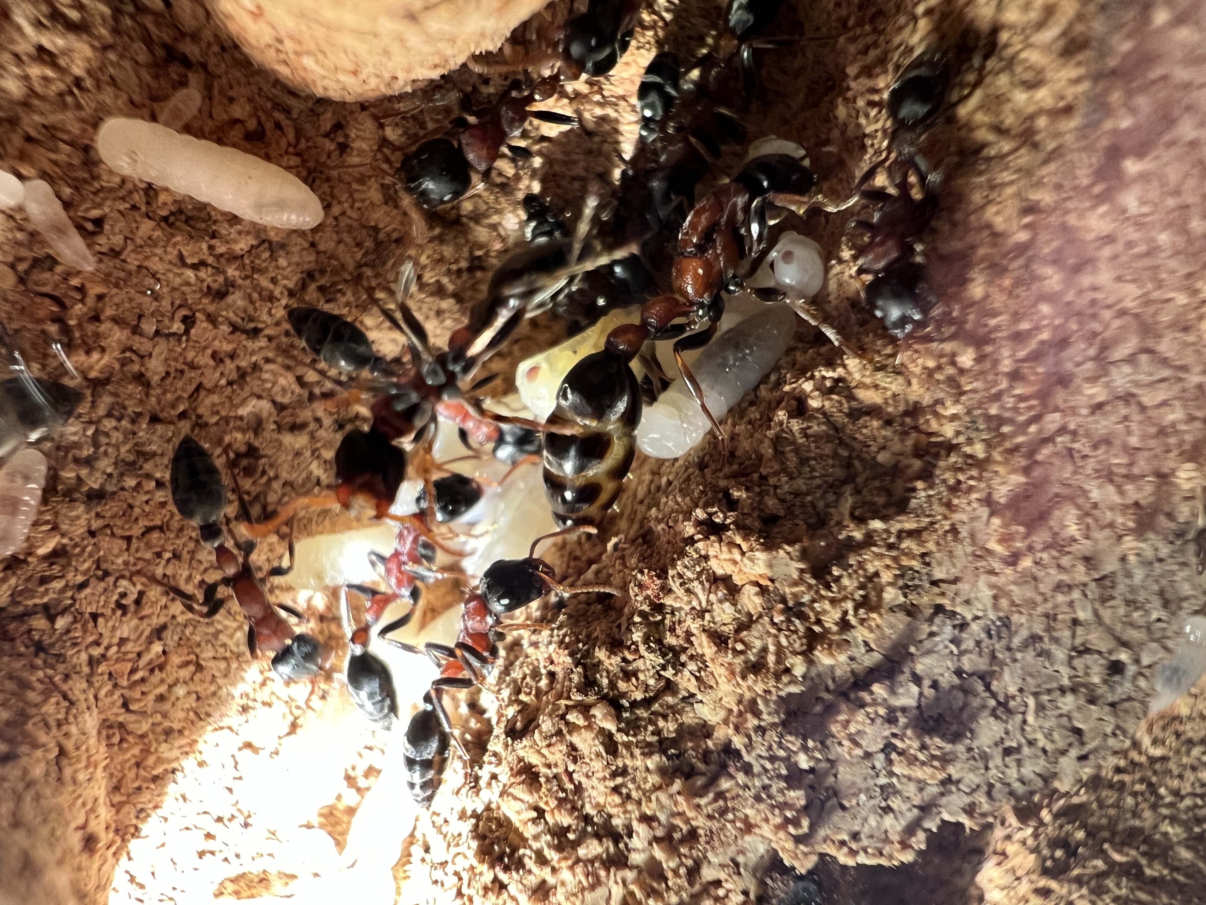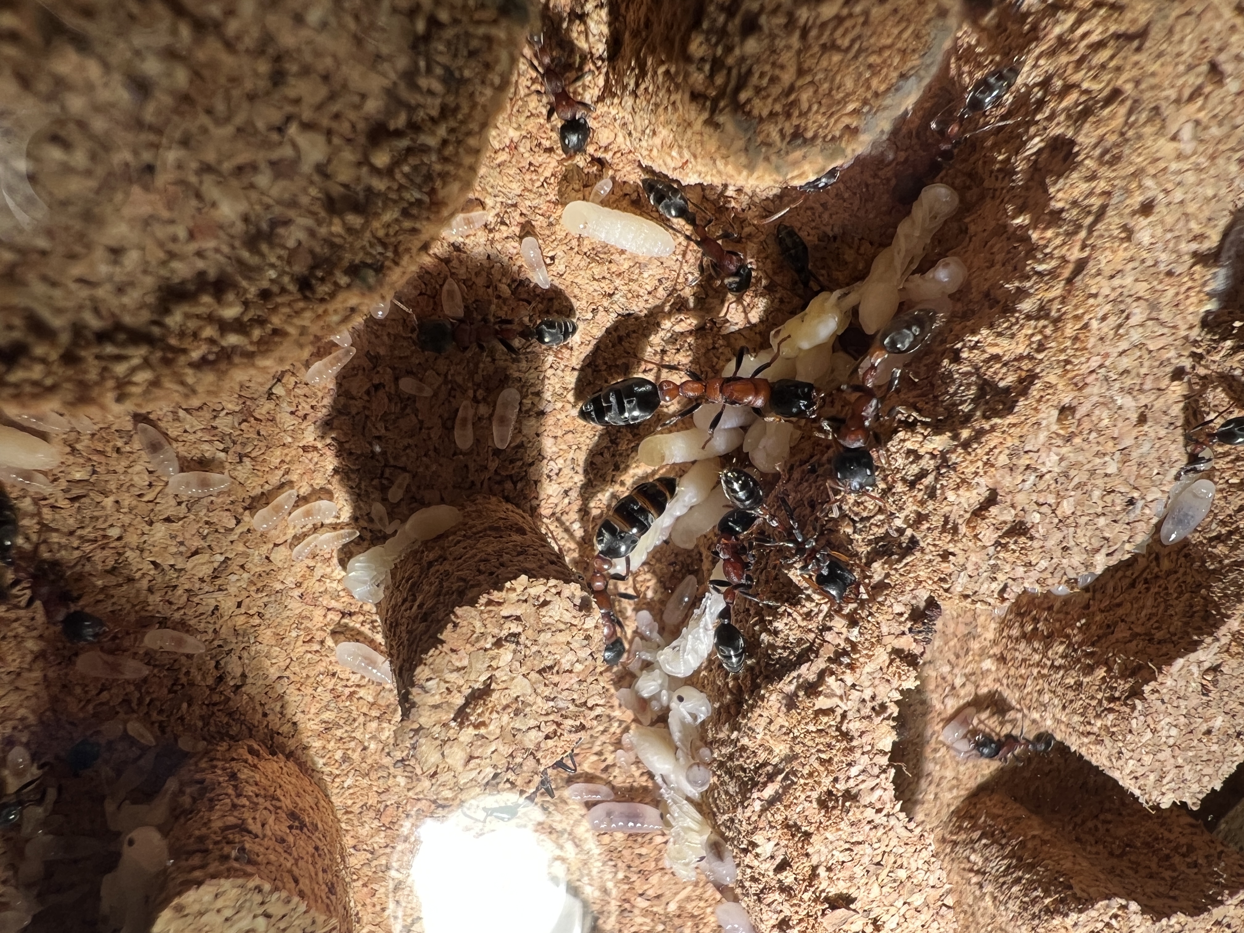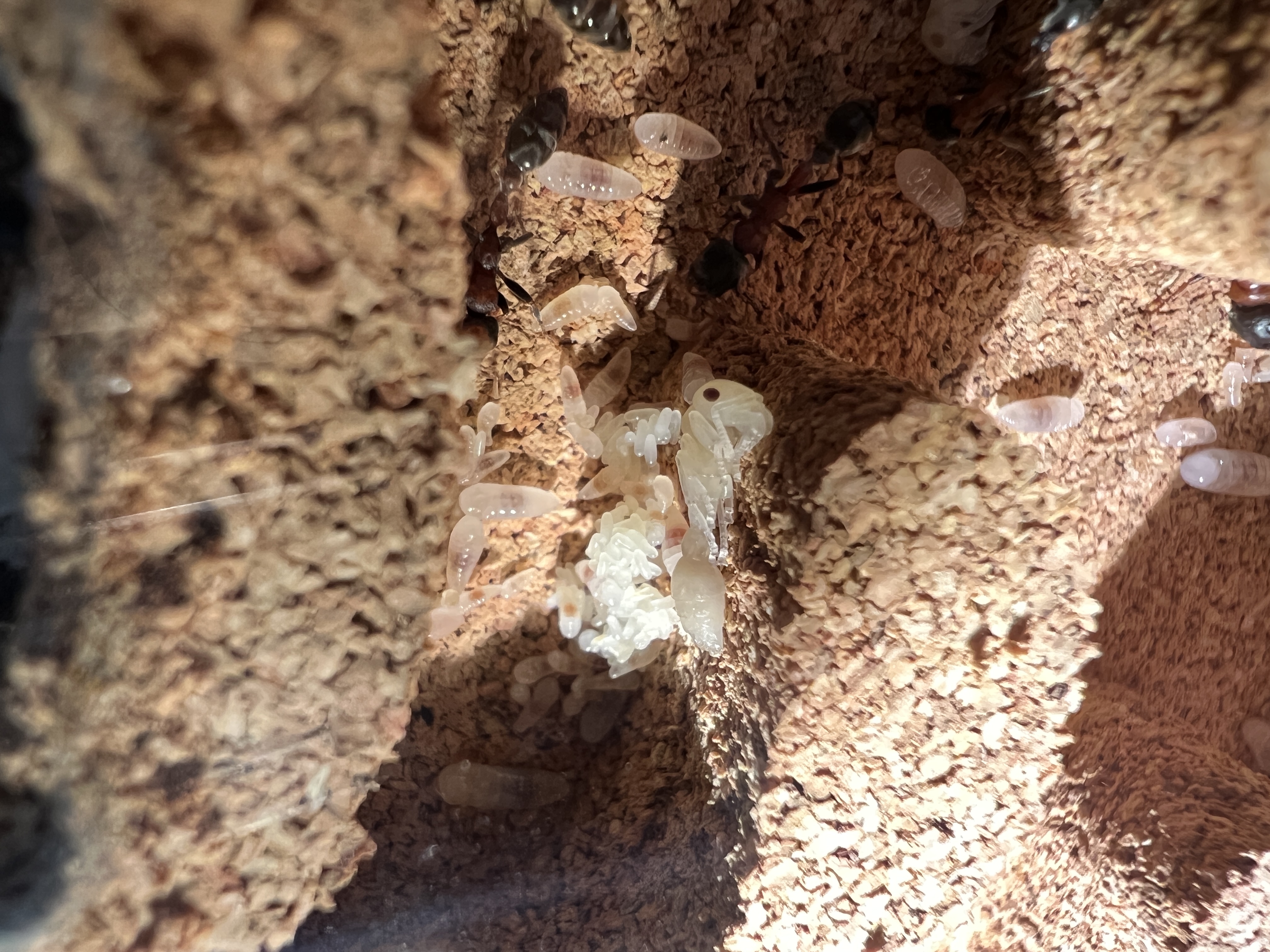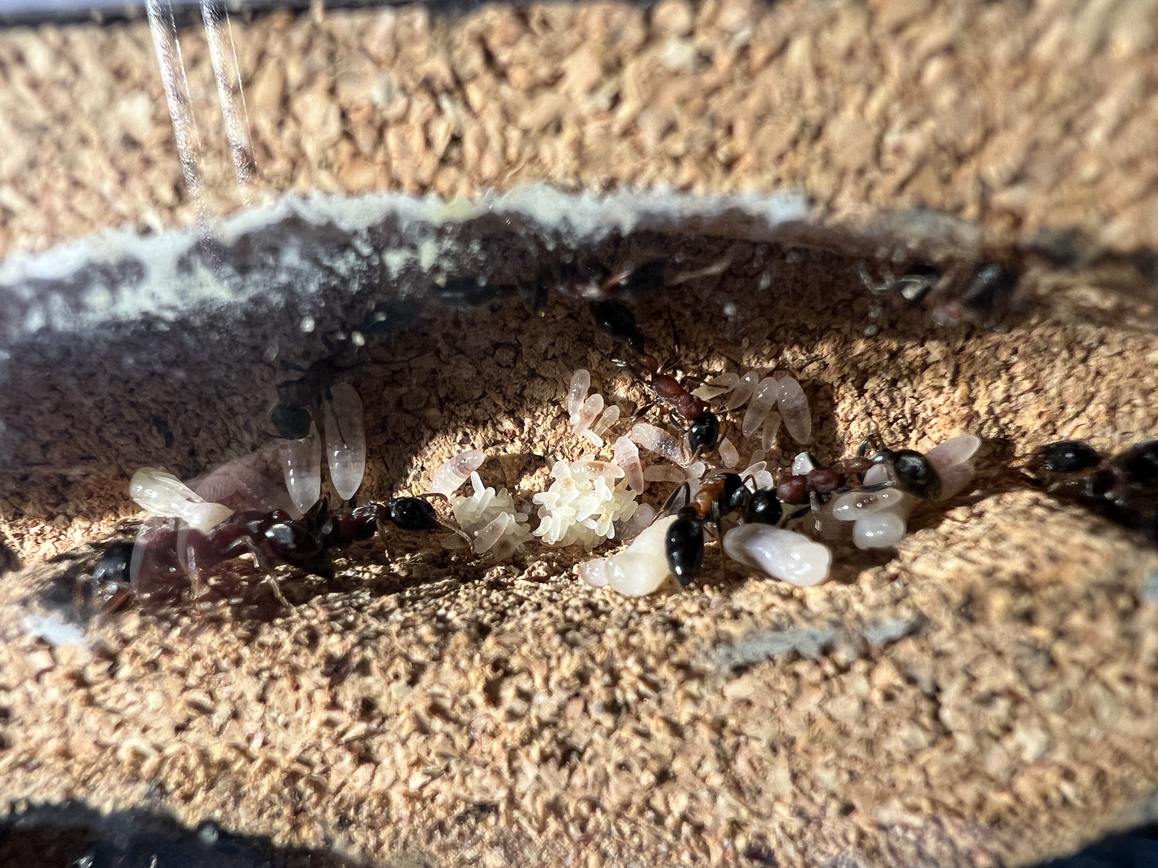 Was mir aufgefallen ist, zu Anfang lagen beide Gynen nebeneinander. Seit ein paar Tagen, haben sich 2 Gruppen gebildet, mit jeweils einer Gyne, aber immer noch im selben Nest.