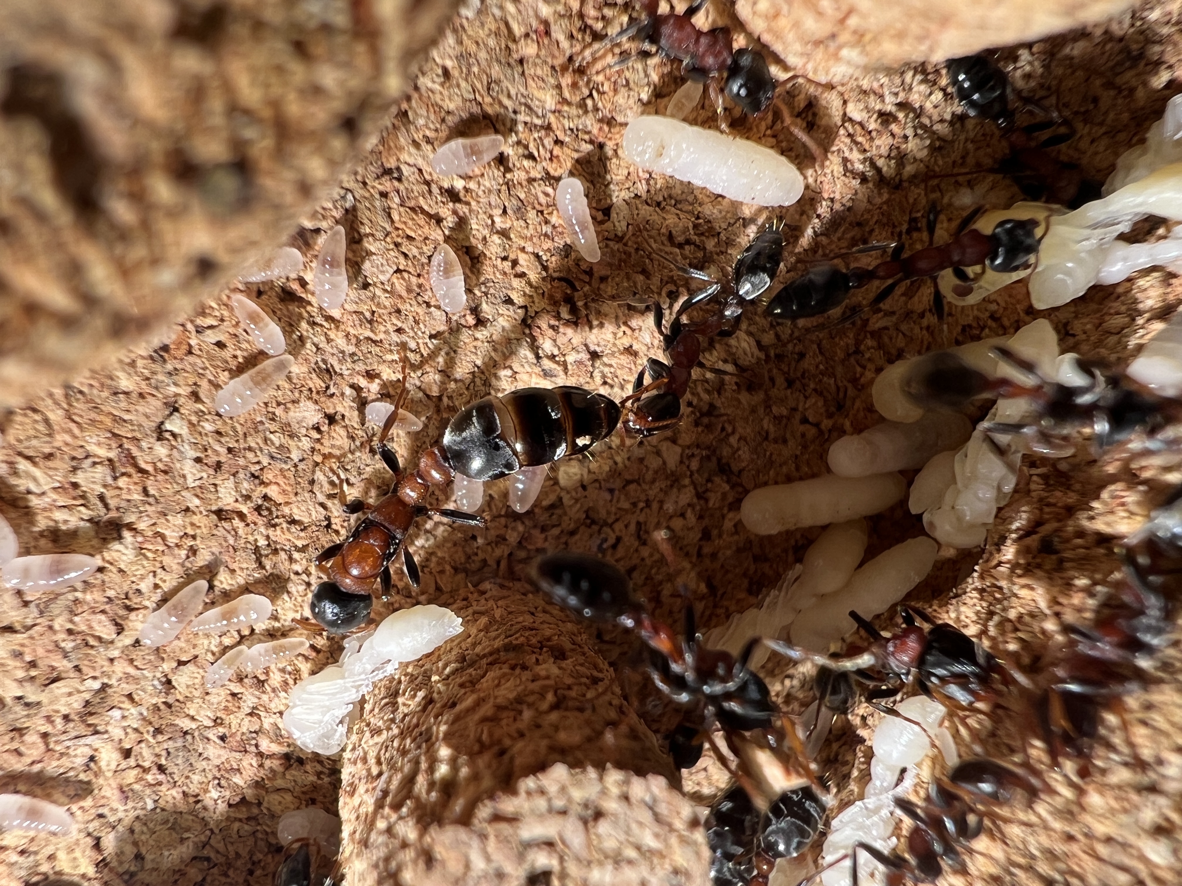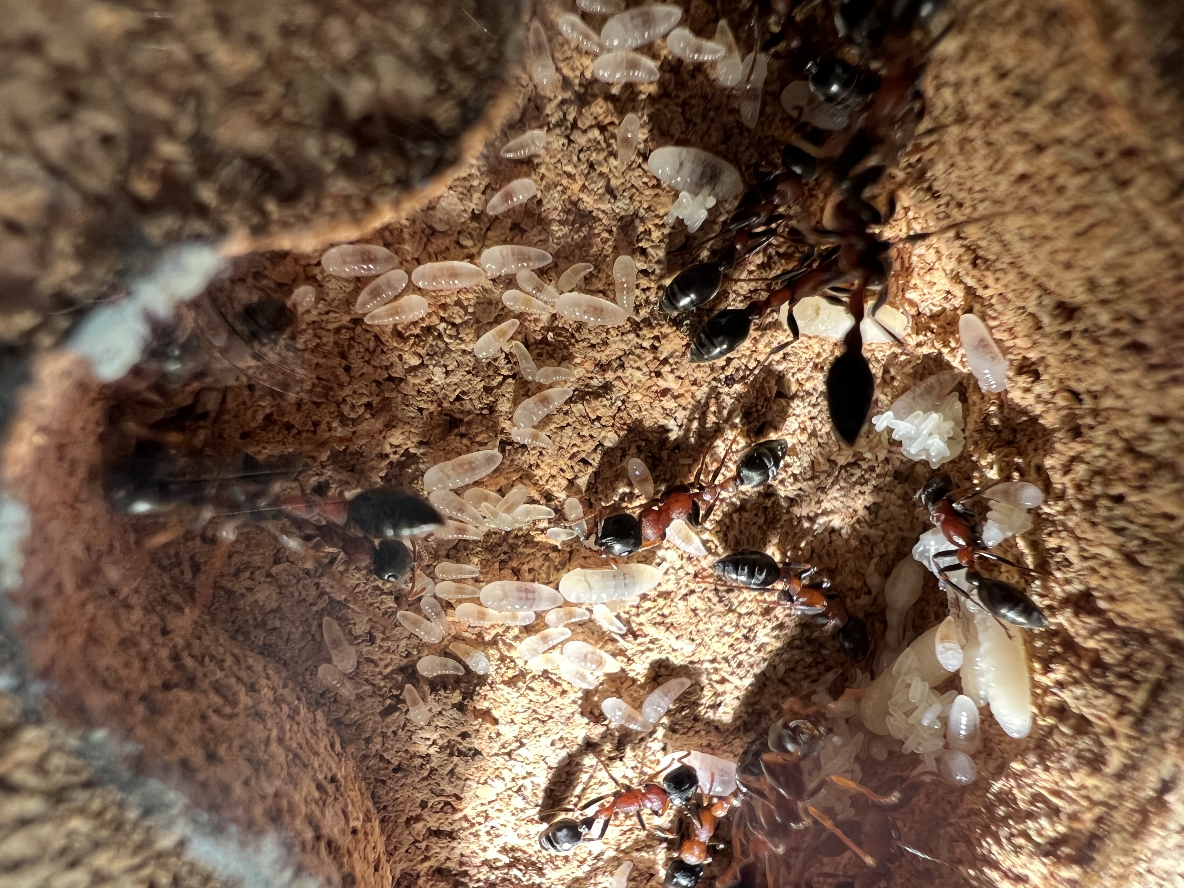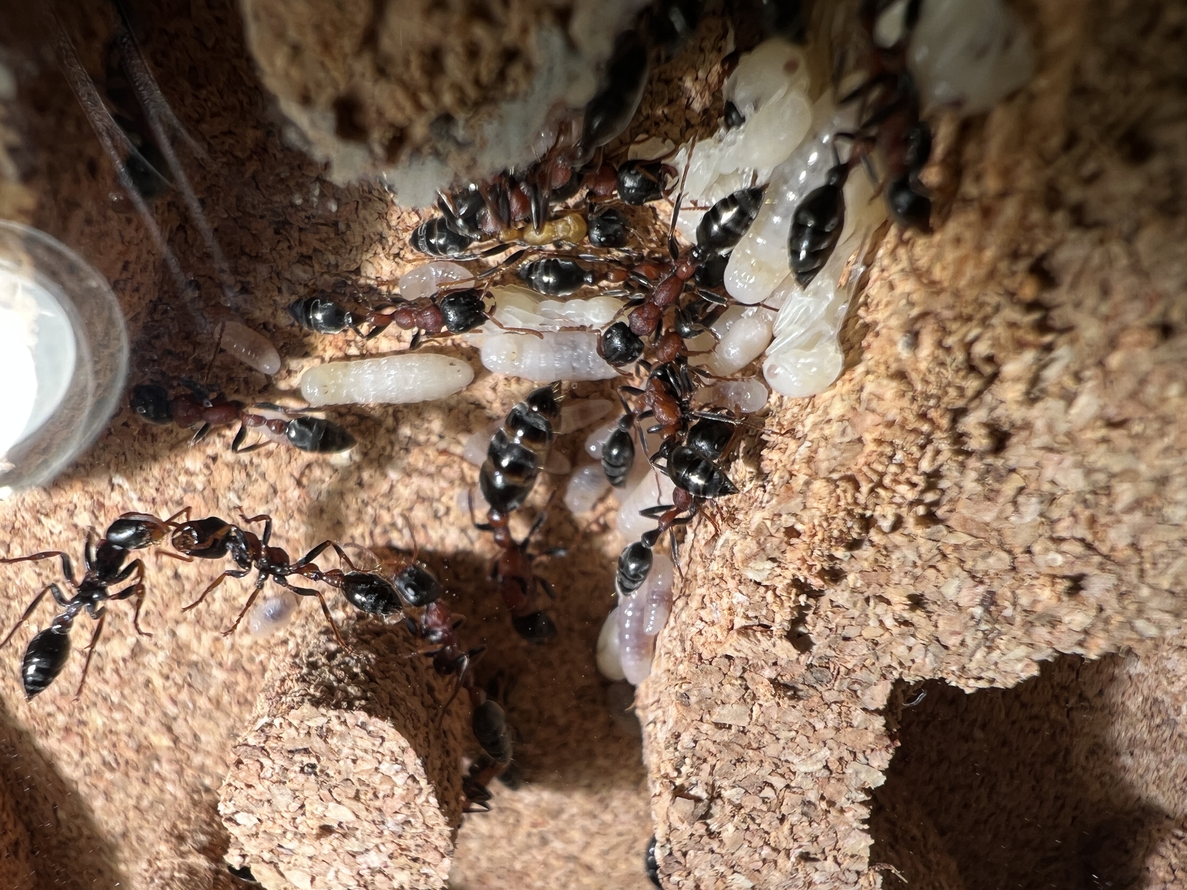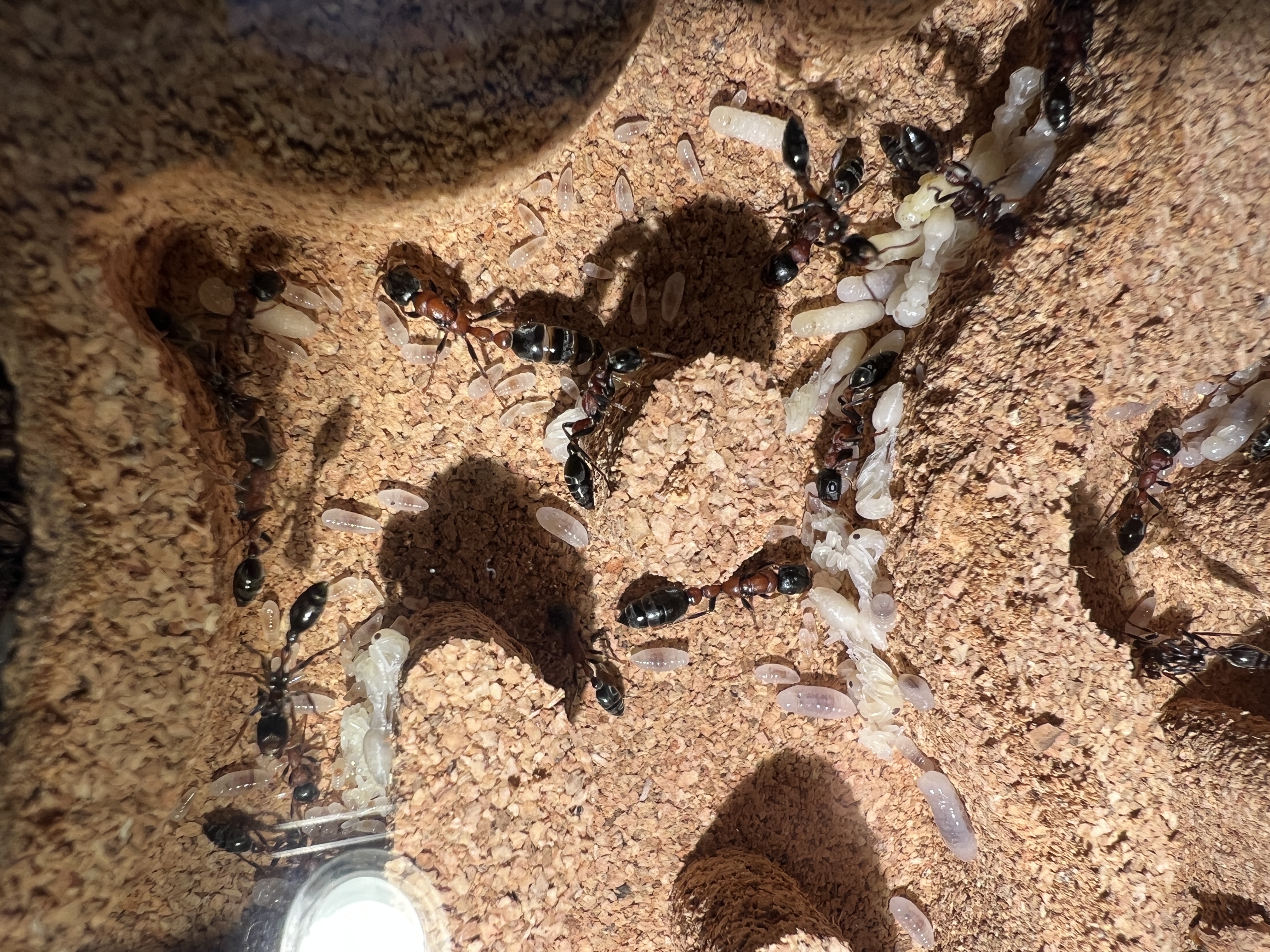 Was mir aufgefallen ist, zu Anfang lagen beide Gynen nebeneinander. Seit ein paar Tagen, haben sich 2 Gruppen gebildet, mit jeweils einer Gyne, aber immer noch im selben Nest.