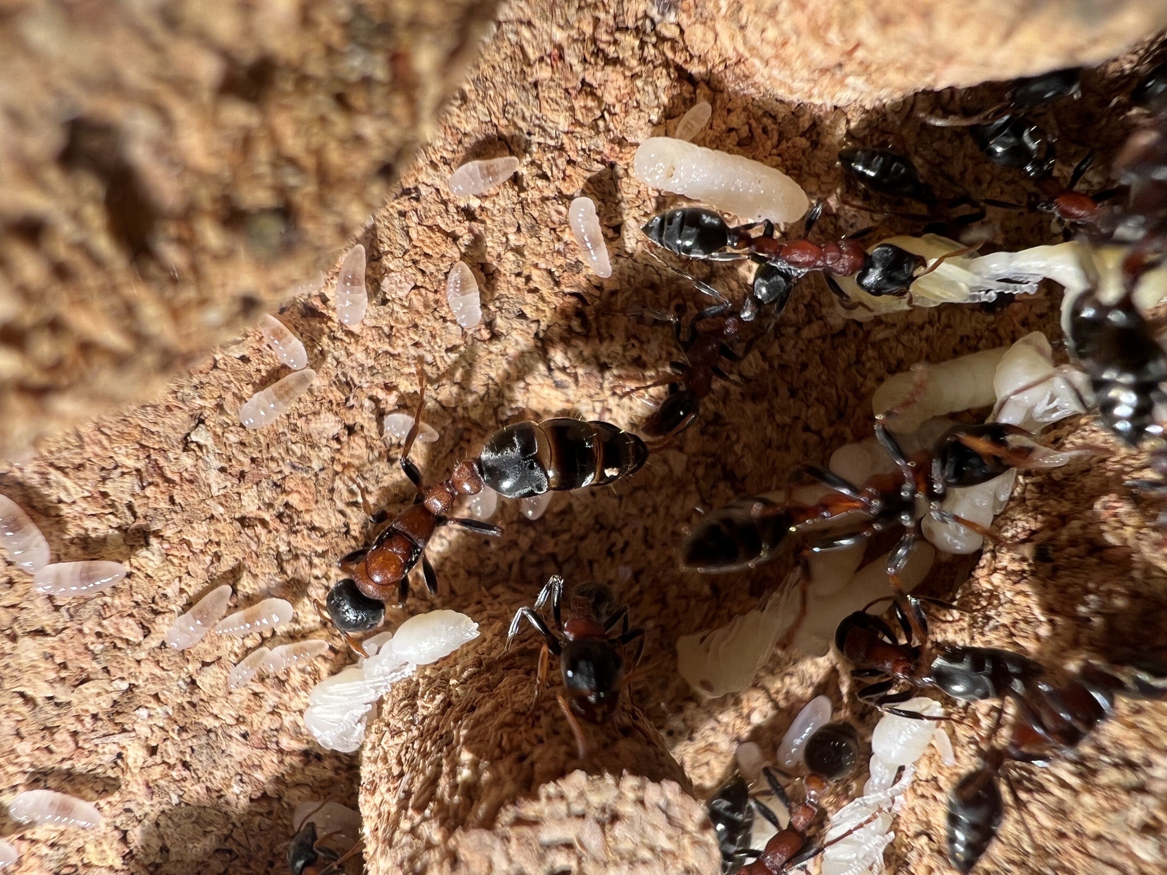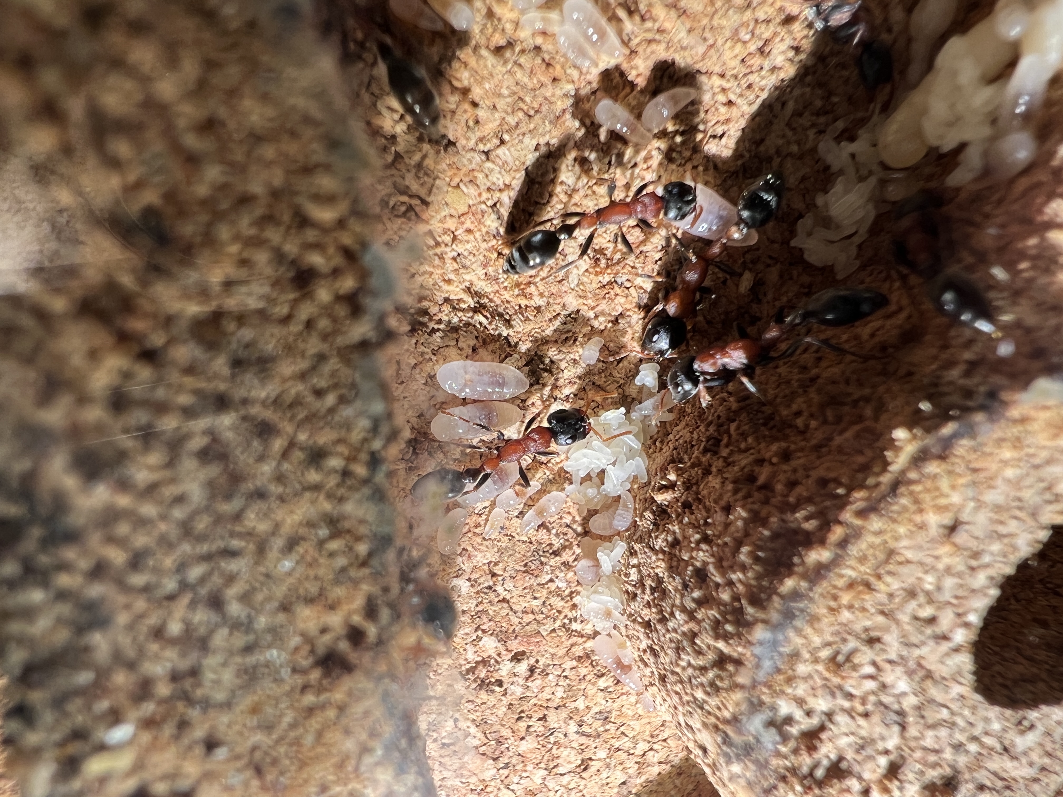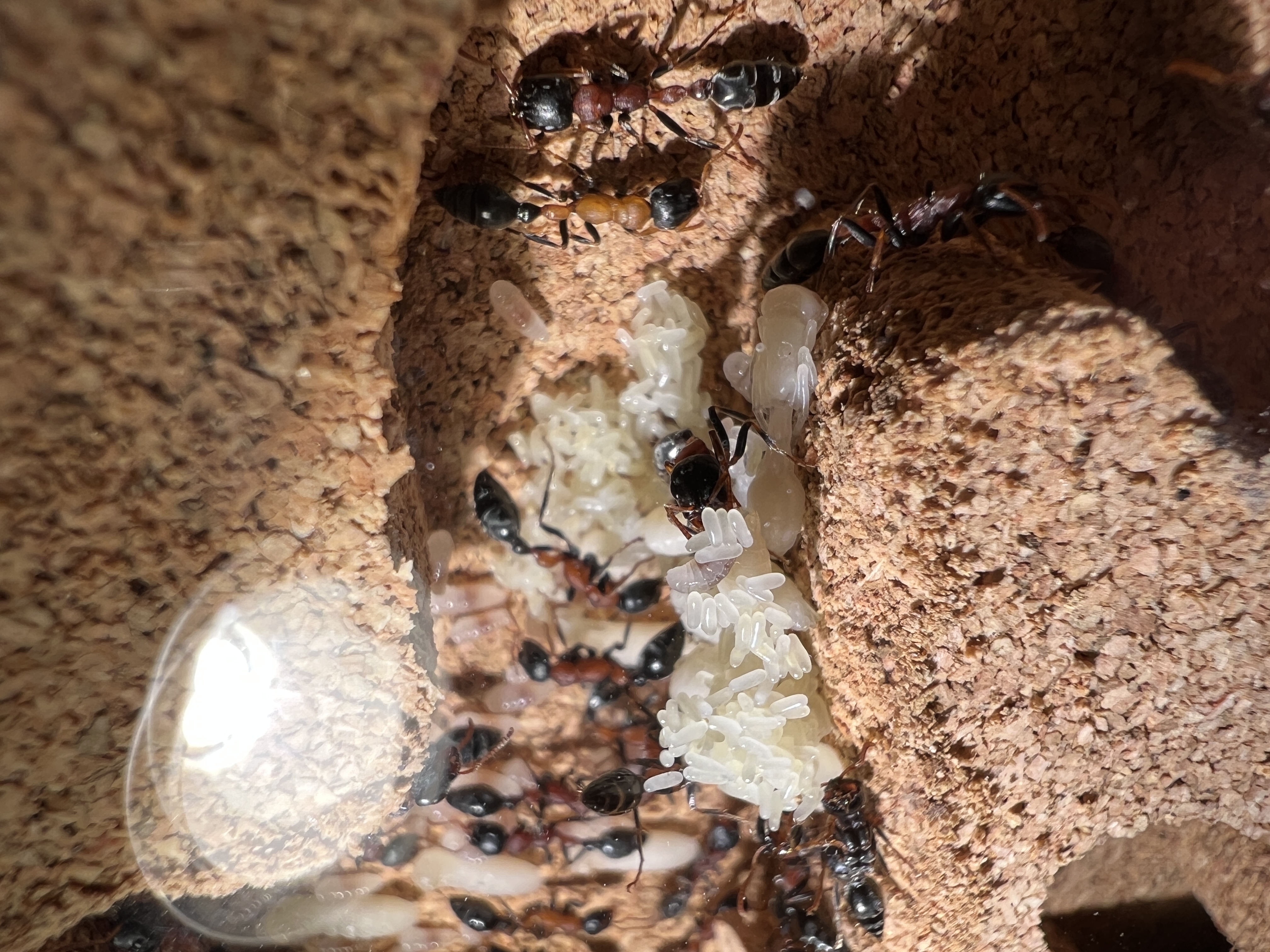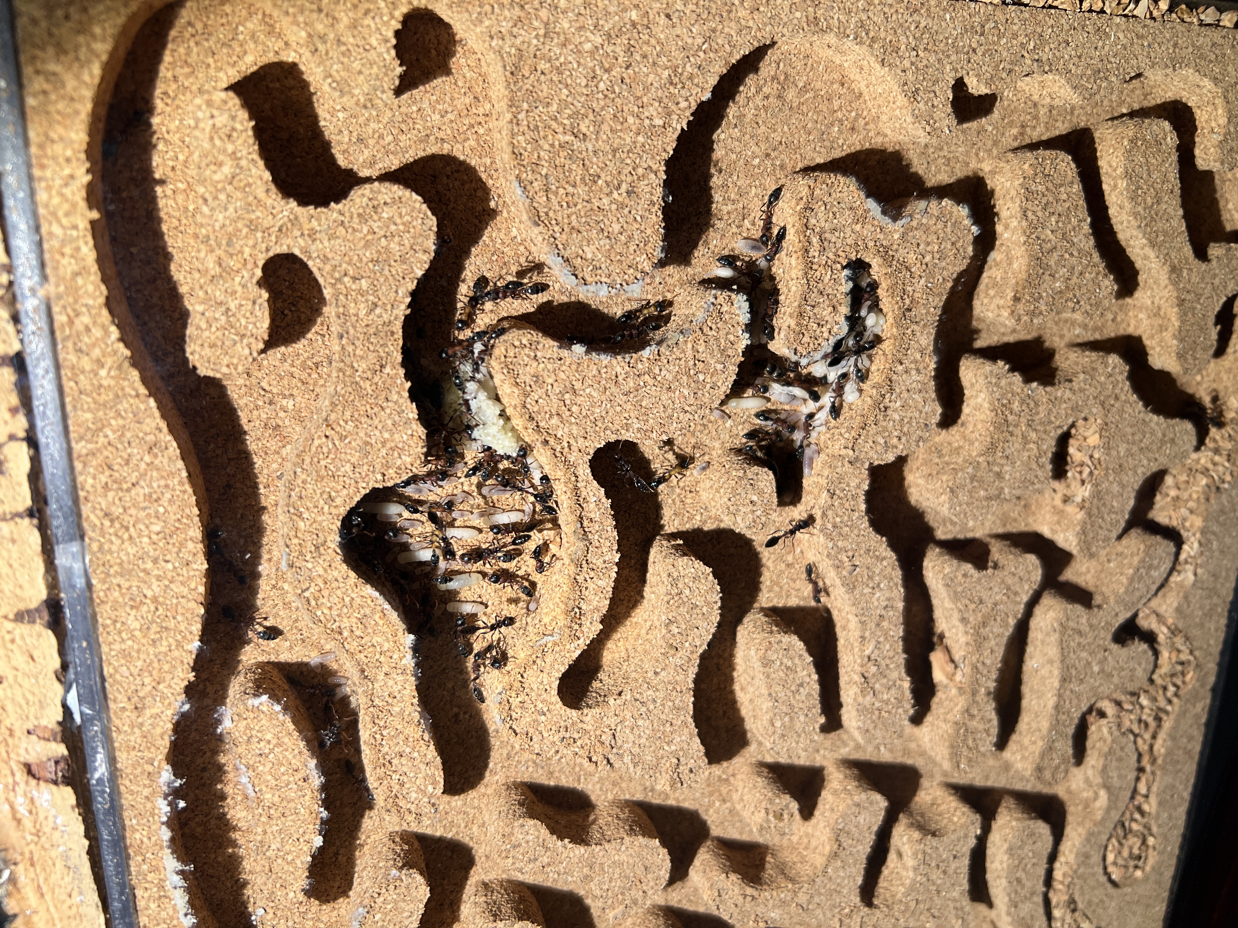 Was mir aufgefallen ist, zu Anfang lagen beide Gynen nebeneinander. Seit ein paar Tagen, haben sich 2 Gruppen gebildet, mit jeweils einer Gyne, aber immer noch im selben Nest.