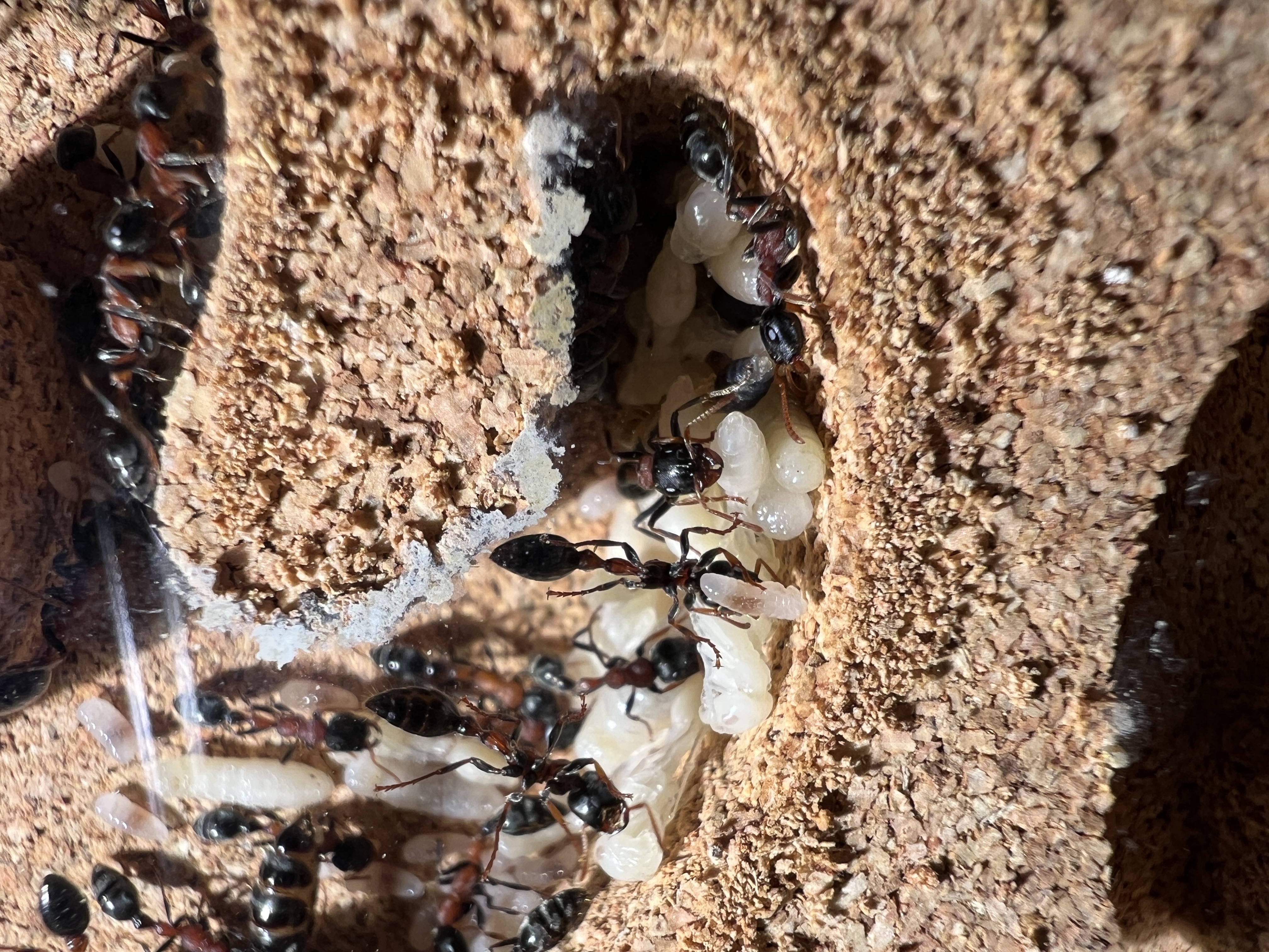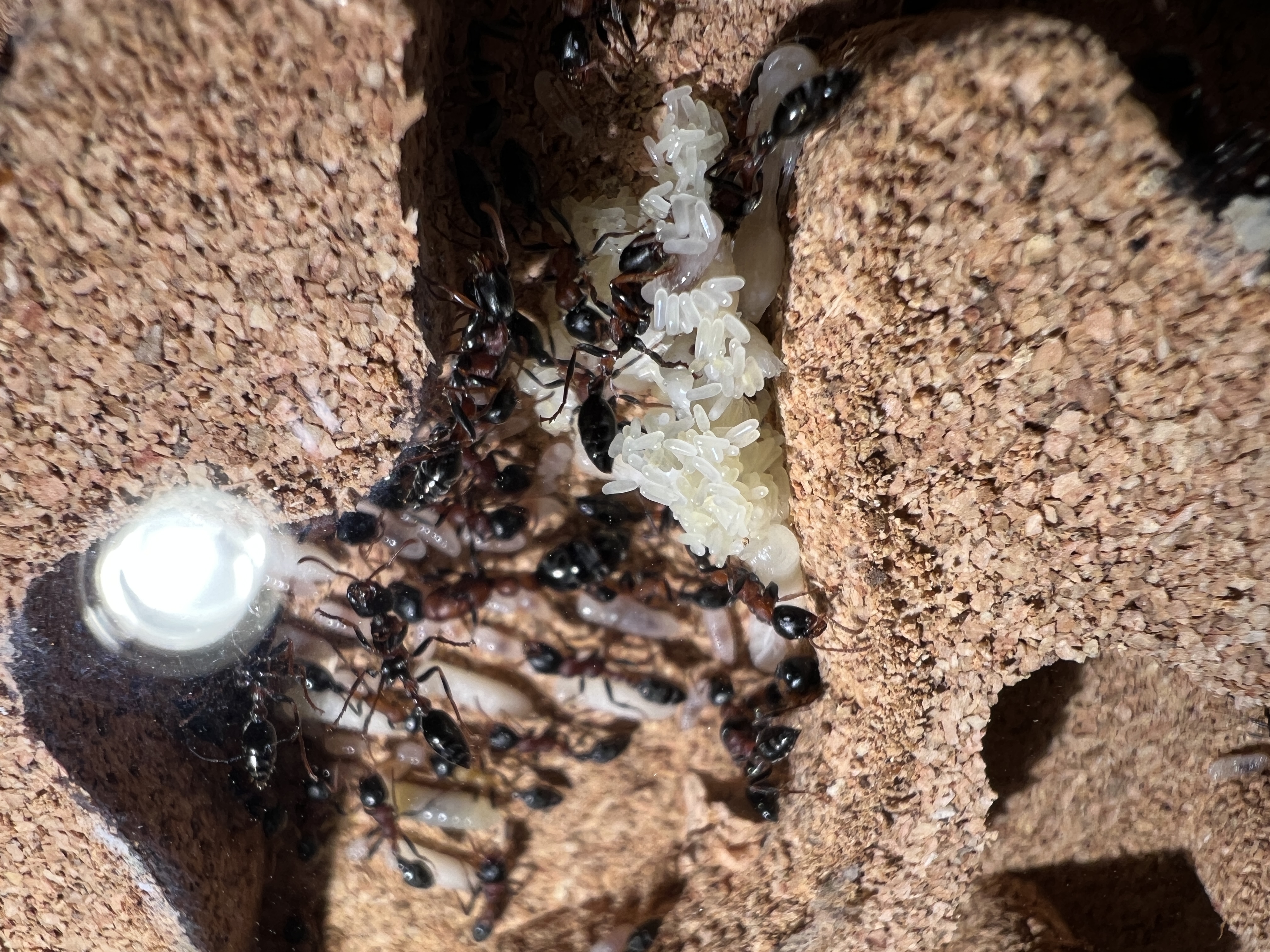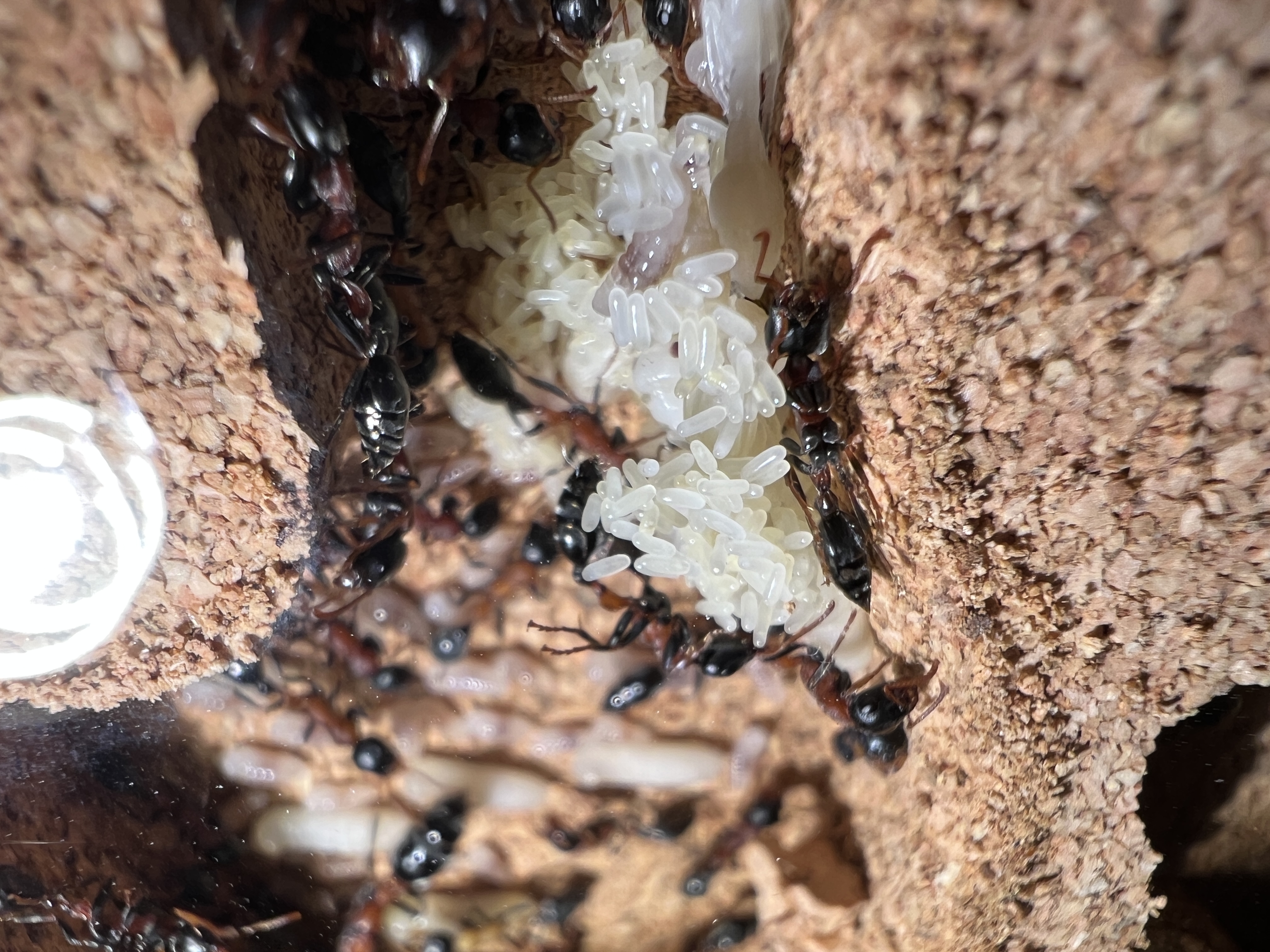 Die Gyne hat mehrfach mit dem Gaster gezuckt. Ich meine, ein Ei zwischen den Mandibeln der Arbneiterin zu sehen.