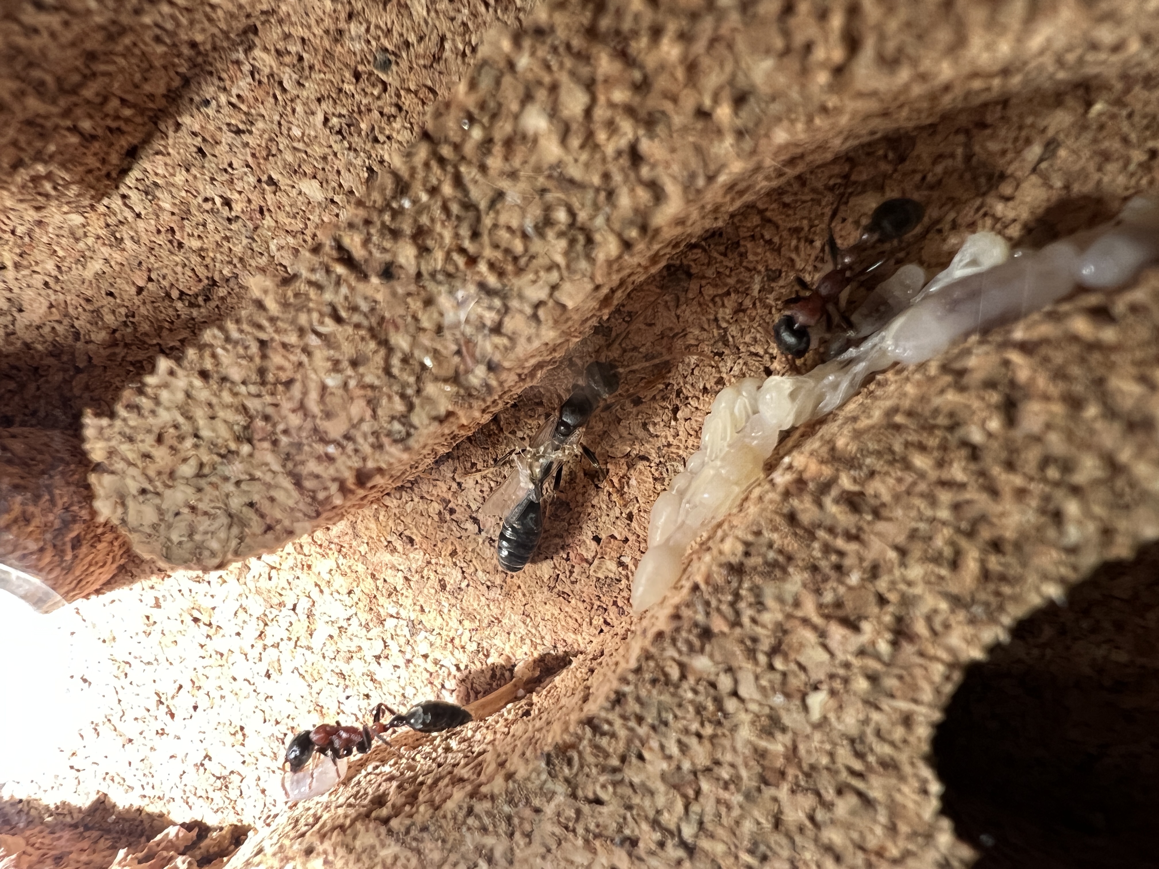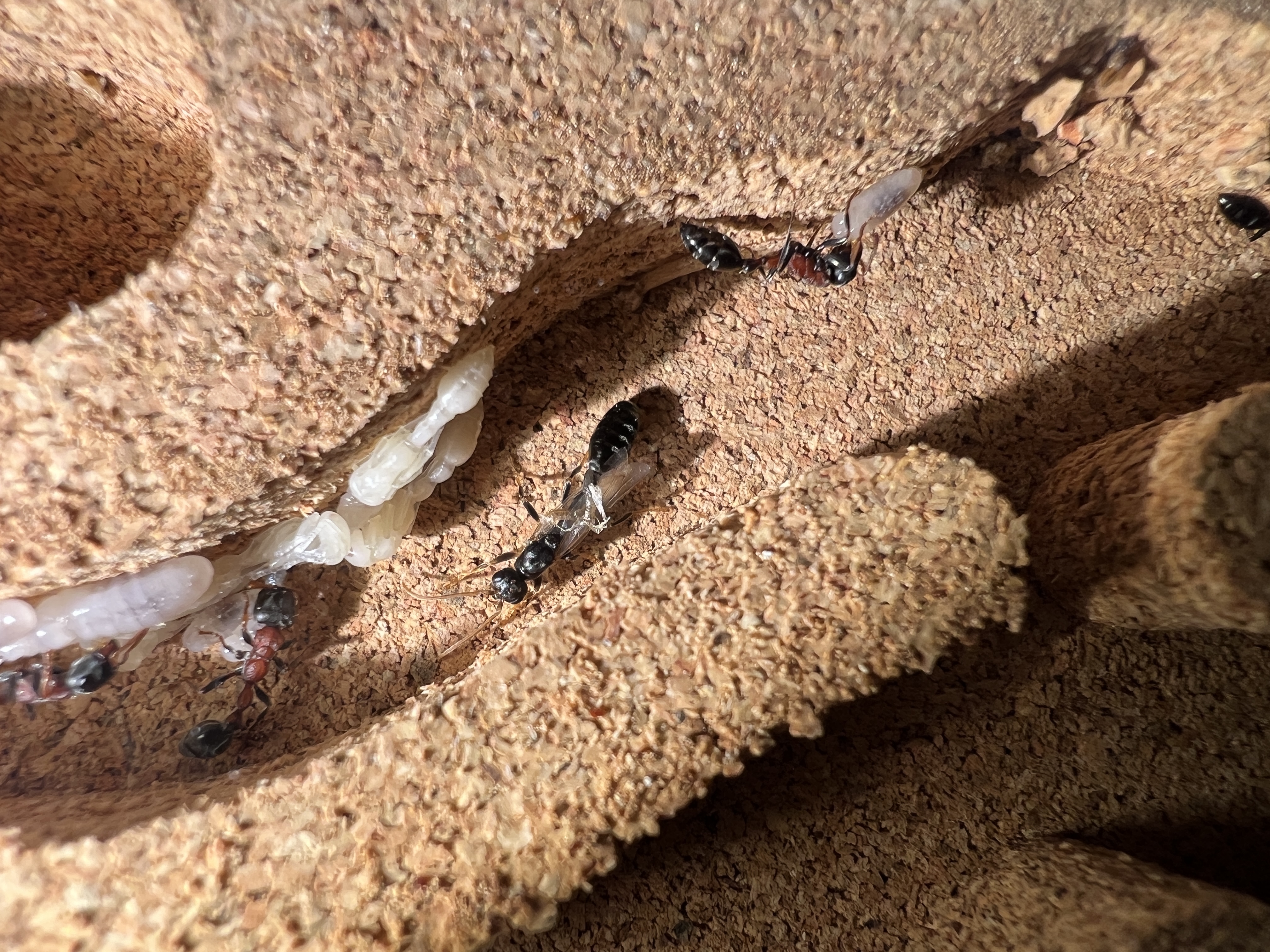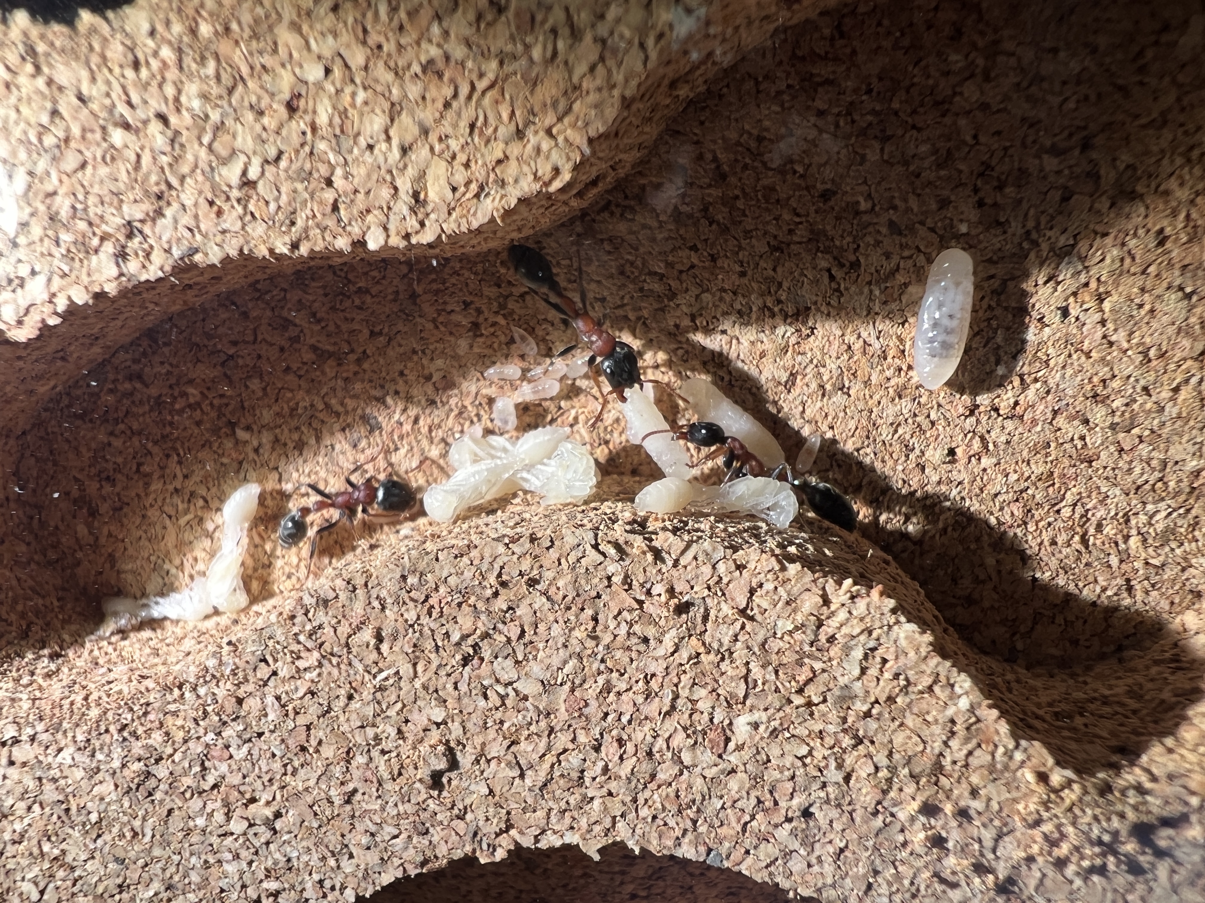 Die Gyne hat mehrfach mit dem Gaster gezuckt. Ich meine, ein Ei zwischen den Mandibeln der Arbneiterin zu sehen.