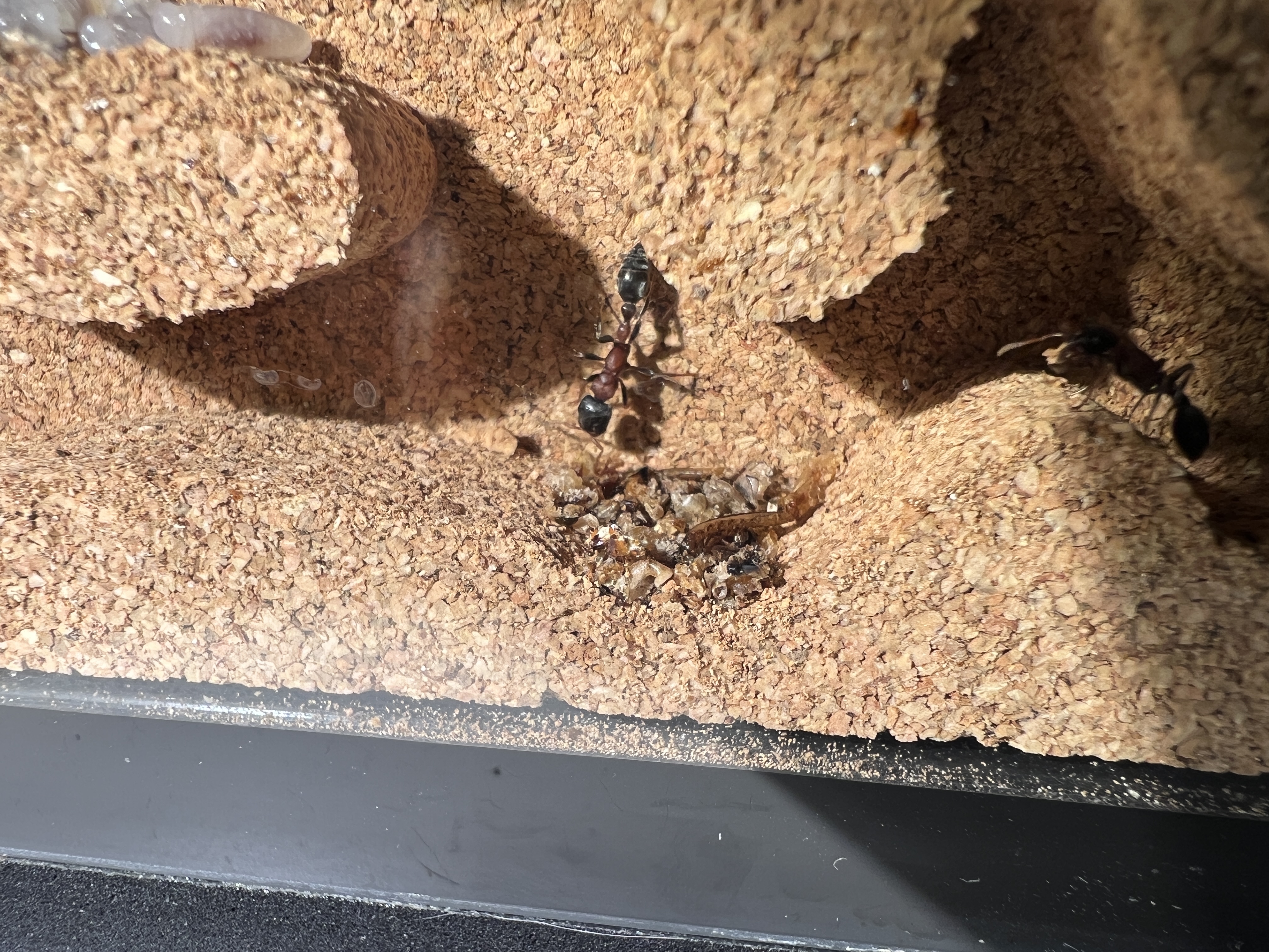 Viel Dreck haben die Tetras aber nicht wirklich hinterlassen, da sie Àhnlich wie meine Crematogaster scutellaris die Beute klein machen und eintragen. Ich konnte mehrfach beobachten, wie Arbeiterinnen die Köpfe von Heimchen in das Nest getragen haben. Schon fast wie in einer Sekte!