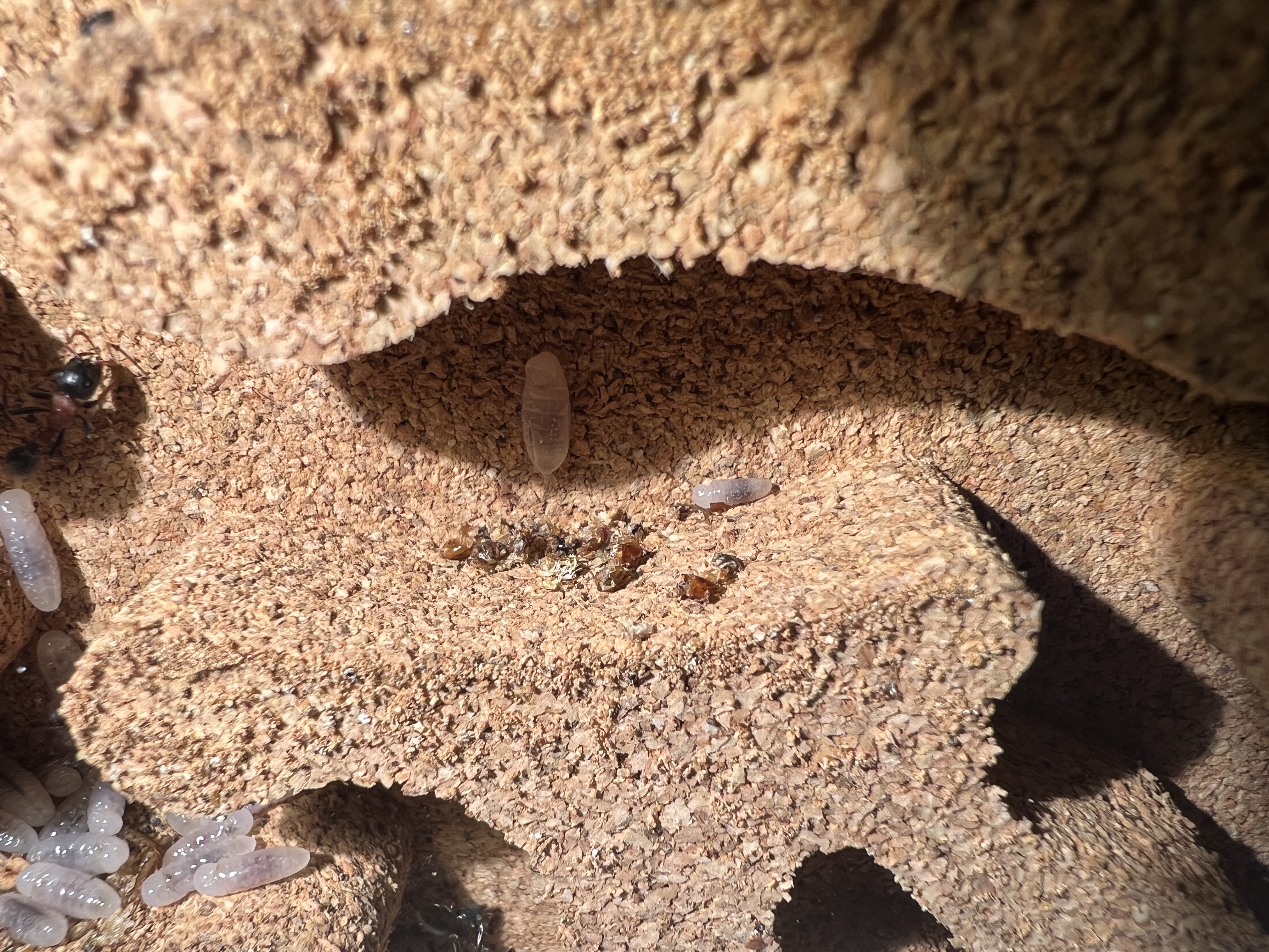 Es kommt leider auf dem Foto nicht ganz rĂŒber, aber das MĂ€nnchen ist ein gutes StĂŒck grĂ¶ĂŸer als die Arbeiterinnen.