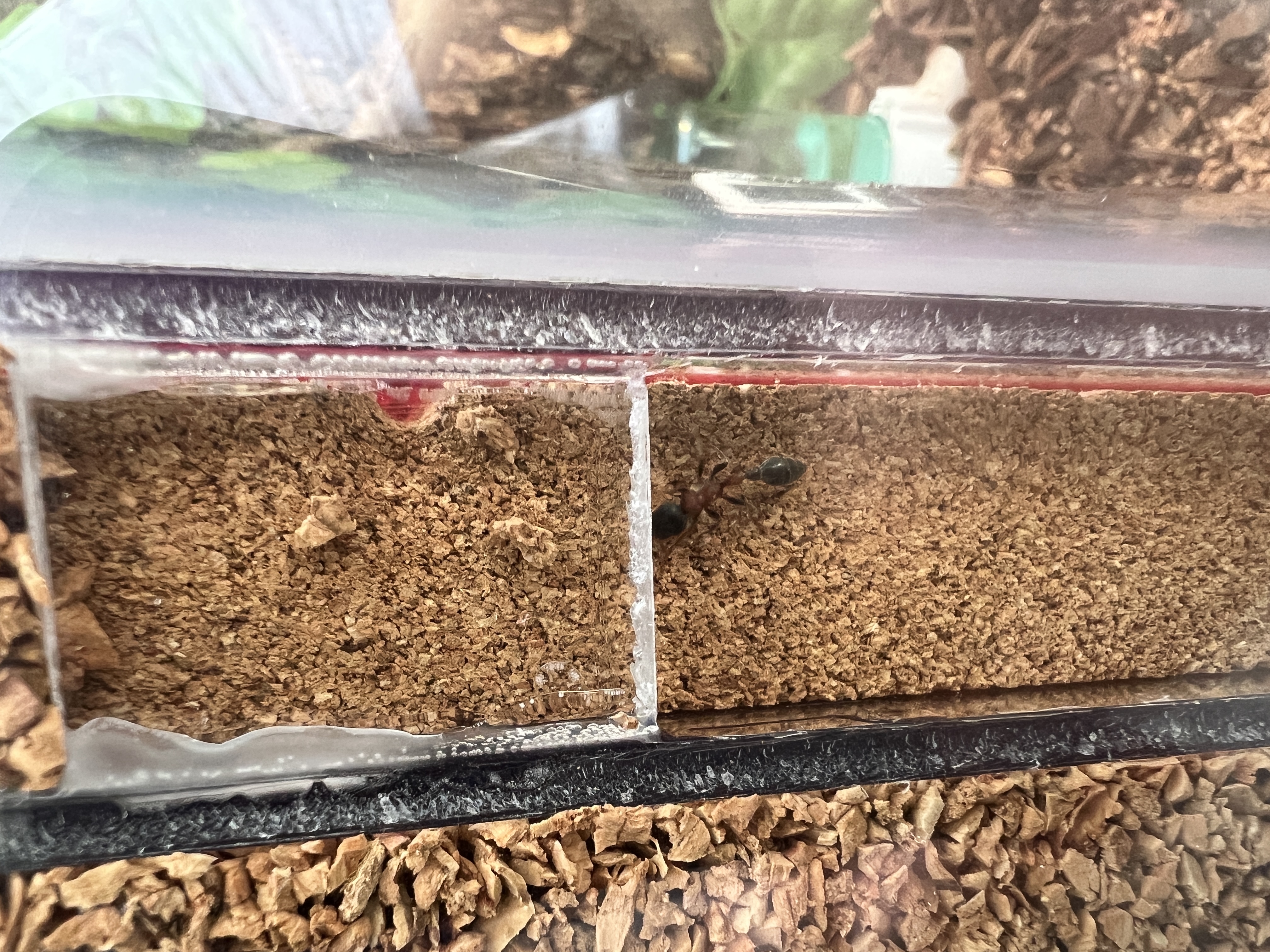Seit ein paar Wochen ist die AussenaktivitĂ€t markant gestiegen man sieht immer wieder 3- 4 Worker beim erkunden und jagen. Mom. fĂŒttere ich die Damen ca alle 3 Tage mit MehlwĂŒrmern und gefangenen Stubenfliegen ca 6 Futterinsekten die dann meistens innert 2 Tagen zerlegt sind. Da meine Kolonie noch klein ist leben sie in einem modifizierten exo terra mit den massen 30x30x45, das end- Terra wird auch ein modifiziertes exo terra sein, aber deutlich grösser 60x45x90.