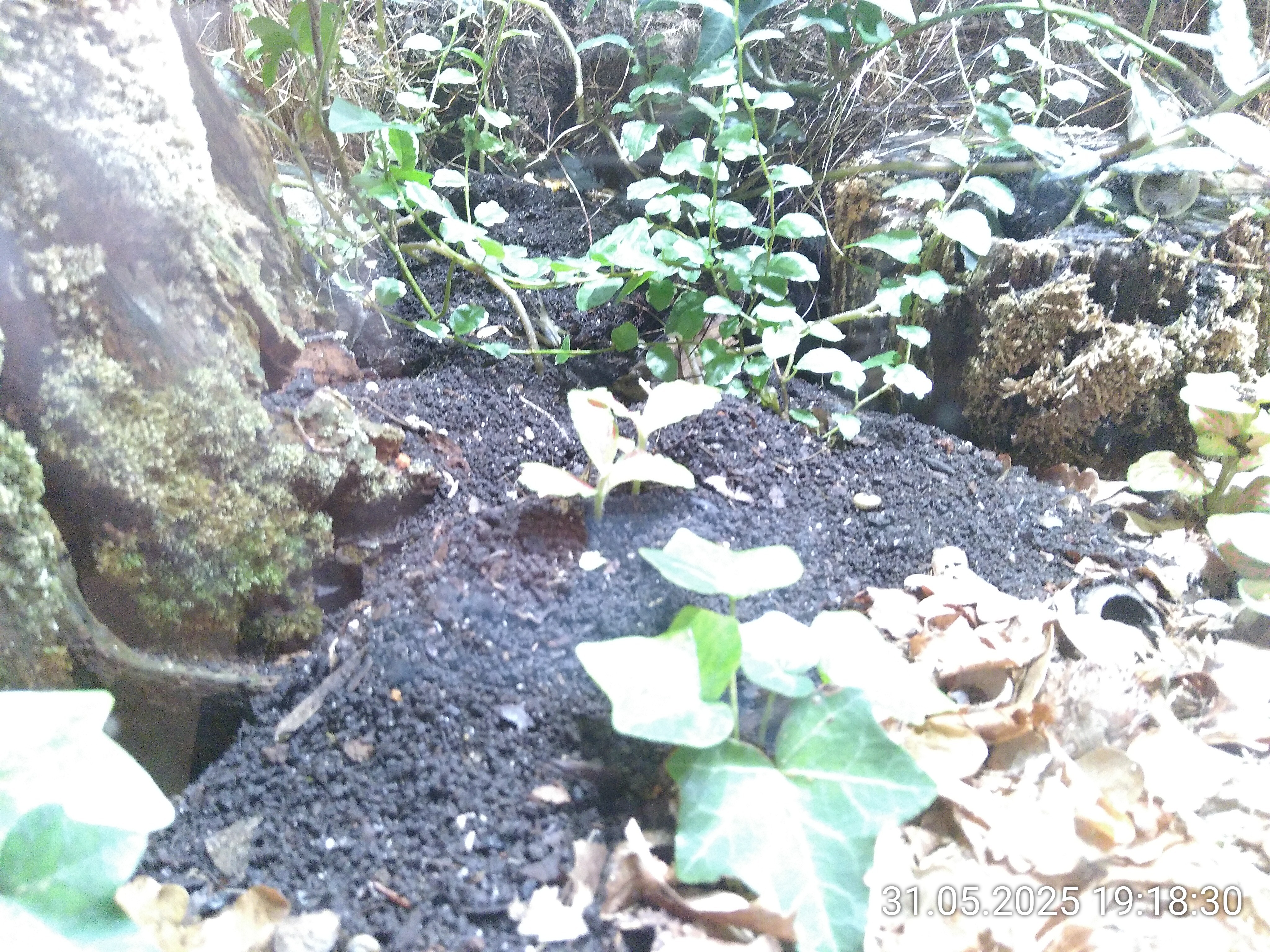 Widmen wir uns kurz ihren Grabungen. Man erahnt sie vor allem wegen der Abraumhalden. Der ganze linke Bereich ist eine, die sich um den Baumstamm herum bis zum Farn zieht. In der rechten Ecke wird auch immer mehr gebuddelt. Der koplette Bereich wird bald mit Erde bedeckt sein. Vor und hinter dem Stamm, bis rüber zum Farn, wo sich beide Halden treffen werden. Mal sehen, ob ich die betroffenen Pflanzen retten kann. Sie müssen schnell wachsen, um nicht verdeckt zu werden.