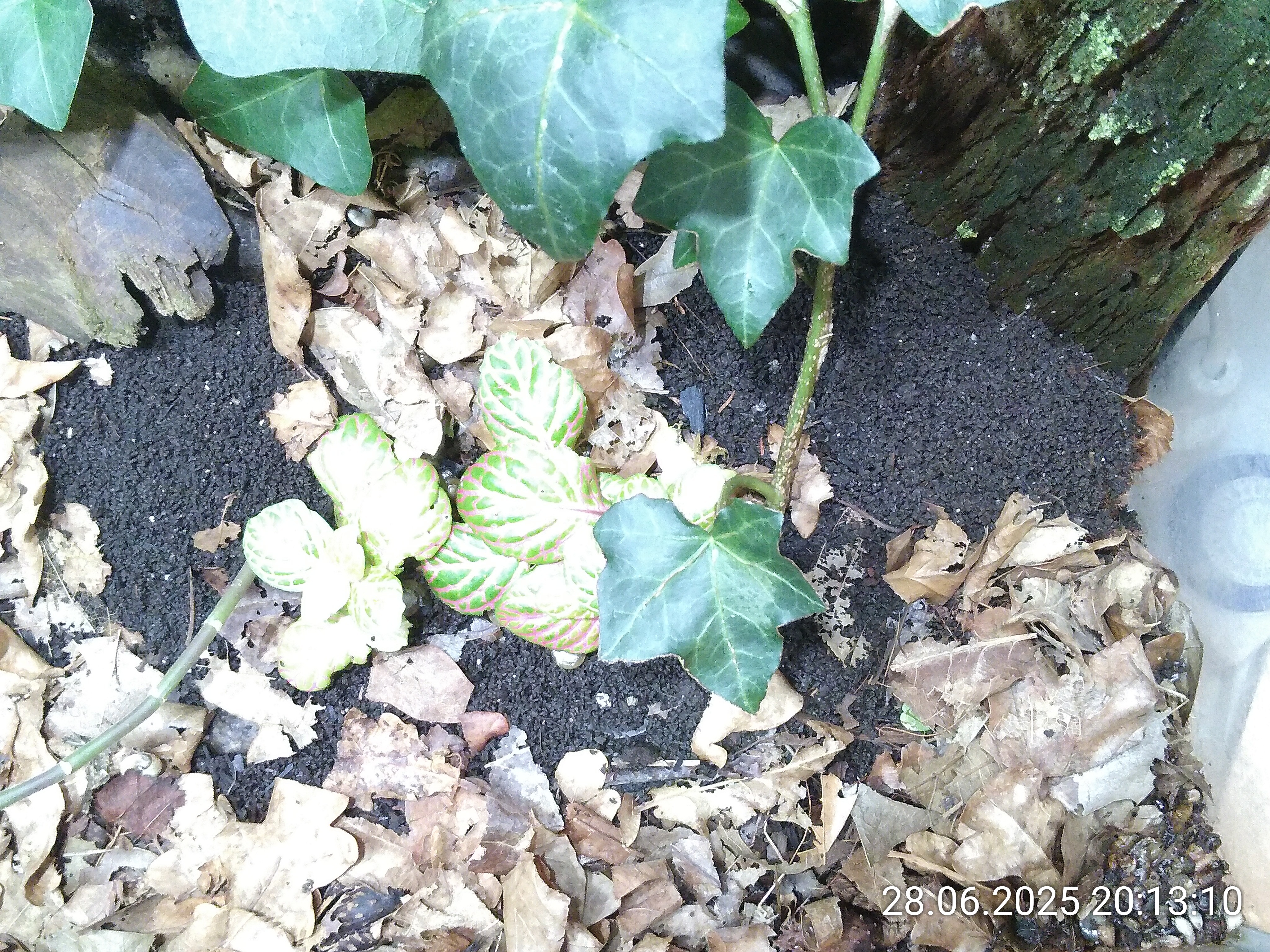 Ich habe also alles auf eine Karte gesetzt und heute auch das Efeu im Becken geimpft. Aber nur die eine Pflanze ganz vorne links vor dem Baumstumpf. Die ist am weitesten von allen anderen isoliert.