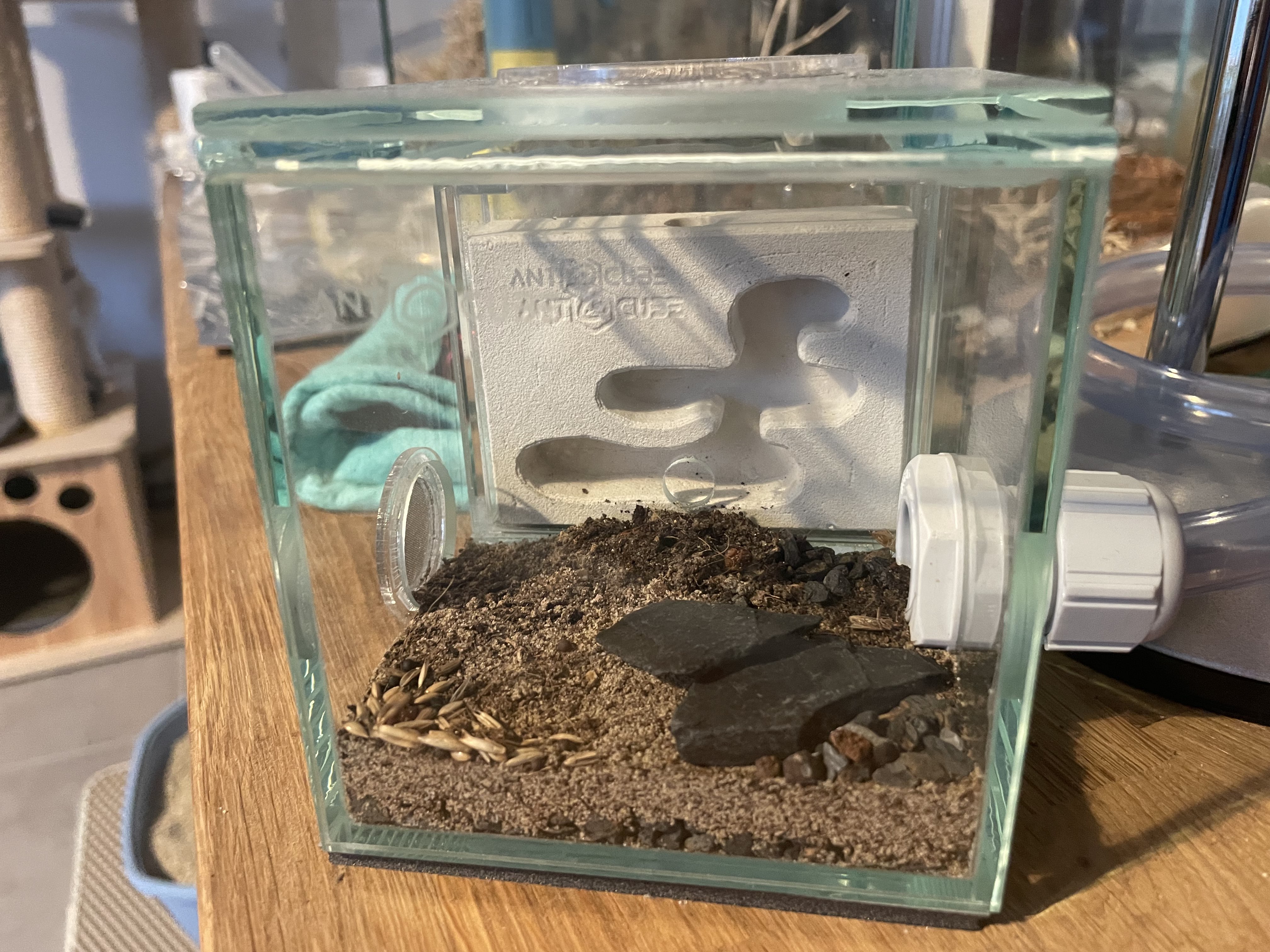 - Geplant ist, dass die Art ein neues Nest bekommt, ich denke an ein Korknest, da die Tiere in der Natur auch Holznester bevorzugen.