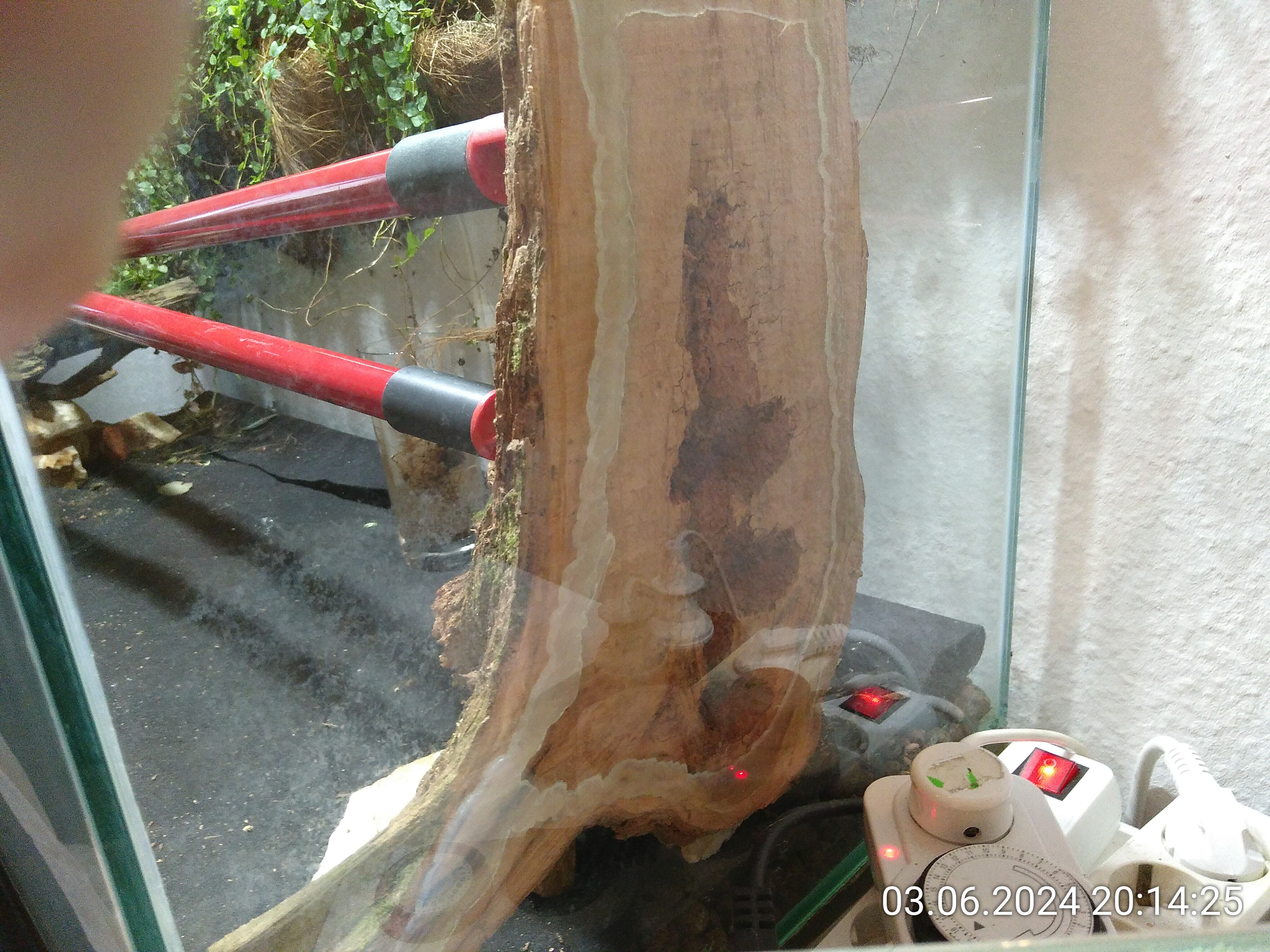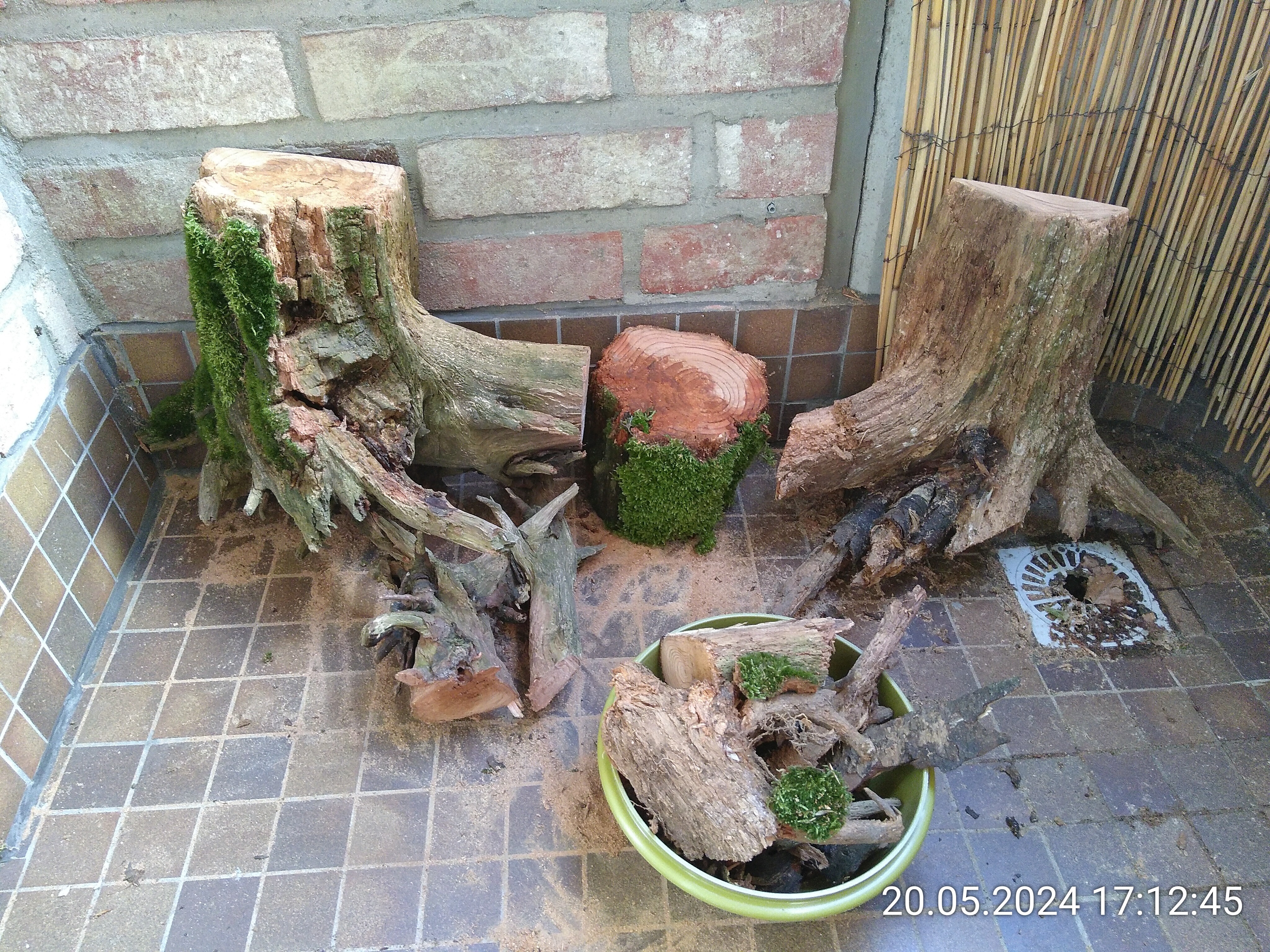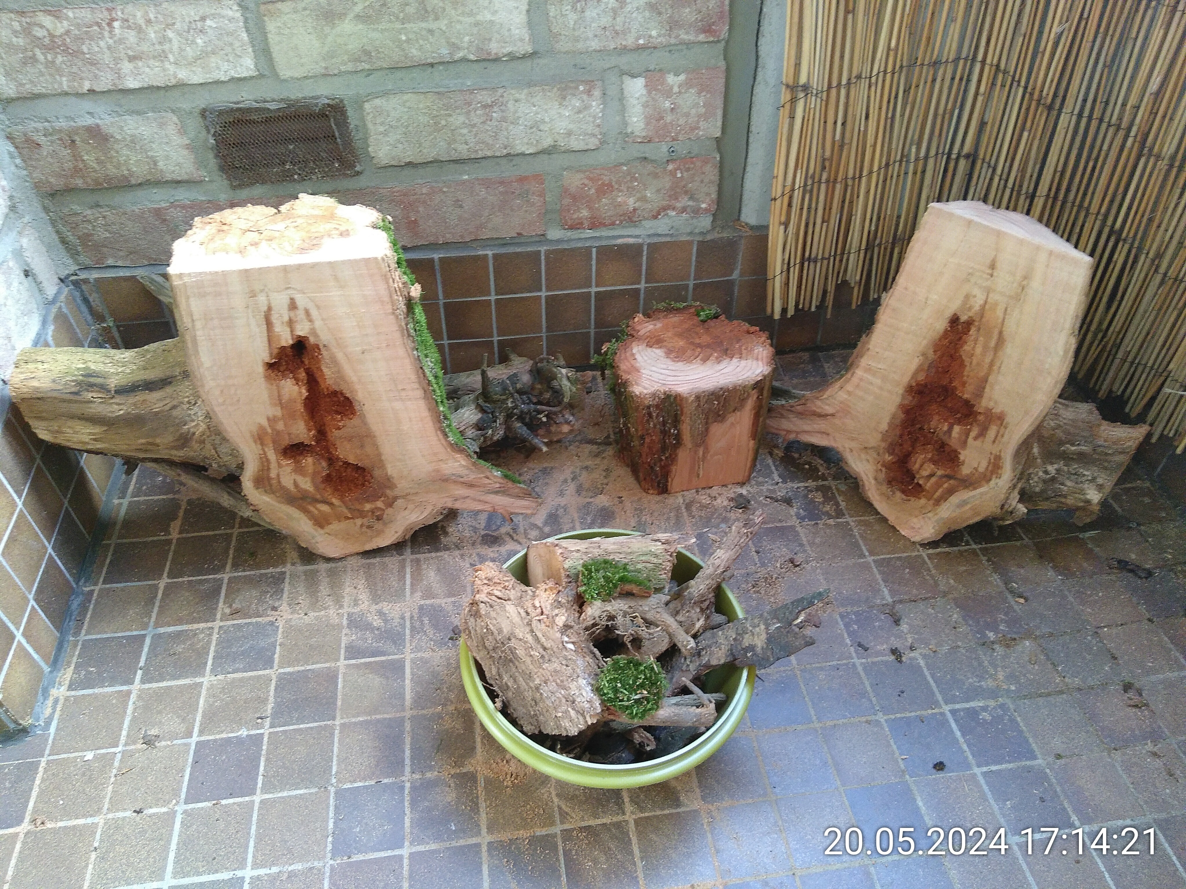 Das Wurzelstück links gehört auch dazu. Zu Hause habe ich dann erstmal ein Stück vom Stamm abgesägt. Das Stück war viel zu hoch. Als nächstes habe ich einen senkrecht Schnitt durch die Wurzel gemacht. Der Plan war, sie an der Scheibe des Beckens festzusilikonieren und so evtl. Nesteinblick zu bekommen. Ob der Stamm aber auch innen morsch war, konnte ich bis dahin nicht wissen. Und dann kam die Erleichterung. Das Außere war festes Holz und der Kern war so morsch, dass ich ihn spontan mit dem Finger rauspulen konnte. Dann habe ich ein bisschen mit Werkzeug nachgeholfen und die Nester waren fertig.