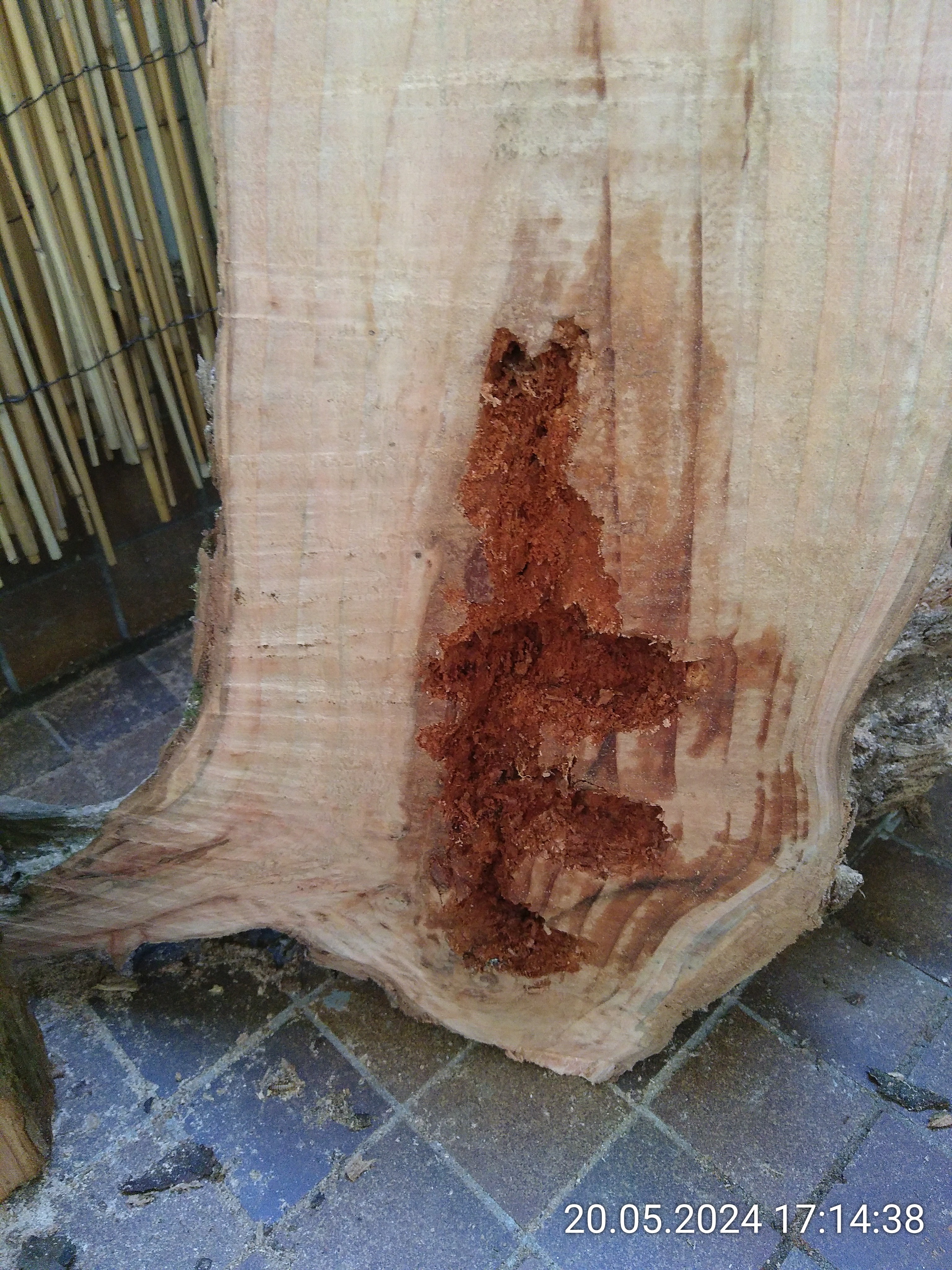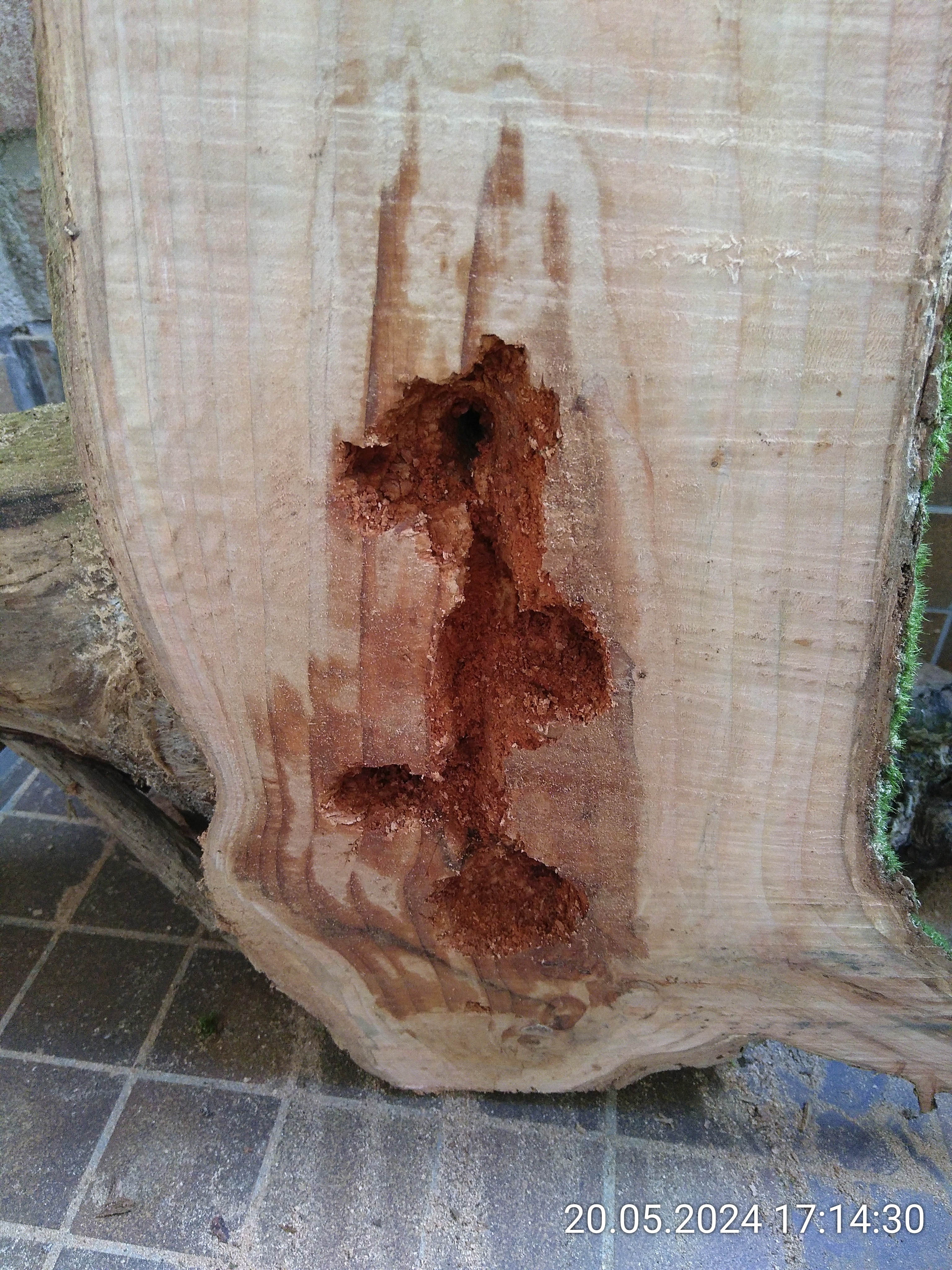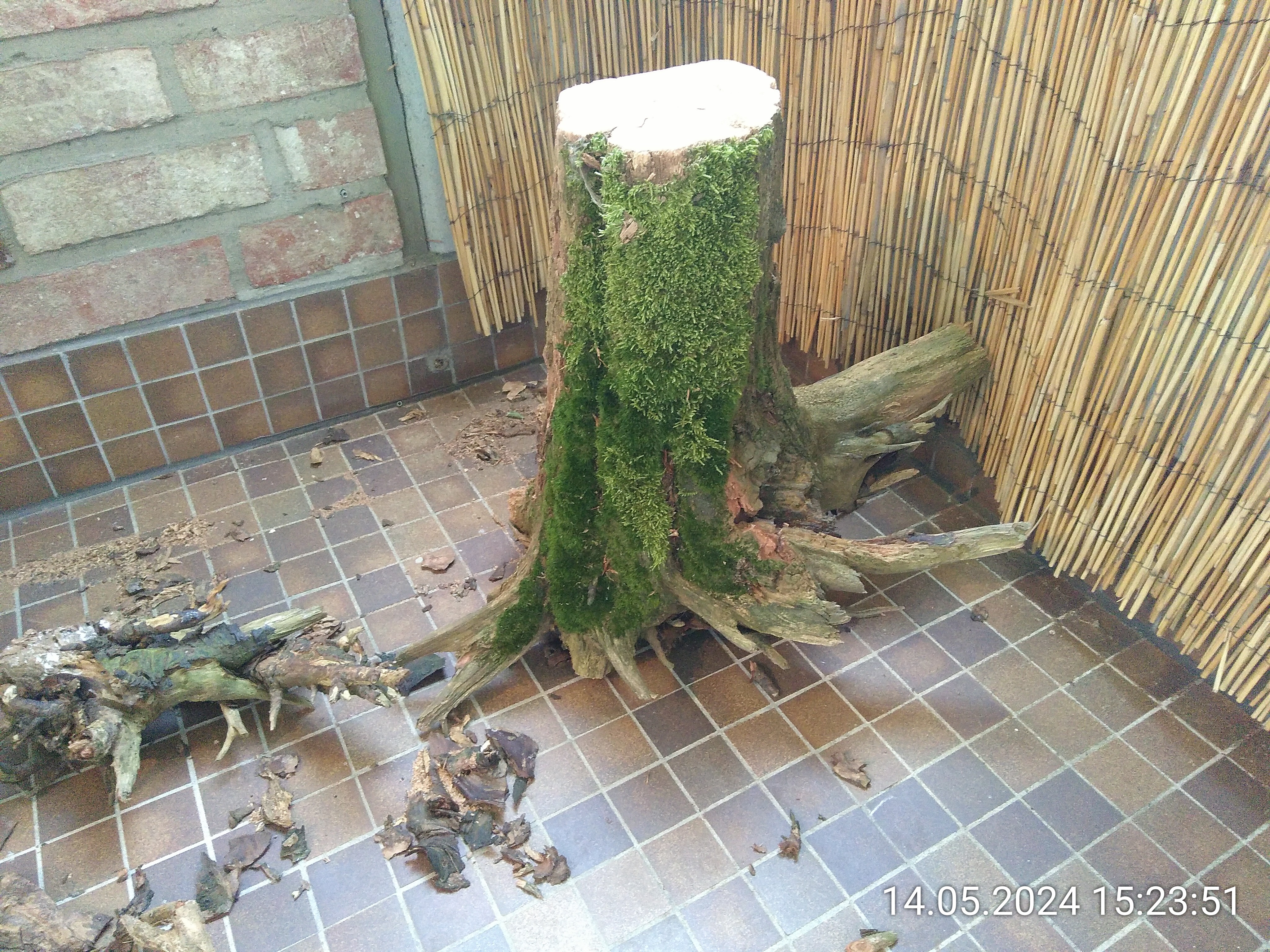 Das Wurzelstück links gehört auch dazu. Zu Hause habe ich dann erstmal ein Stück vom Stamm abgesägt. Das Stück war viel zu hoch. Als nächstes habe ich einen senkrecht Schnitt durch die Wurzel gemacht. Der Plan war, sie an der Scheibe des Beckens festzusilikonieren und so evtl. Nesteinblick zu bekommen. Ob der Stamm aber auch innen morsch war, konnte ich bis dahin nicht wissen. Und dann kam die Erleichterung. Das Außere war festes Holz und der Kern war so morsch, dass ich ihn spontan mit dem Finger rauspulen konnte. Dann habe ich ein bisschen mit Werkzeug nachgeholfen und die Nester waren fertig.