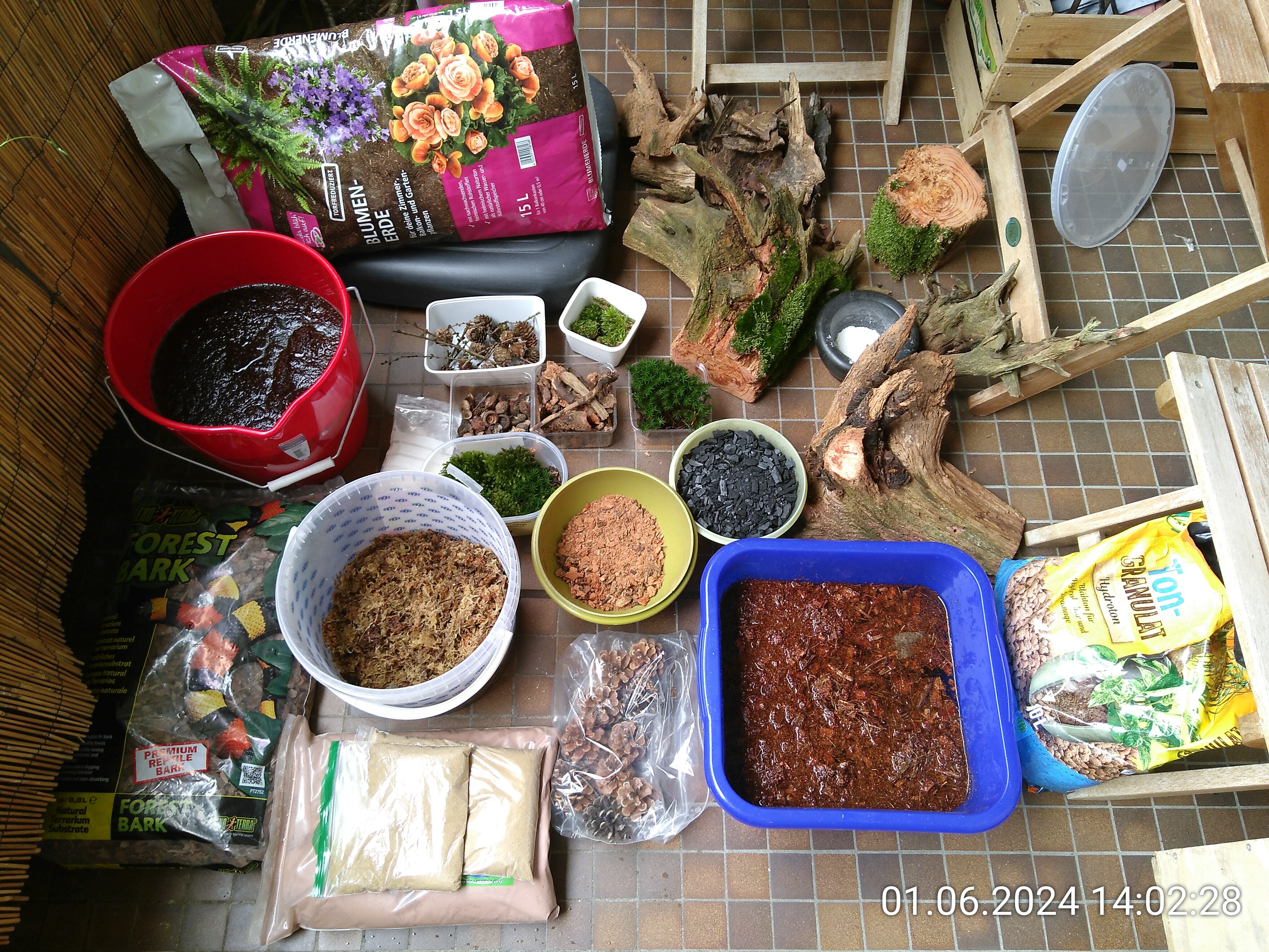 Zuerst habe ich mir eine ausreichende Menge Substrat angemischt. Hier seht ihr die meisten Zutaten. Was ihr nicht seht, ist zu dem Zeitpunkt noch im Dschungel: Erde, Laub, Asseln, Pflanzen und die Rückwand. Ich habe mir nur zwei Pflanzen zusätzlich gekauft und ansonsten auf Recycling gesetzt.