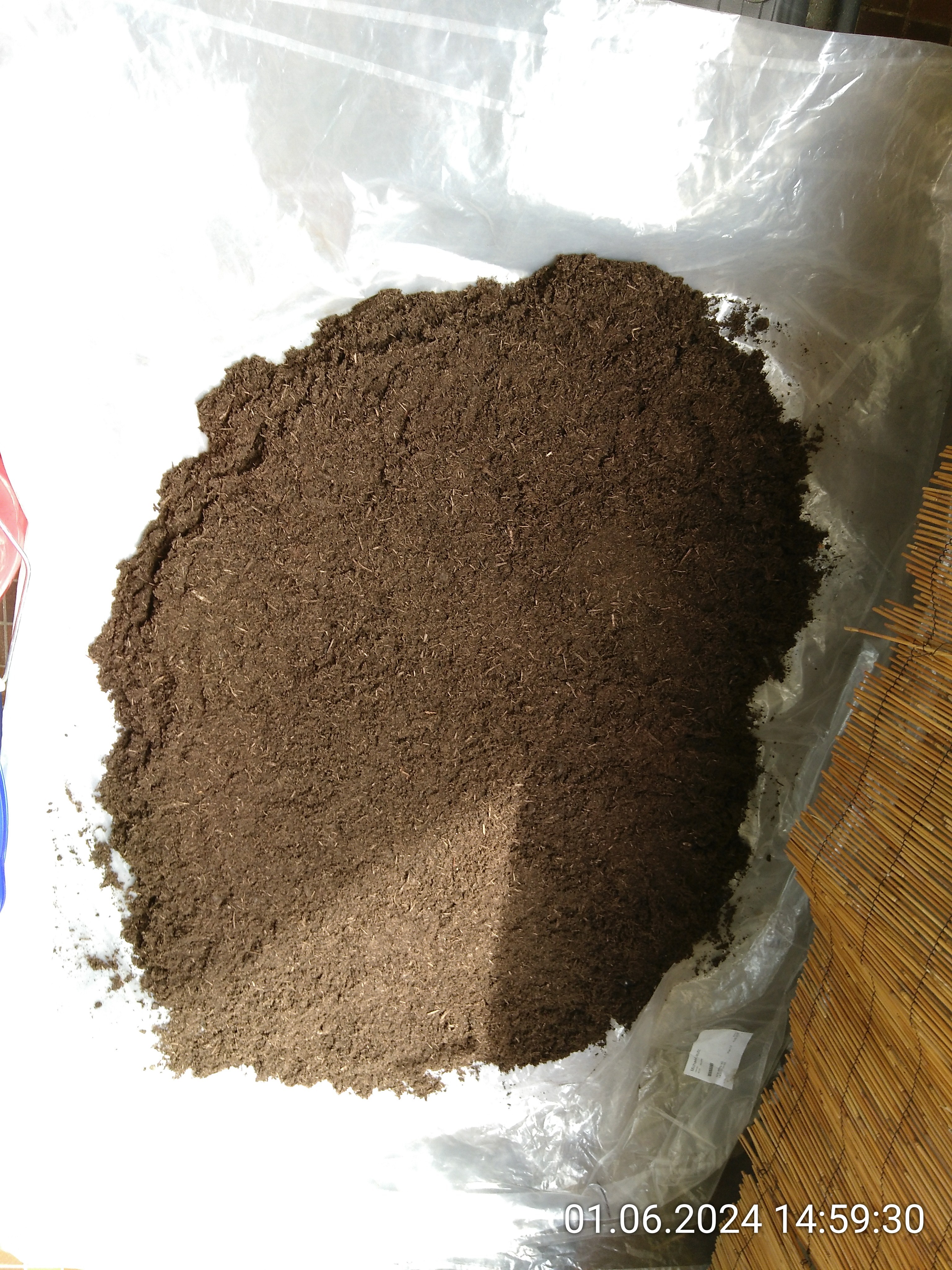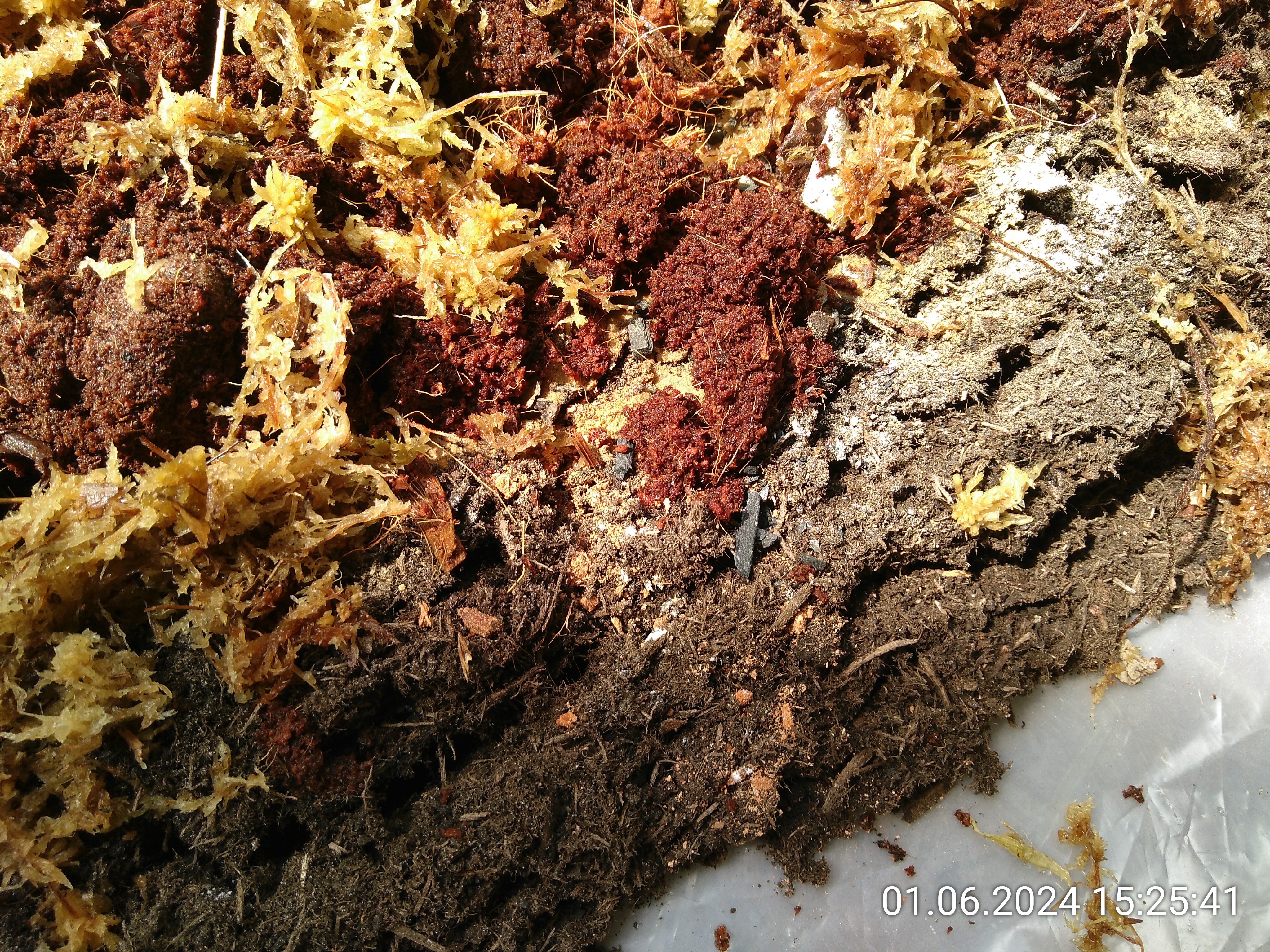 Basis ist ein Sack normaler Blumenerde. Dann kamen ein bisschen Lehm für Stabilität bei Grabarbeiten, Sphagnum Moss, Kokosfasern grob und fein für eine Auflockerung des Bodens, gemahlene Sepiaschale als Kalkquelle für die Asseln, Kohle zum Absorbieren von Schadstoffen und das oben angesprochene Sägemehl dazu. Alles kam auf eine große Plane und wurde dann schön durchgemischt. Wenn man dafür nur die Plane abwechselnd an den Seiten anhebt, macht man sich nicht mal die Hände schmutzig