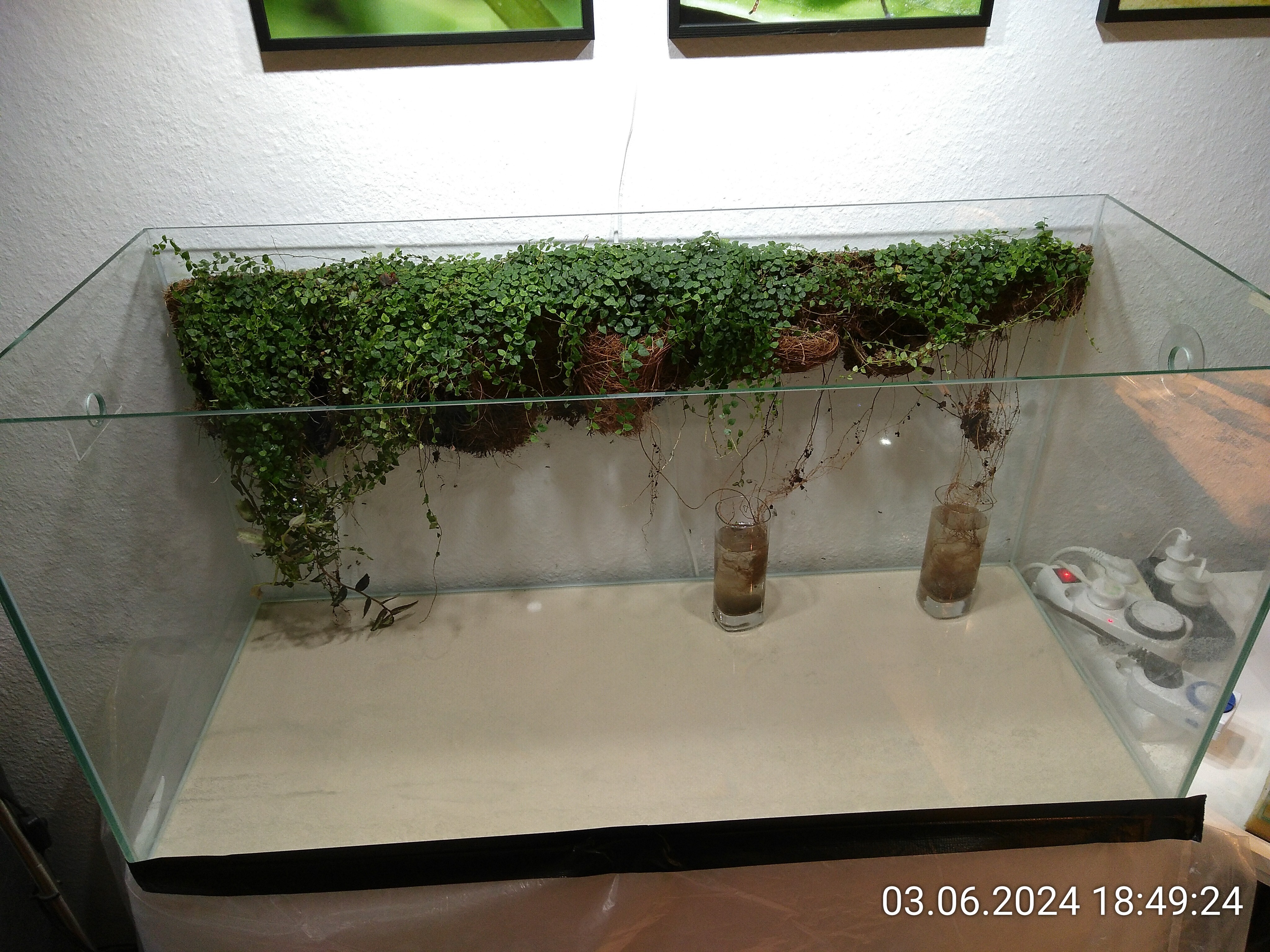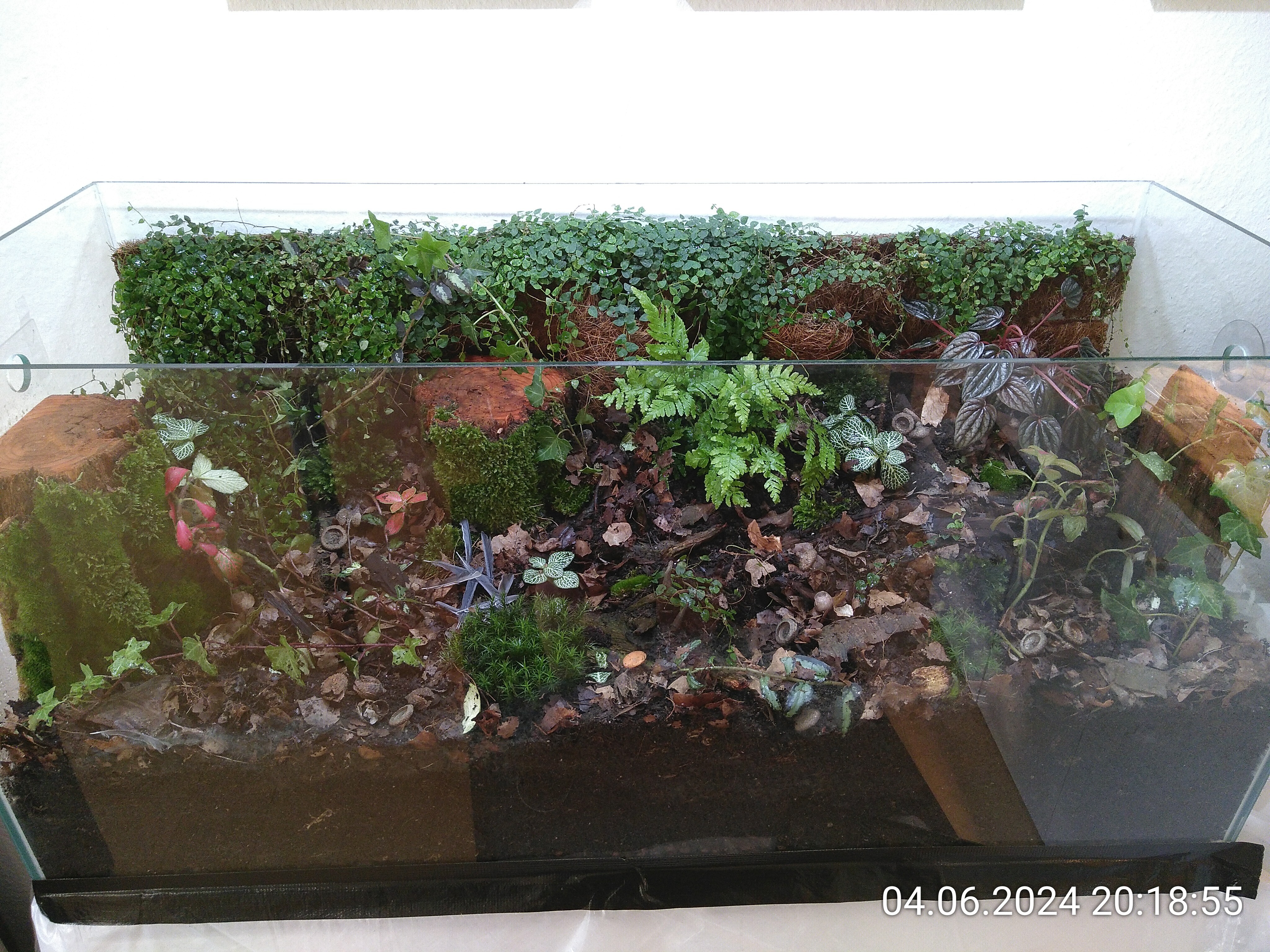 Damit hatte ich erstmal Pause. Eigentlich konnte es erst am nächsten Tag weitergehen, wenn das Silikon ausgehärtet war. Aber da waren ja noch die Wurzeln von der Ranke an der Rückwand. Die wollte ich so schnell wie möglich wieder in Erde bringen. Nach einer halben Stunde waren die Kokosmatten ausreichend fest, um an der Rückwand ein bisschen Erde aufhäufen zu können und so zumindest die Wurzeln zu bedecken.